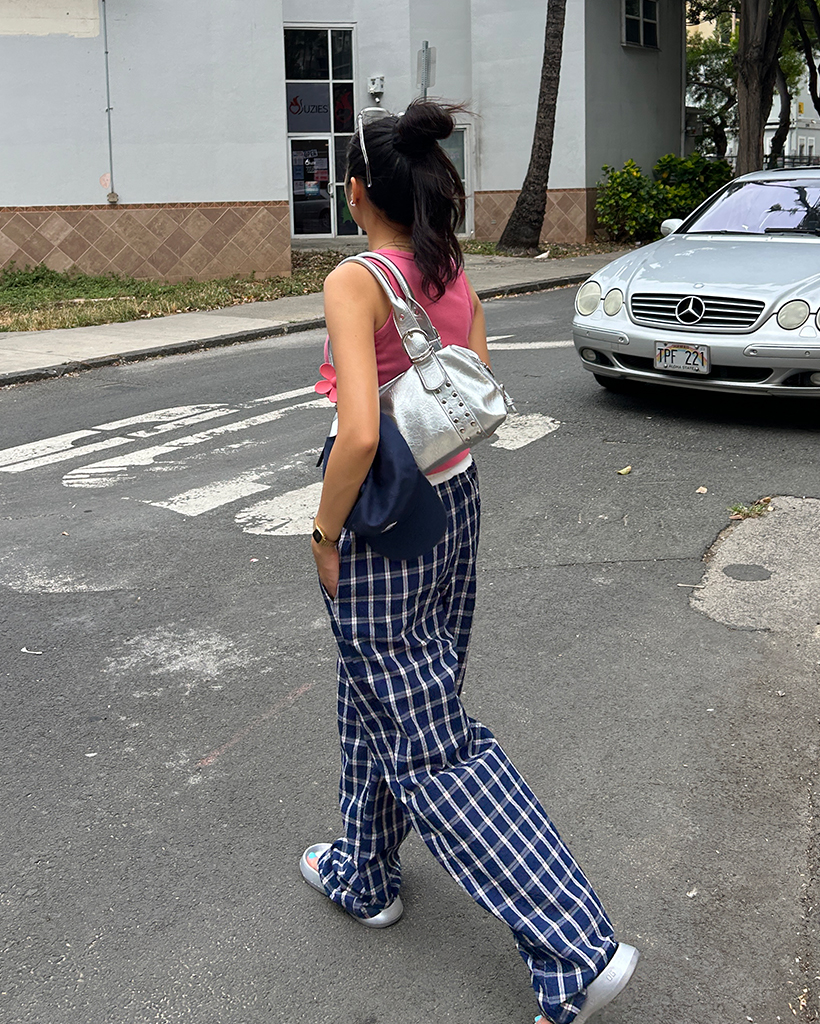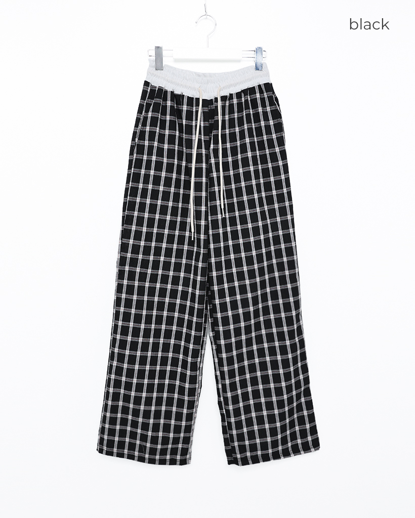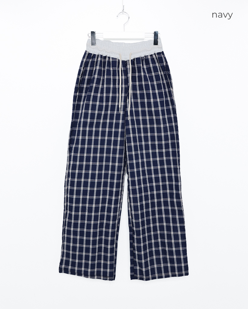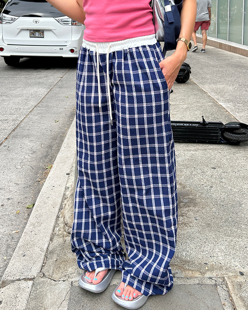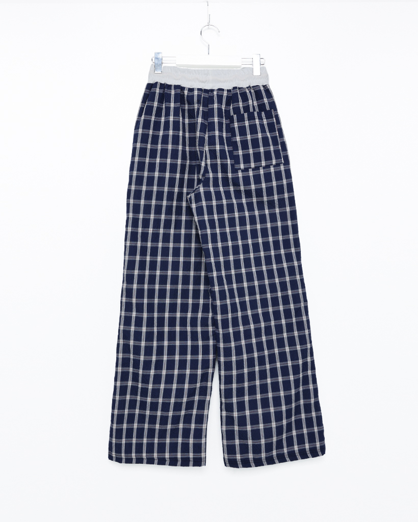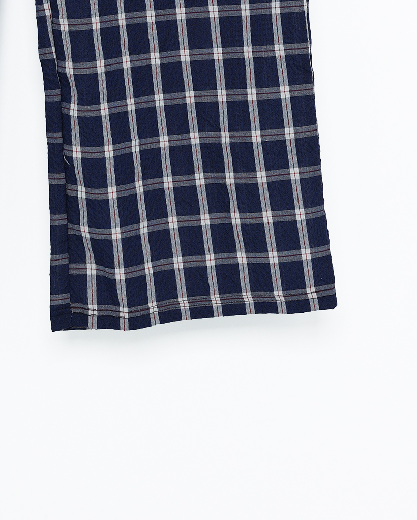ウエストバイカラーチェックシアサッカーワイドパンツ