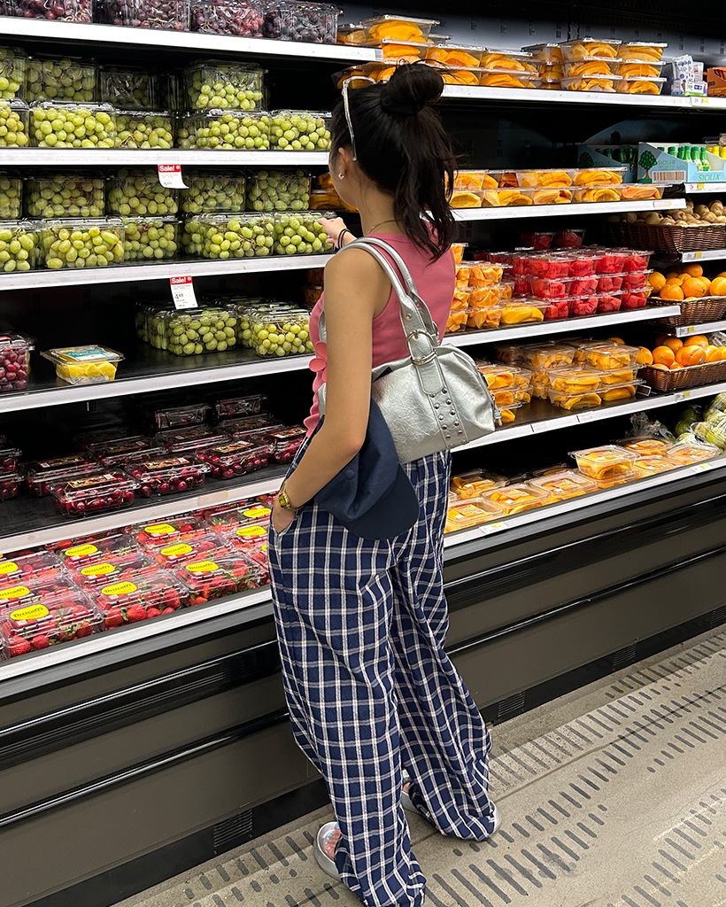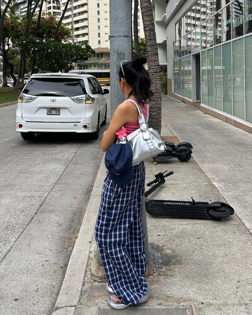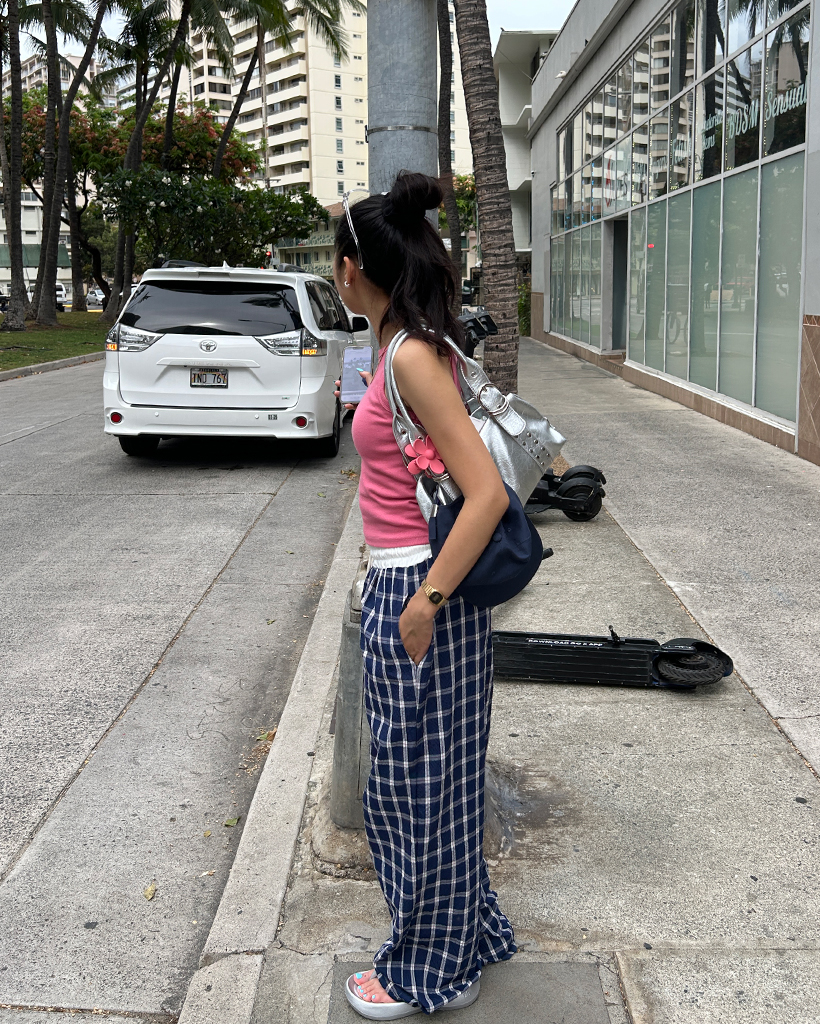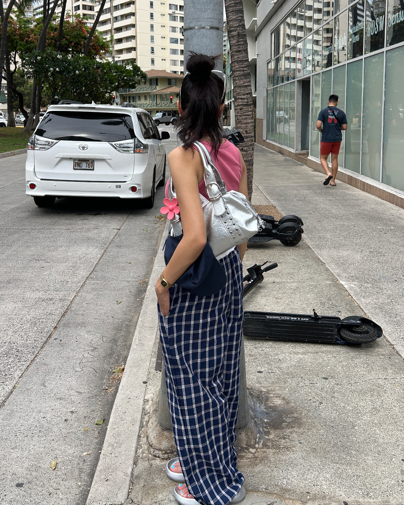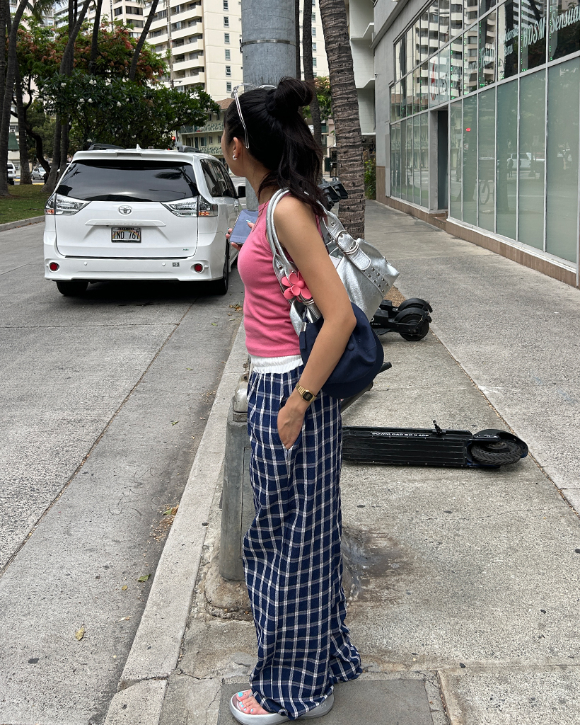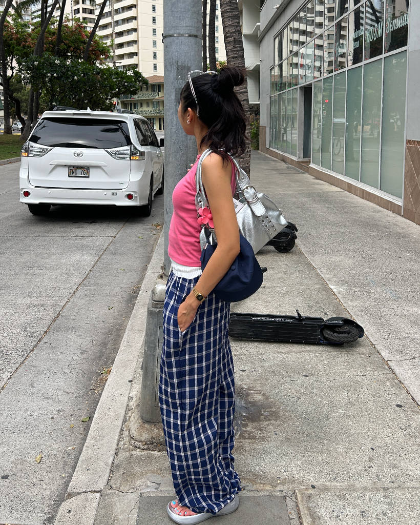 ウエストバイカラーチェックシアサッカーワイドパンツ