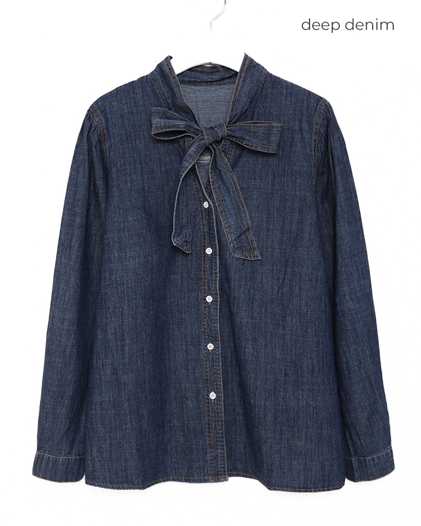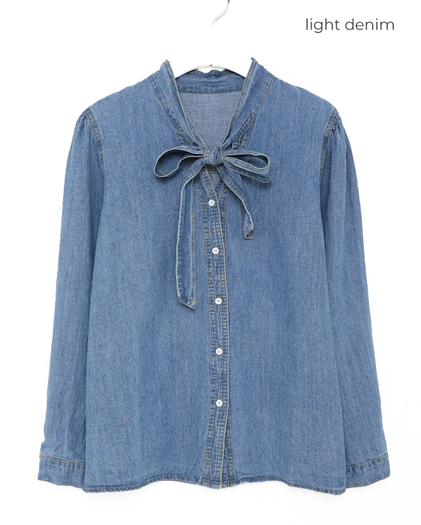 リボンポイントシャーリングショルダーデニムブラウス