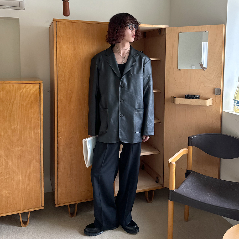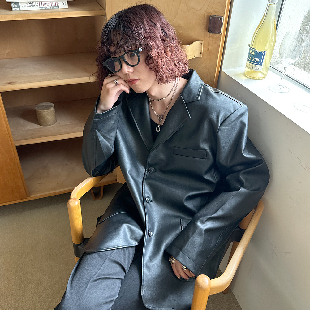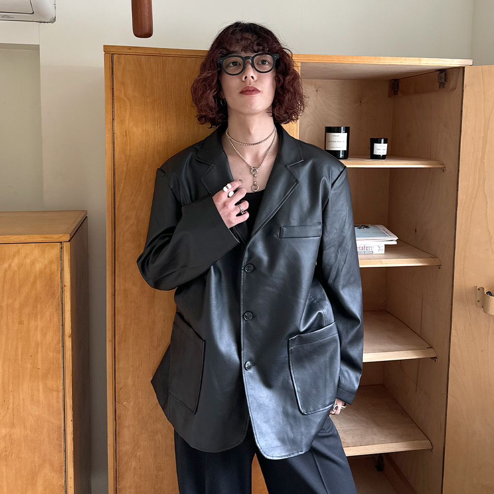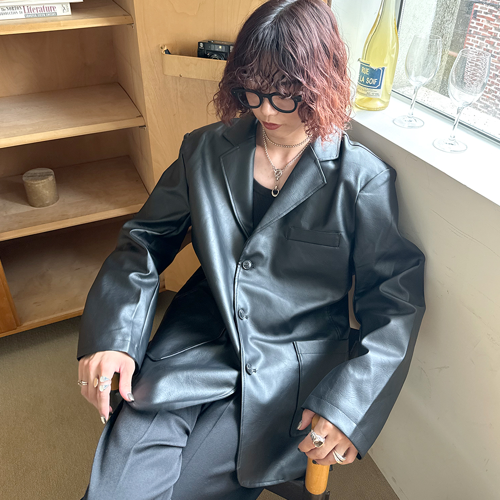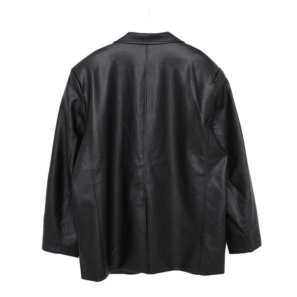 (ユニセックス)フェイクレザースリーボタンオーバーフィットジャケット