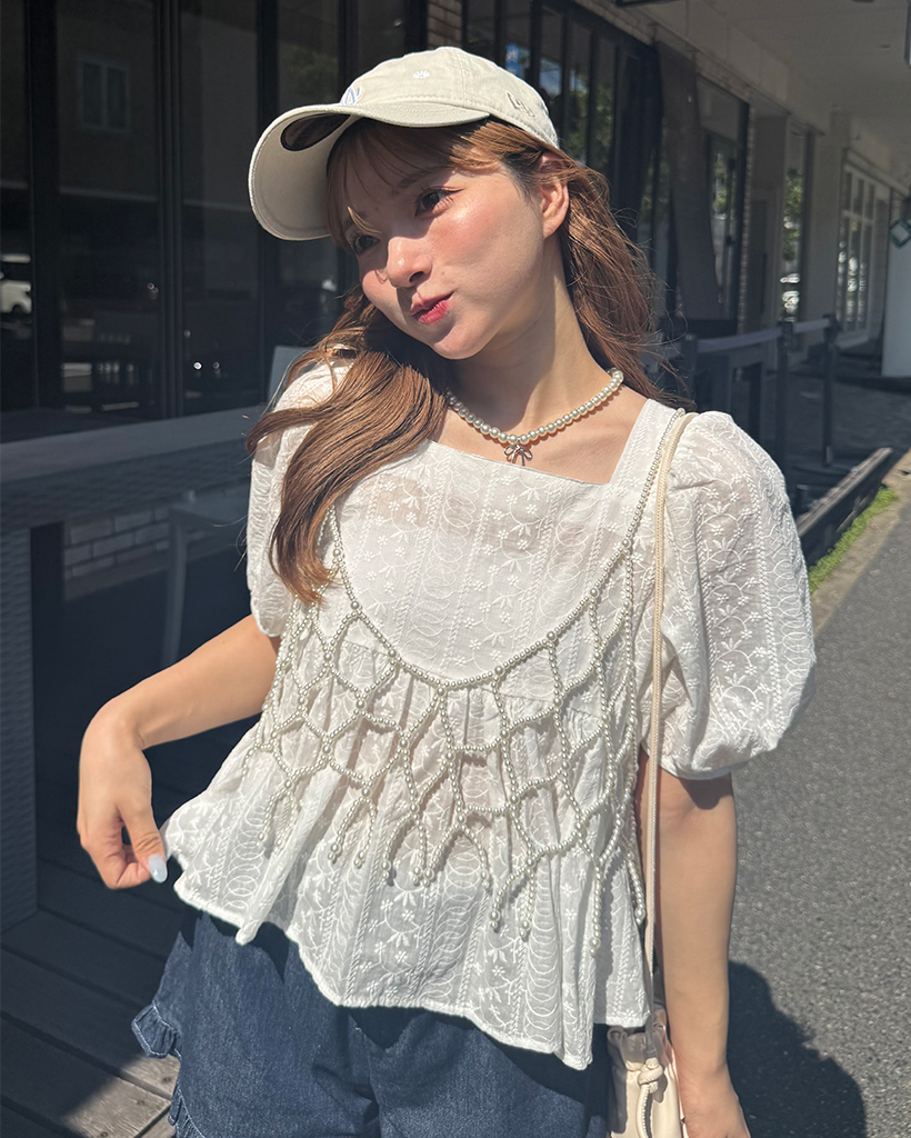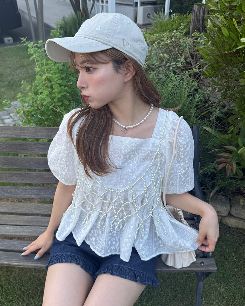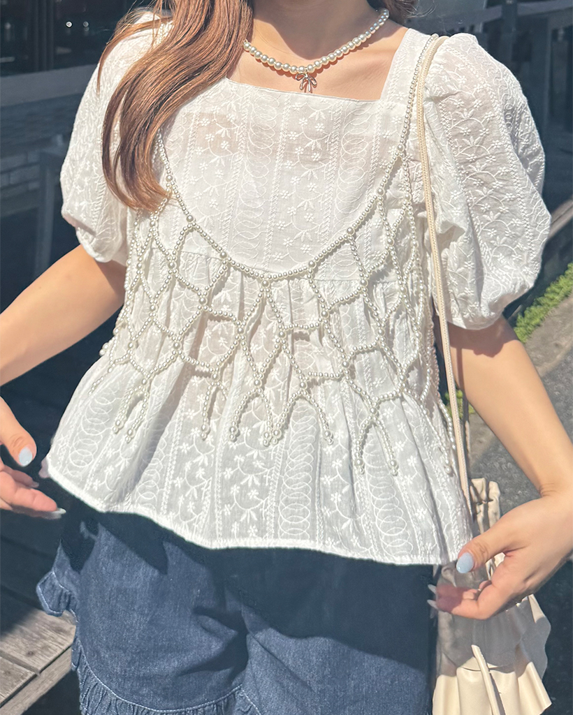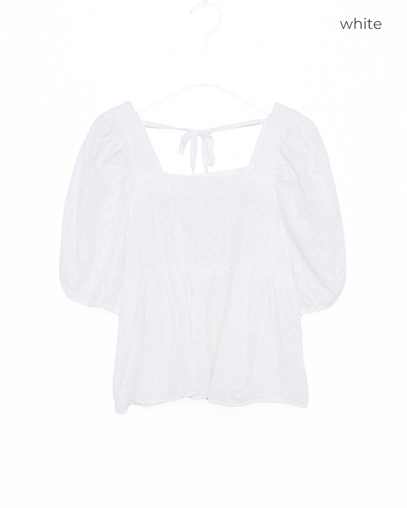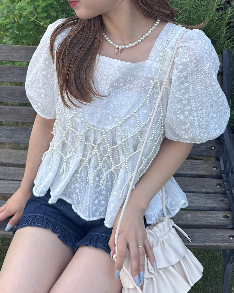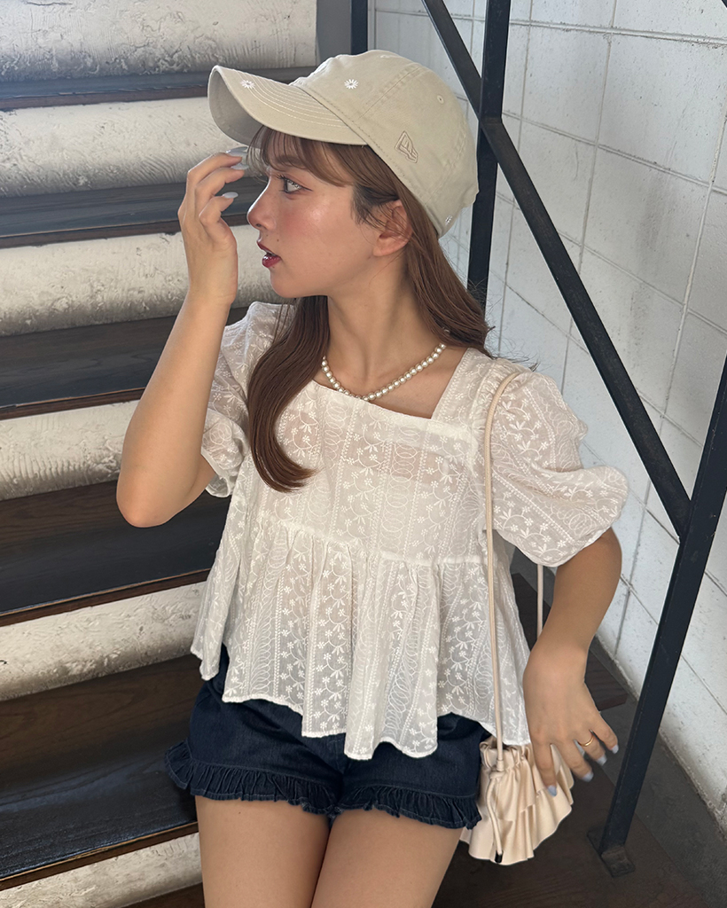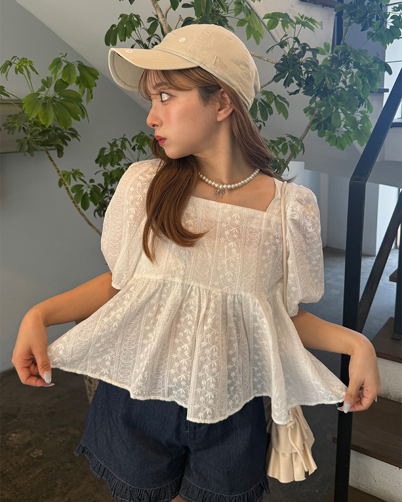 フラワーレースパフスリーブペプラムブラウス
