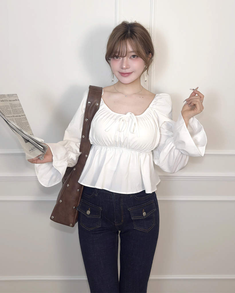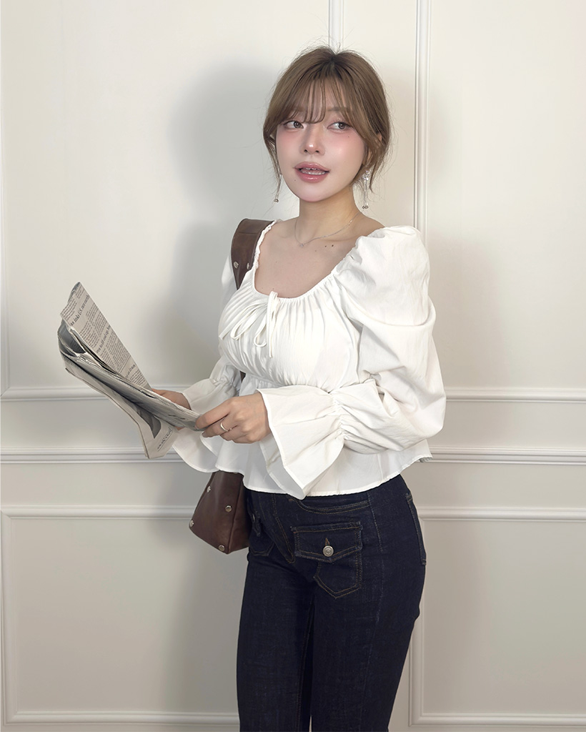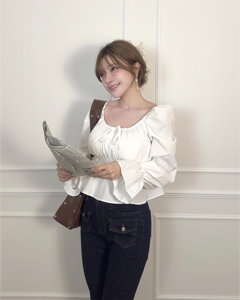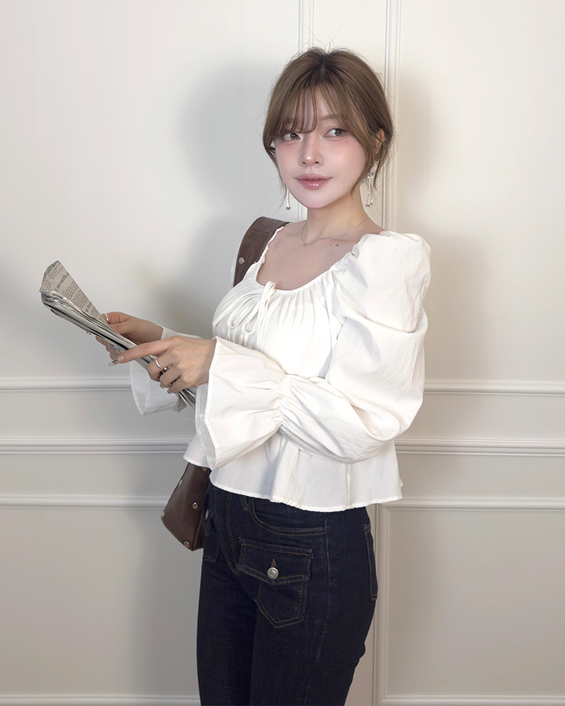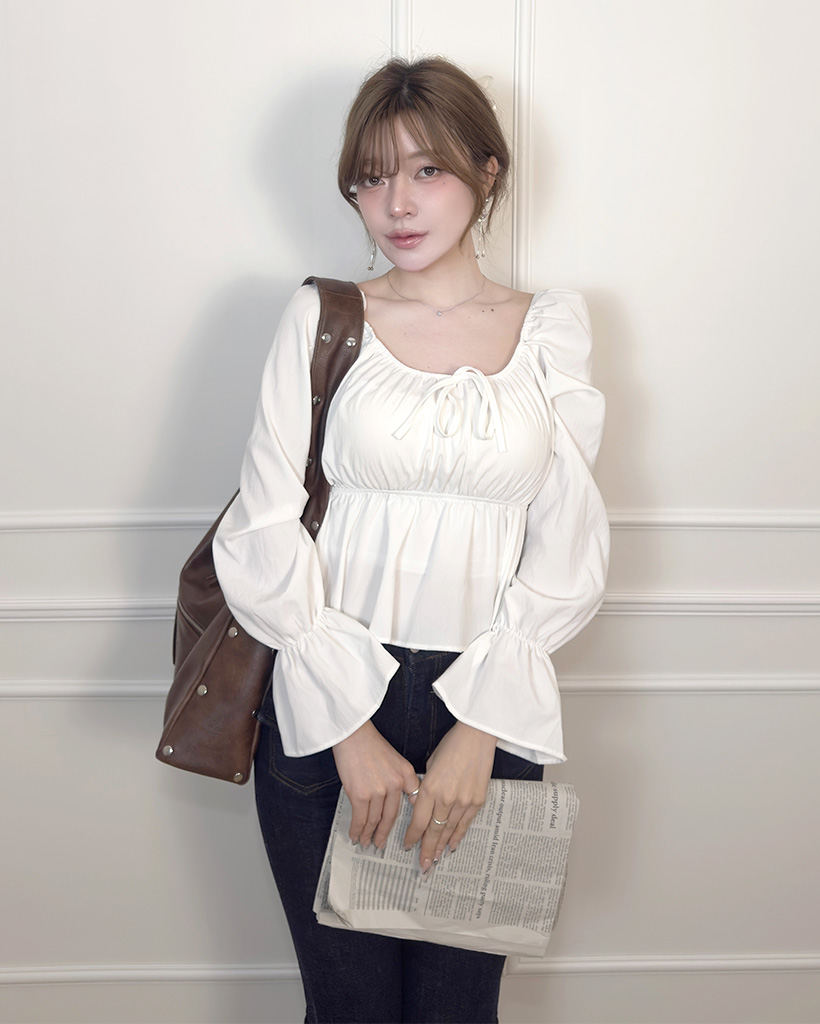 リボンギャザーパフスリーブブラウス
