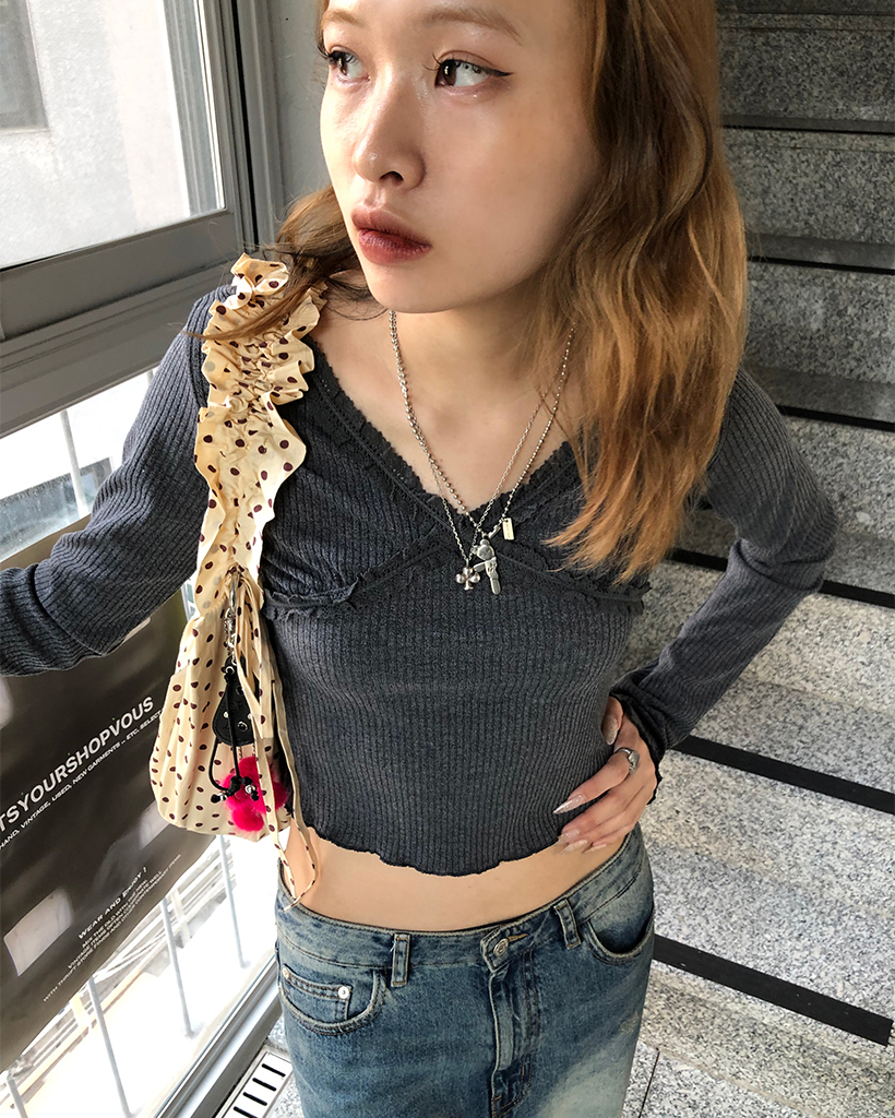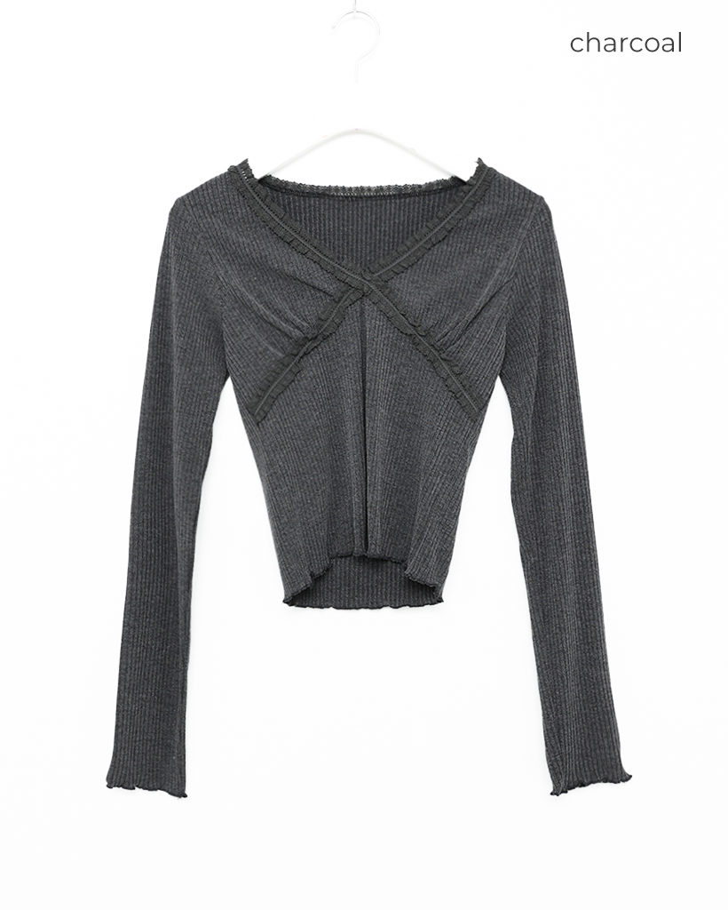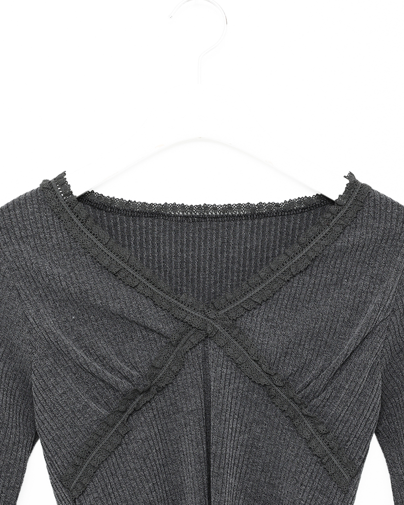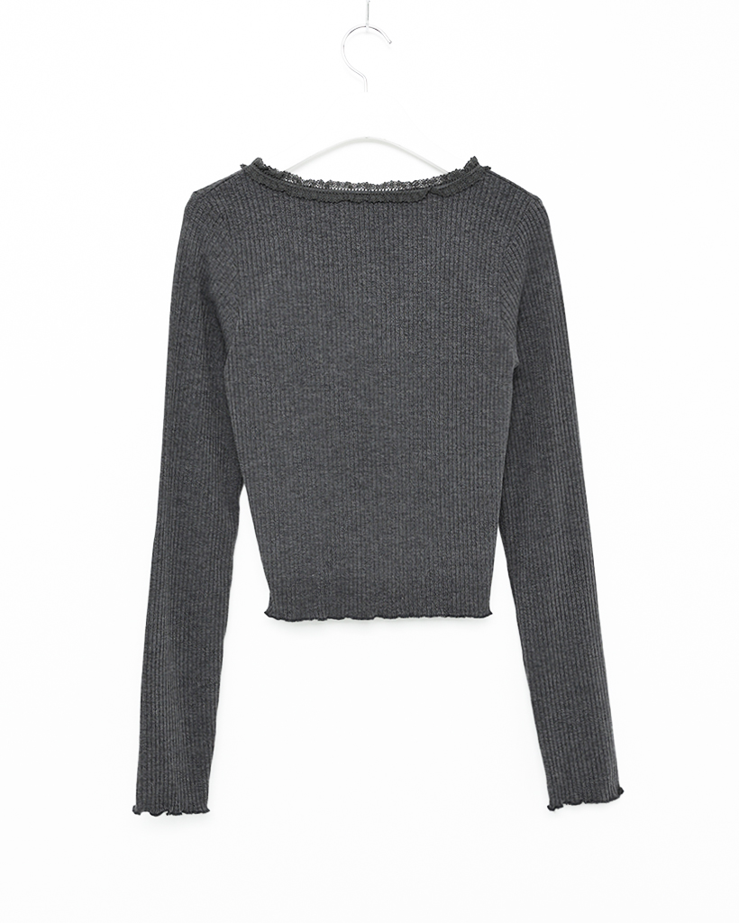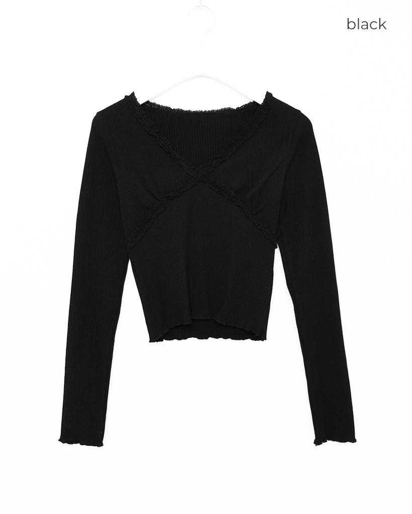 レースVネッククロップドリブロングTシャツ