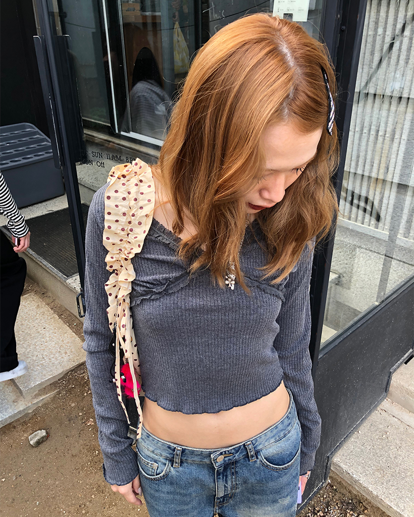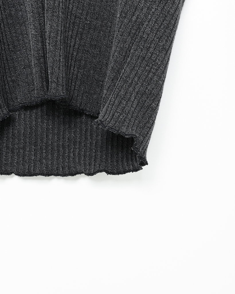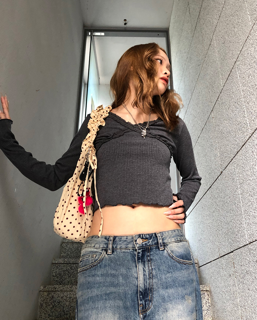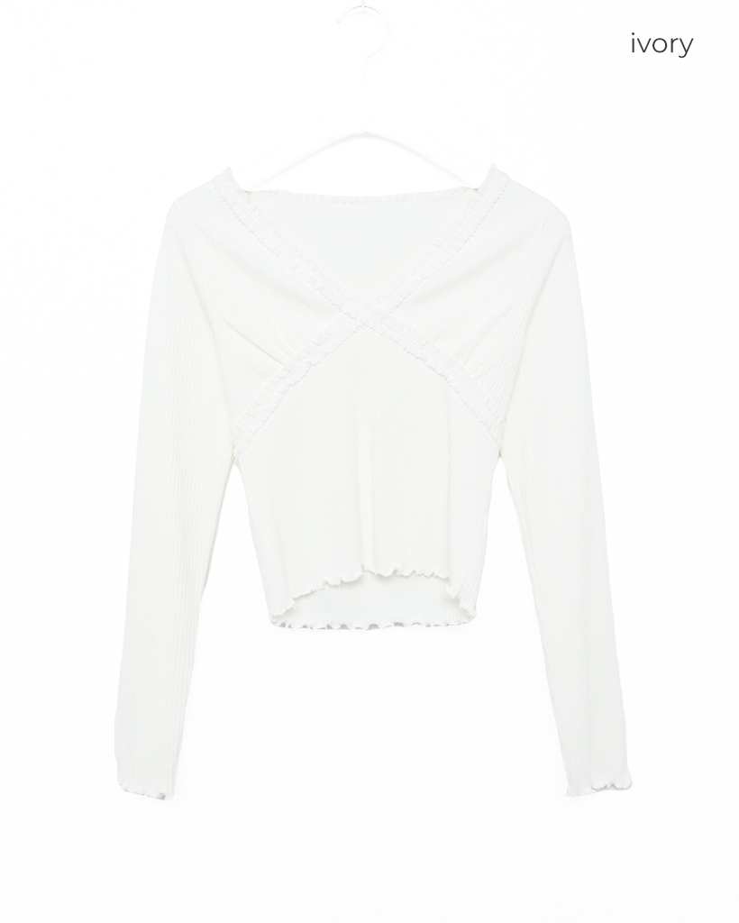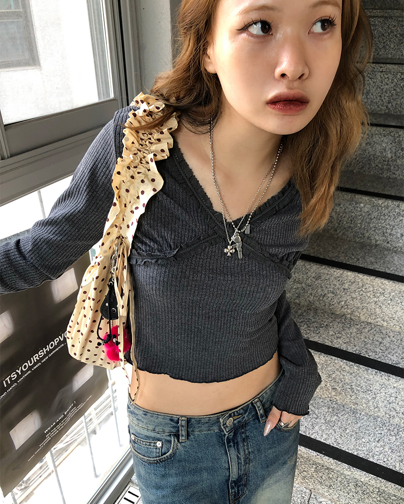 レースVネッククロップドリブロングTシャツ