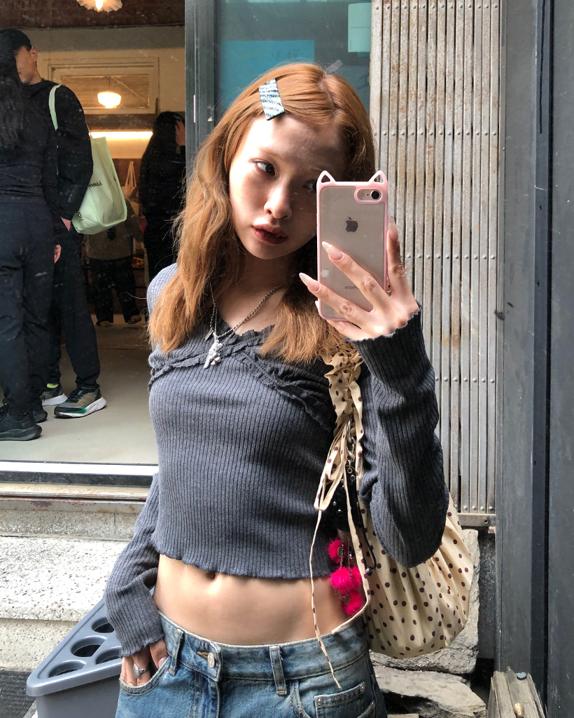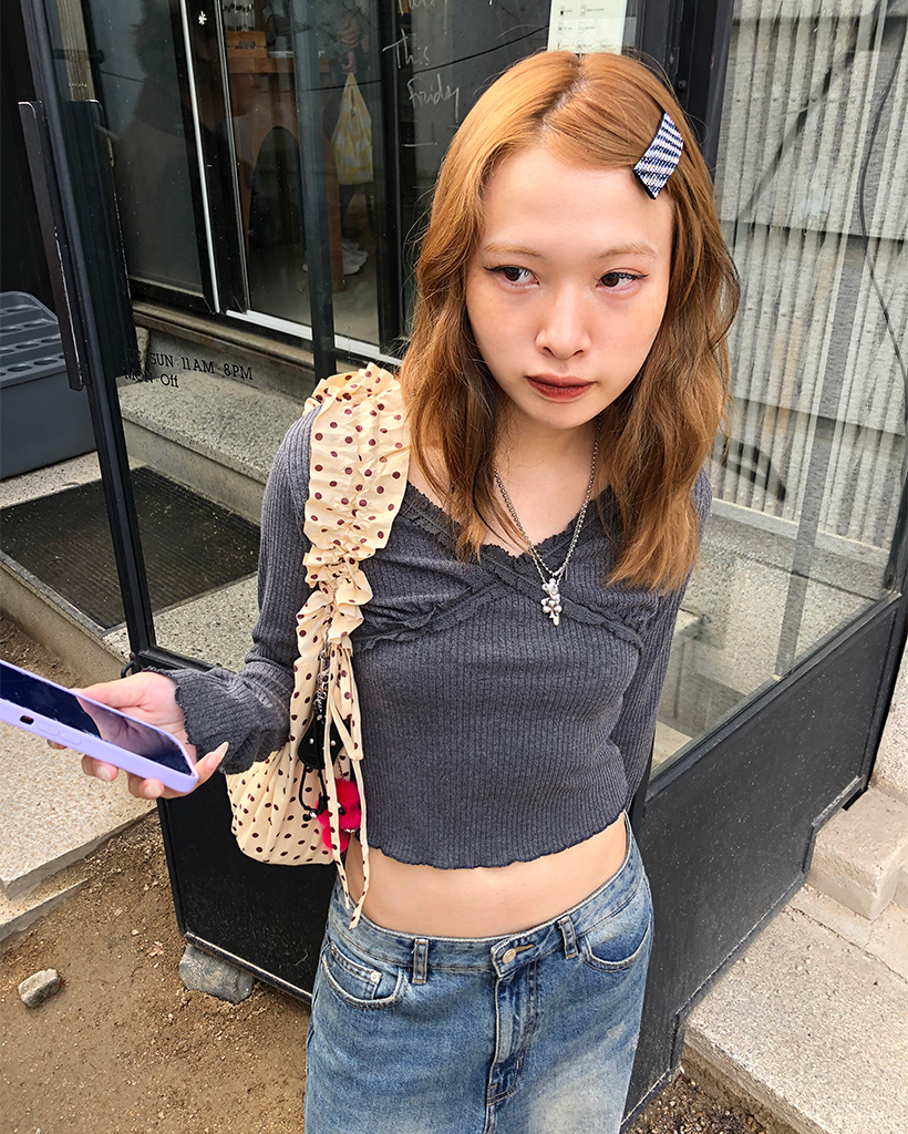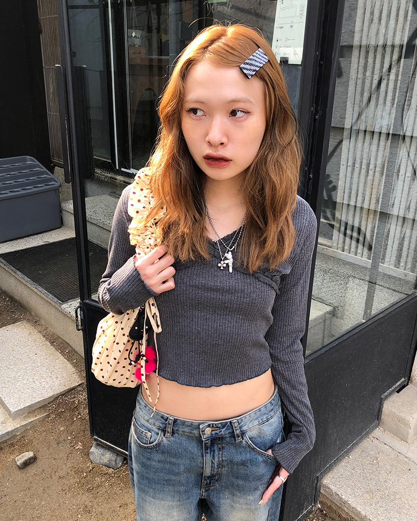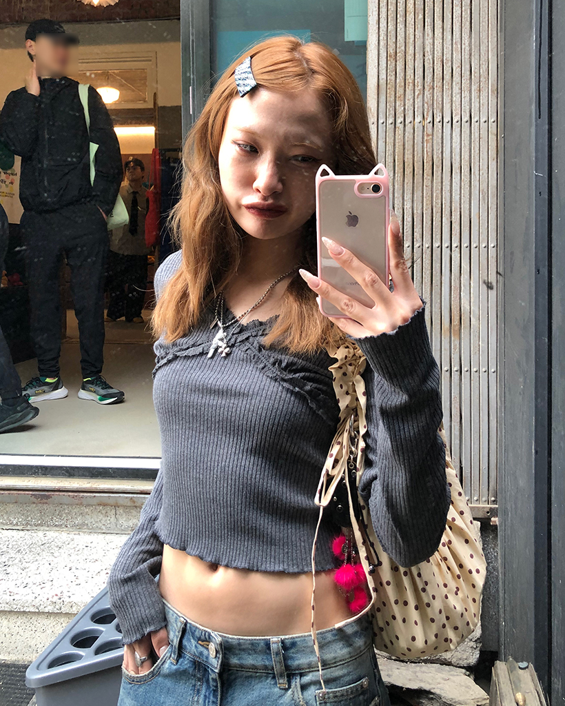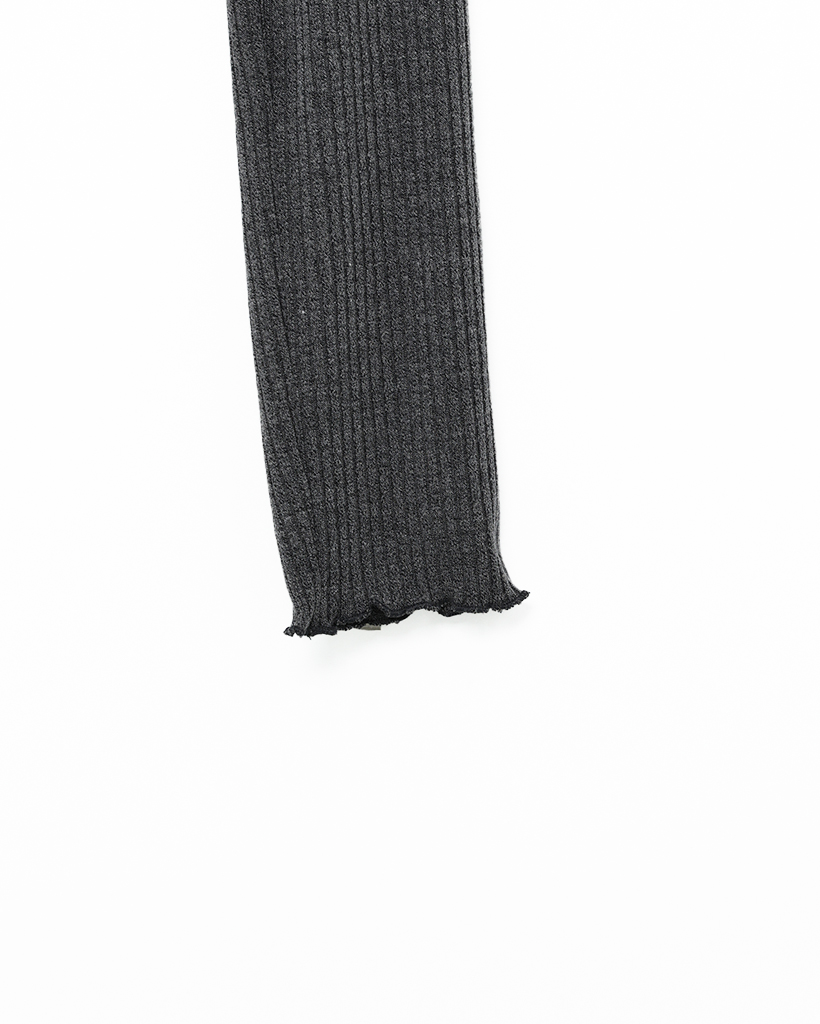 レースVネッククロップドリブロングTシャツ