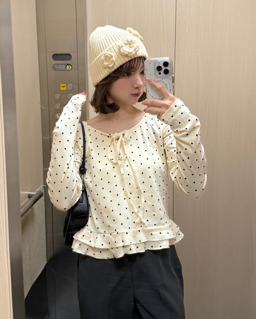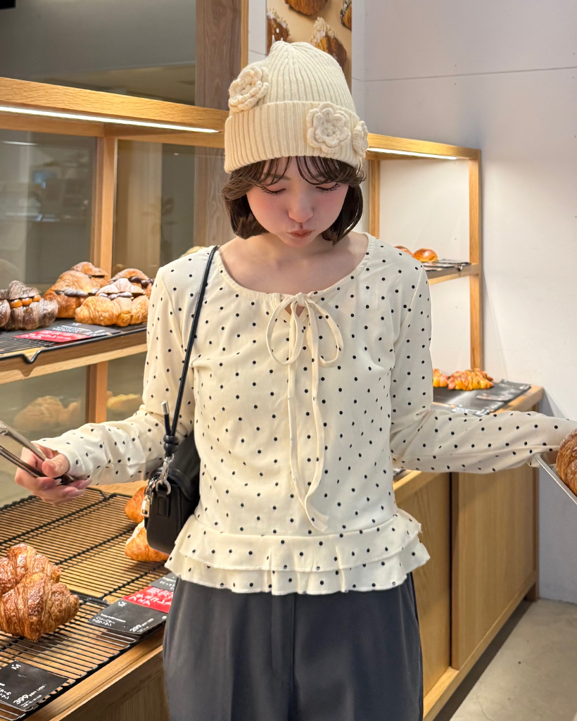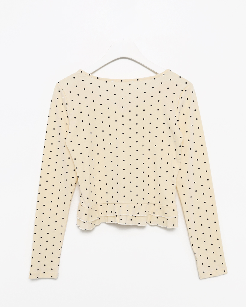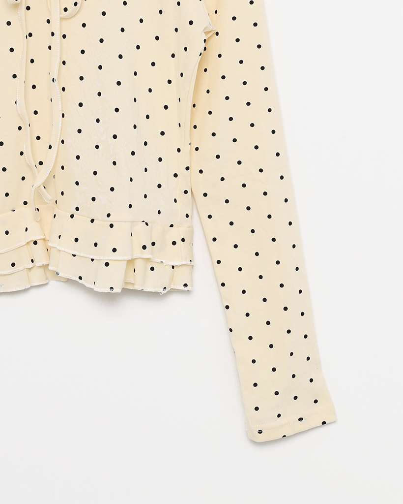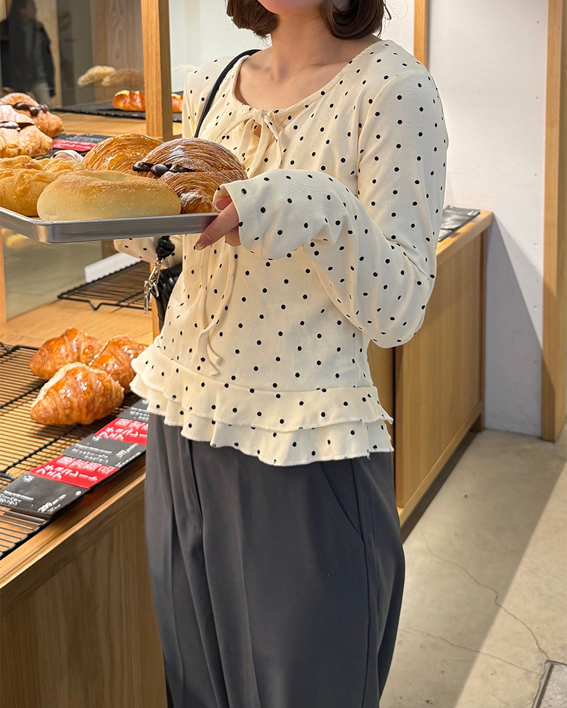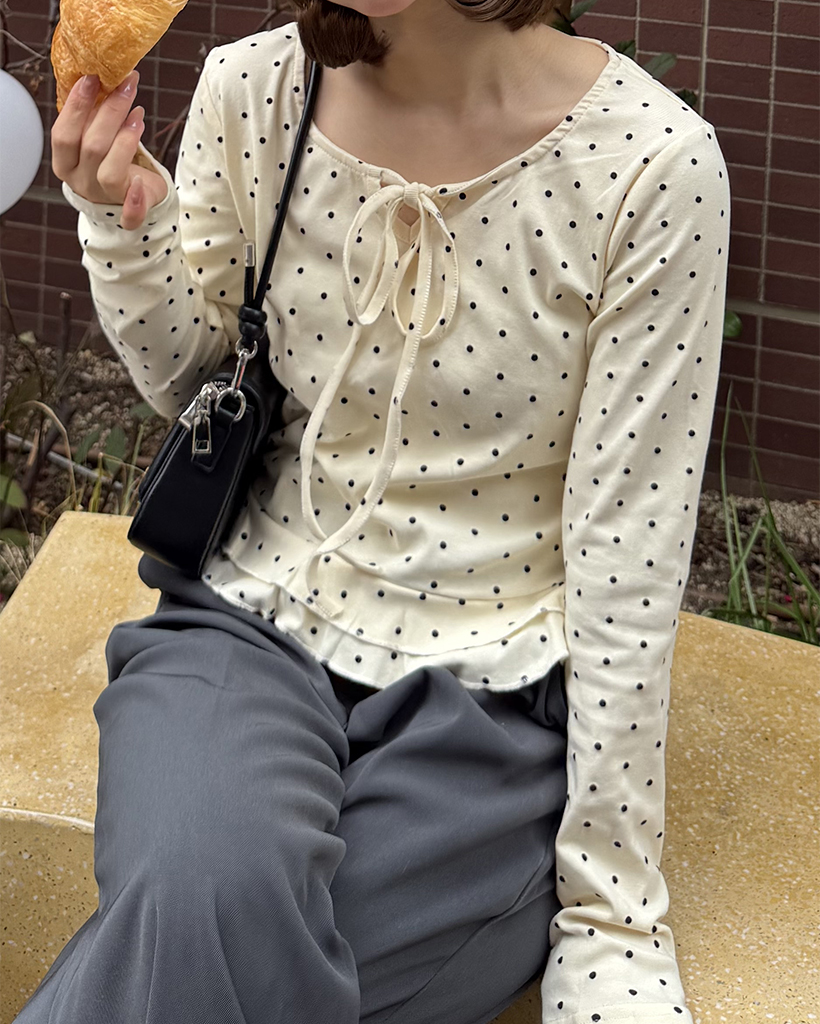 ドローネックドットスカラップヘムリブロングTシャツ
