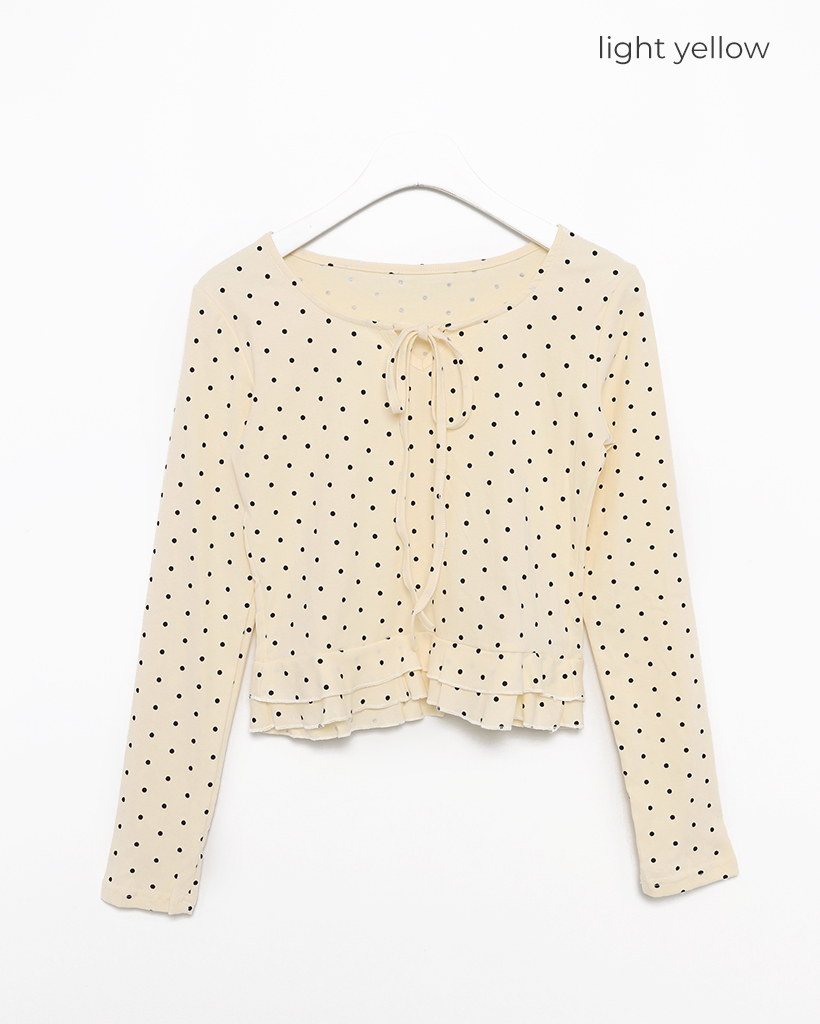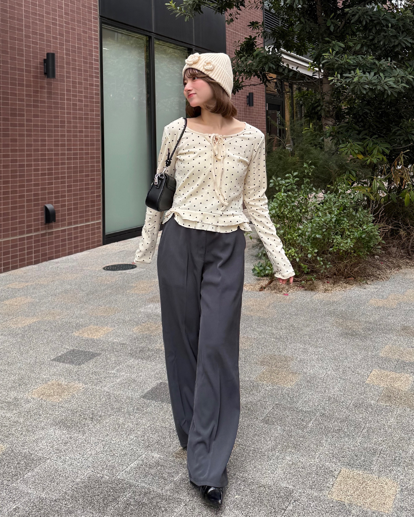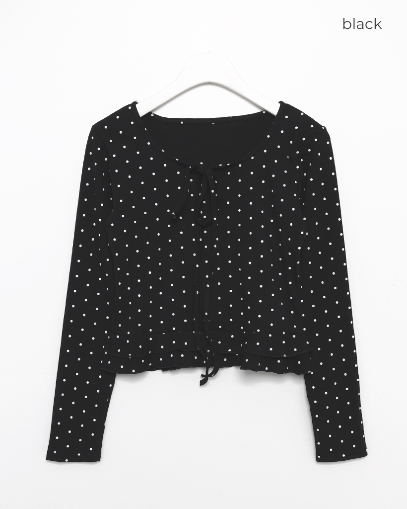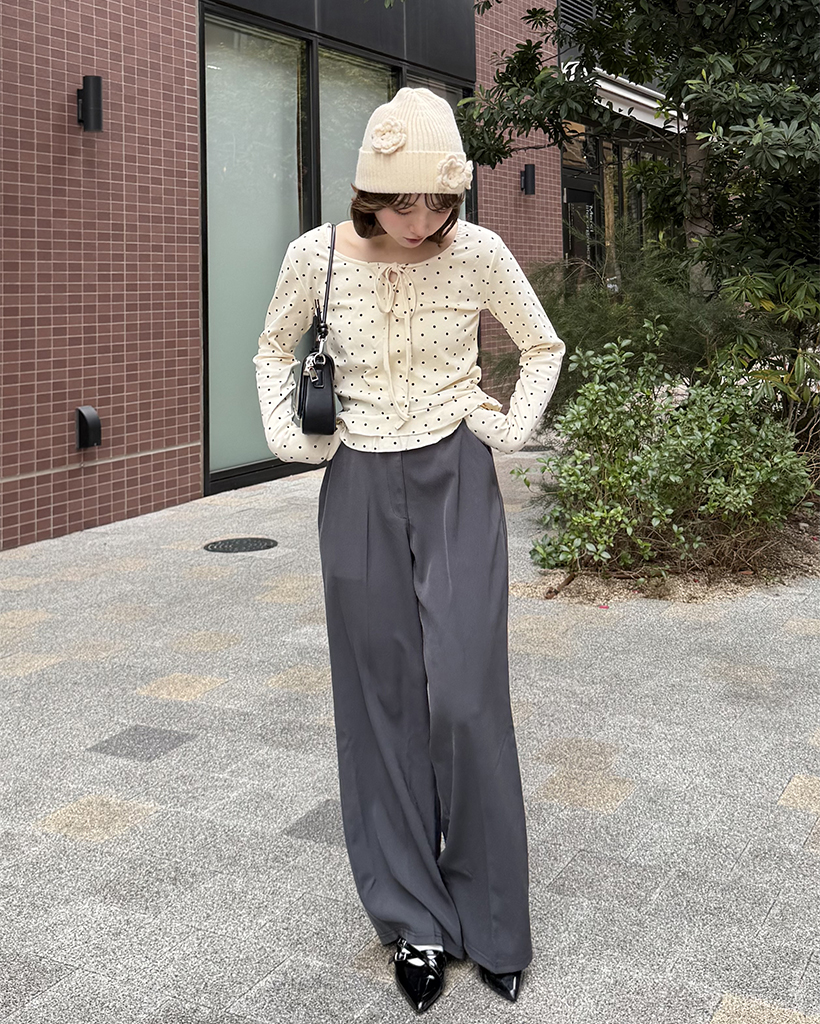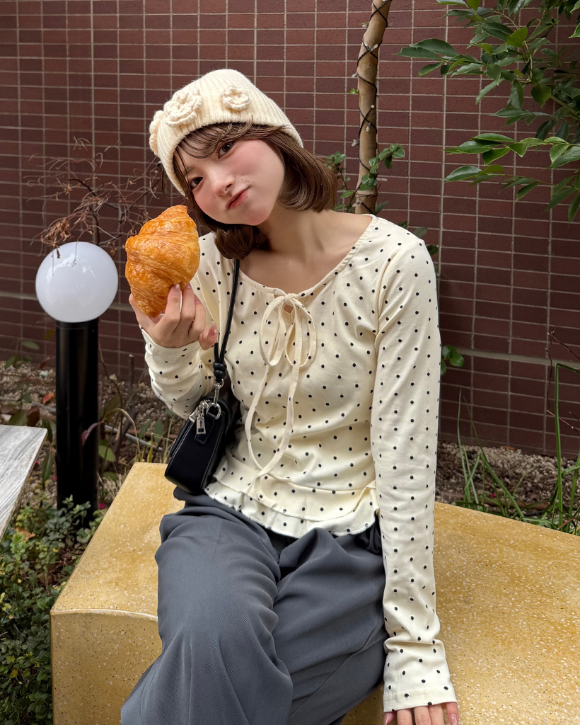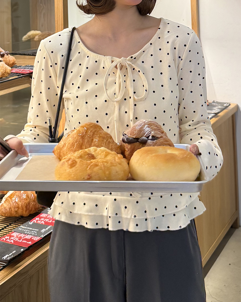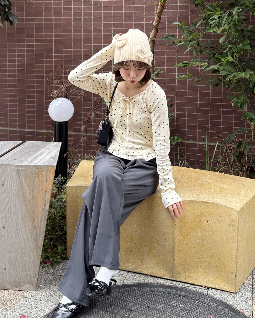 ドローネックドットスカラップヘムリブロングTシャツ