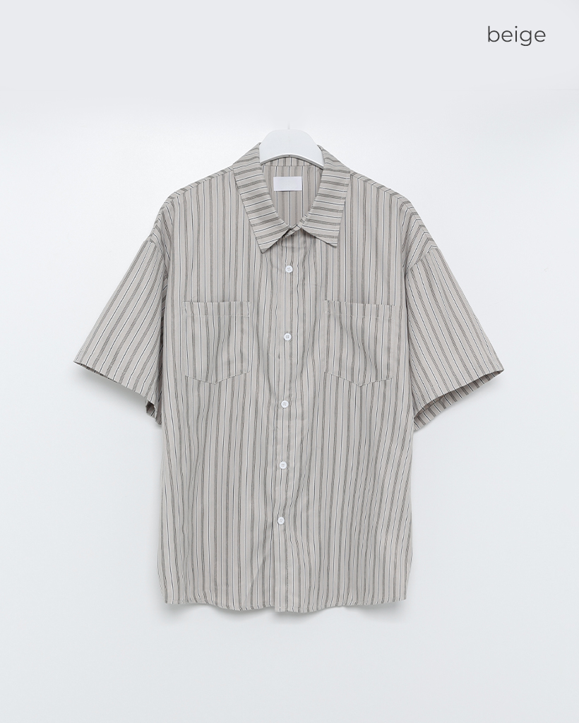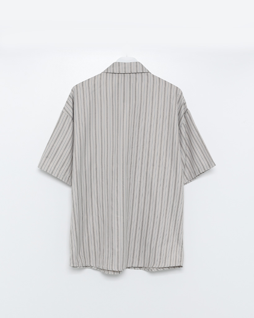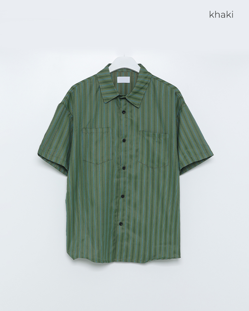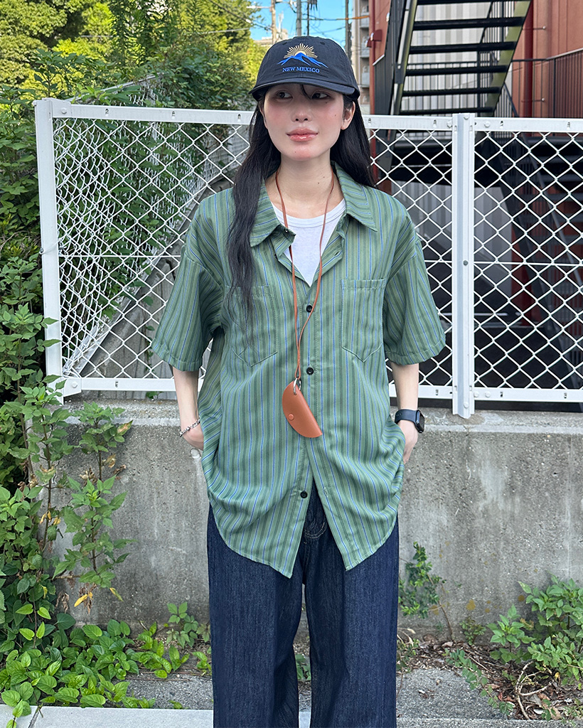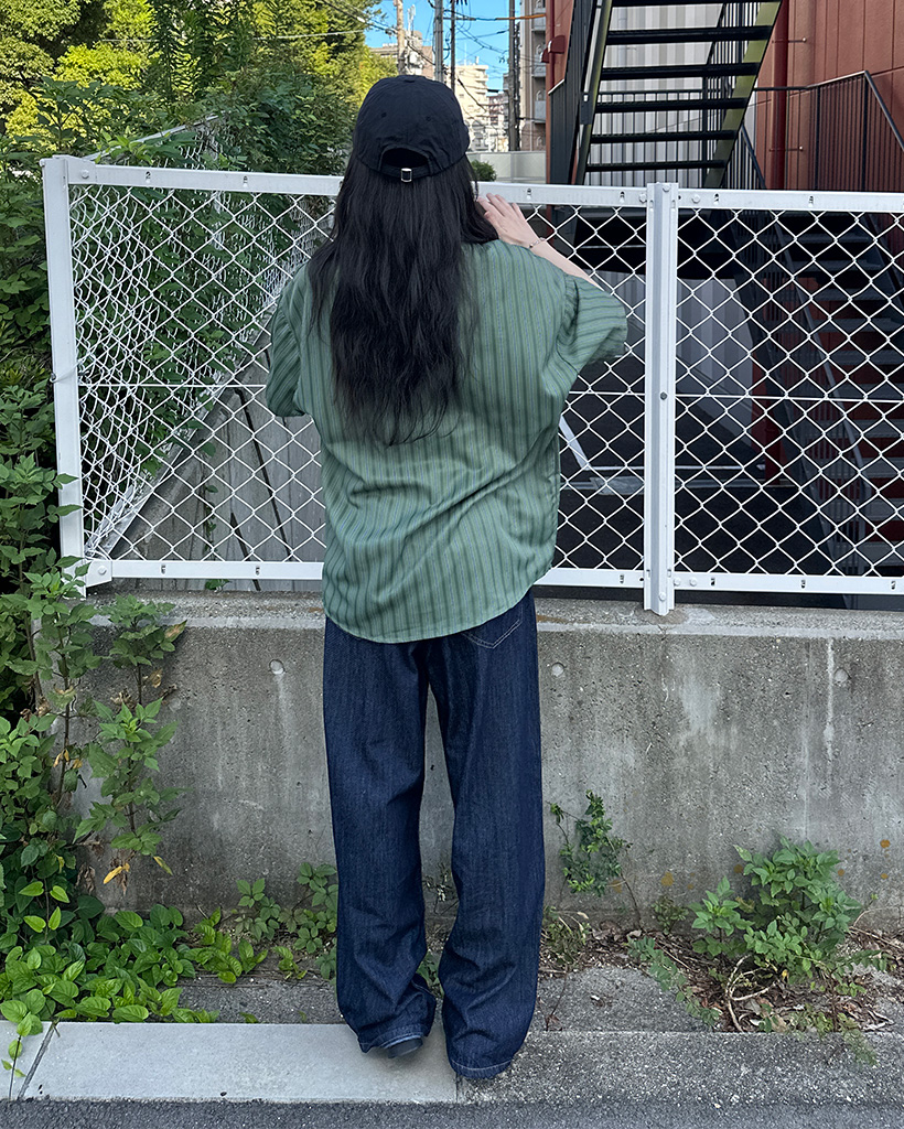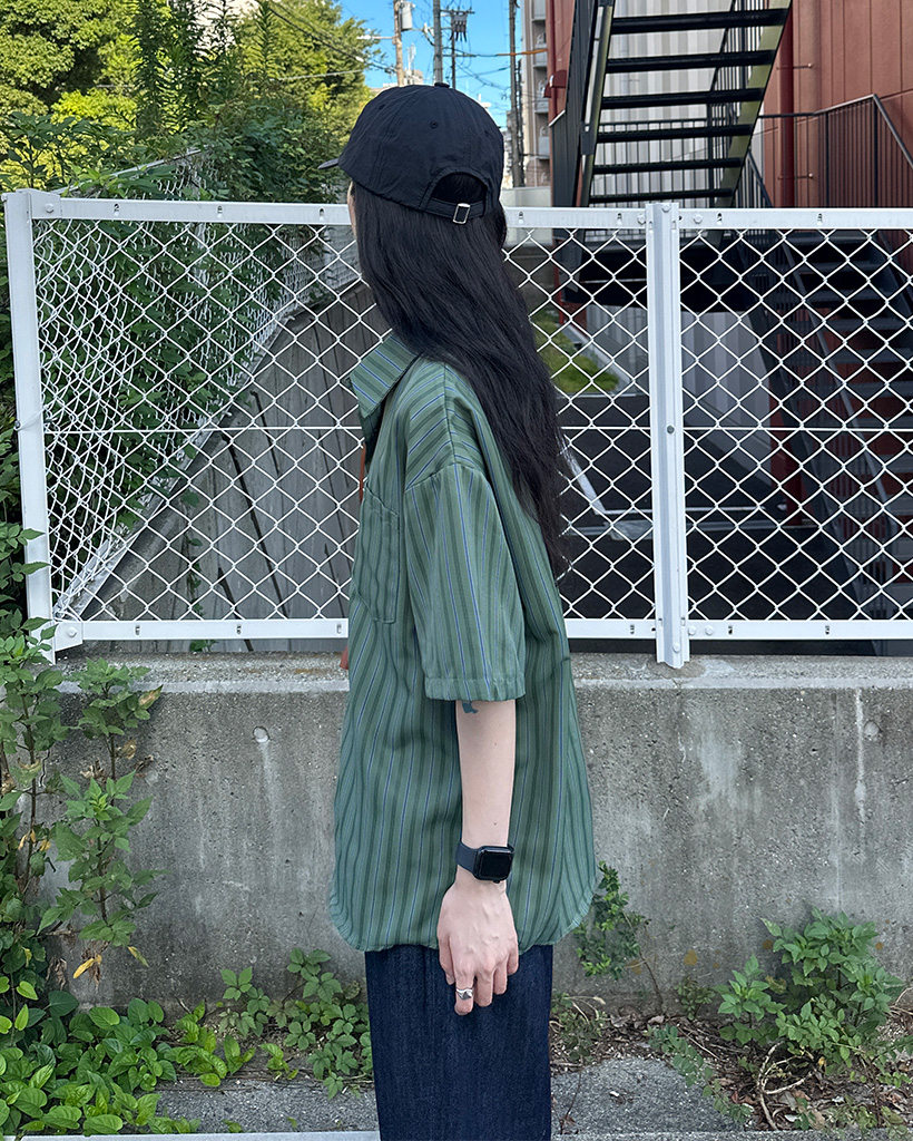 (ユニセックス)ストライプワイドフッド半袖シャツ