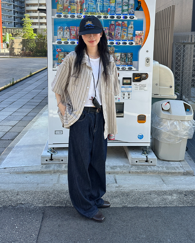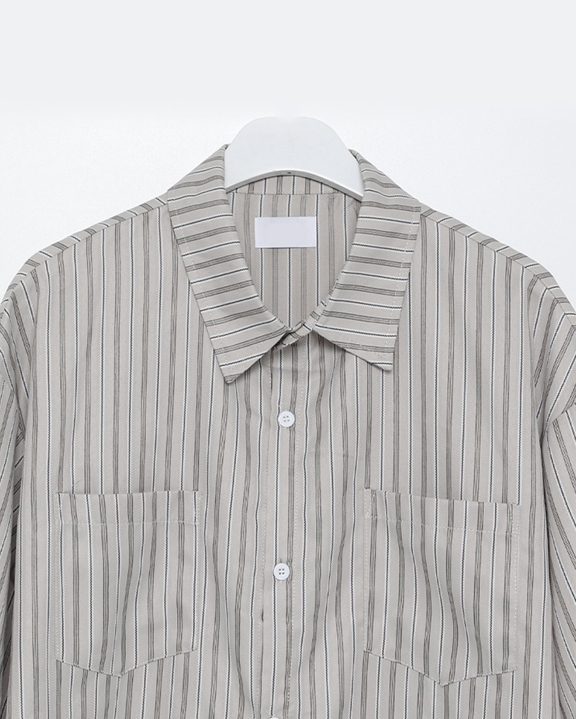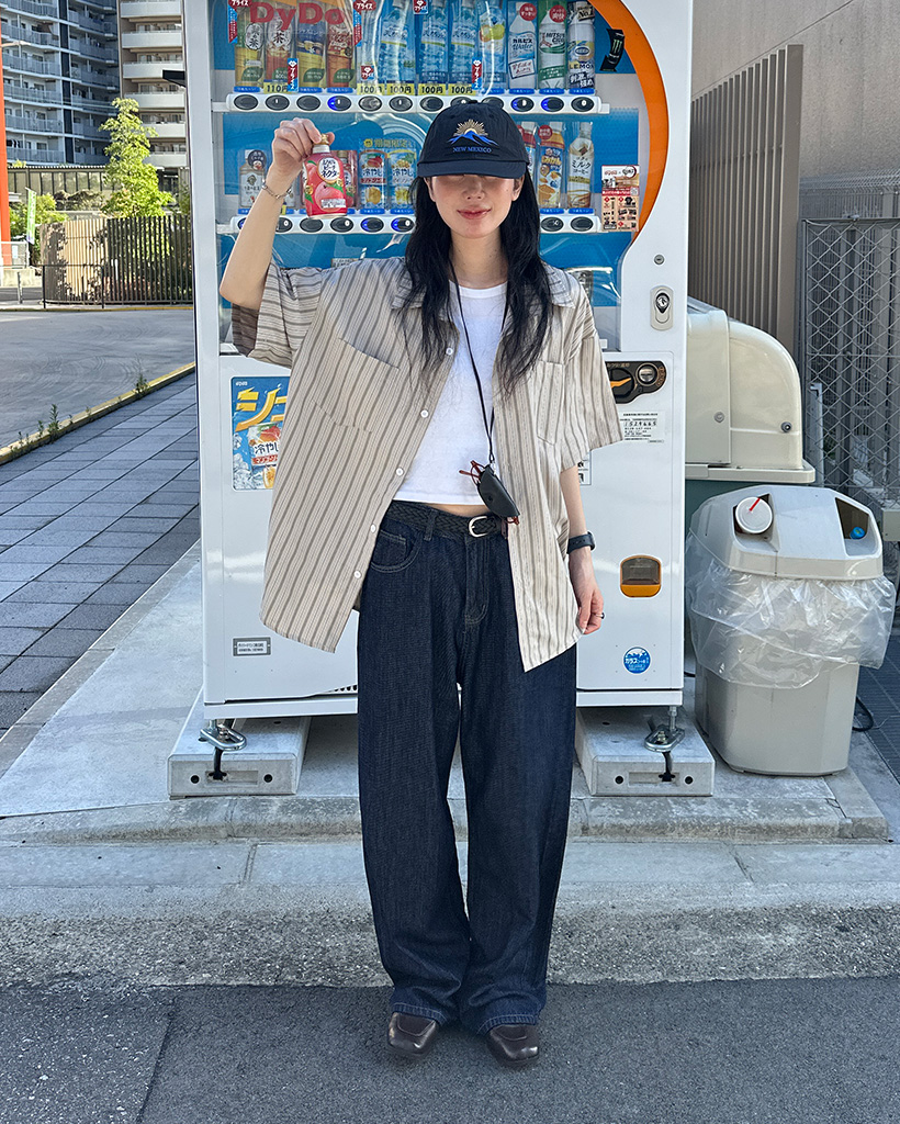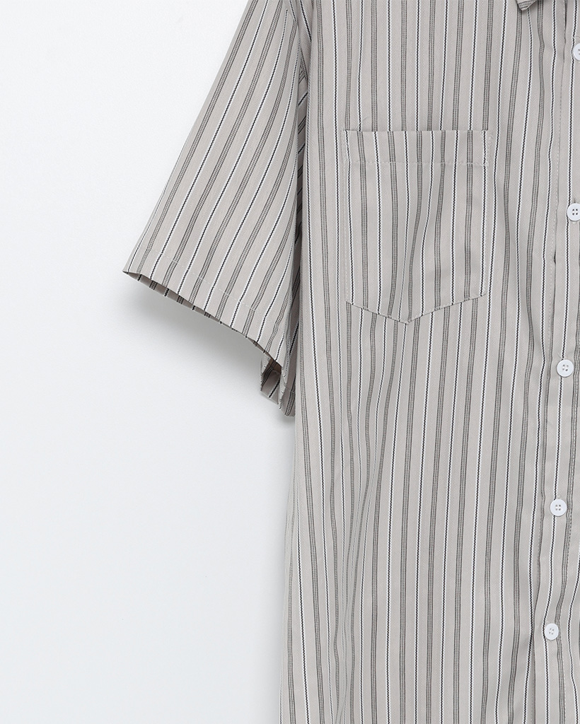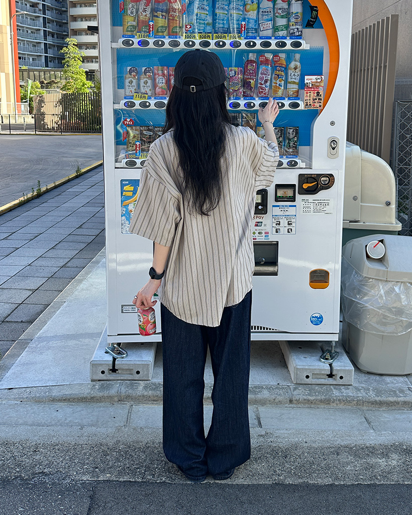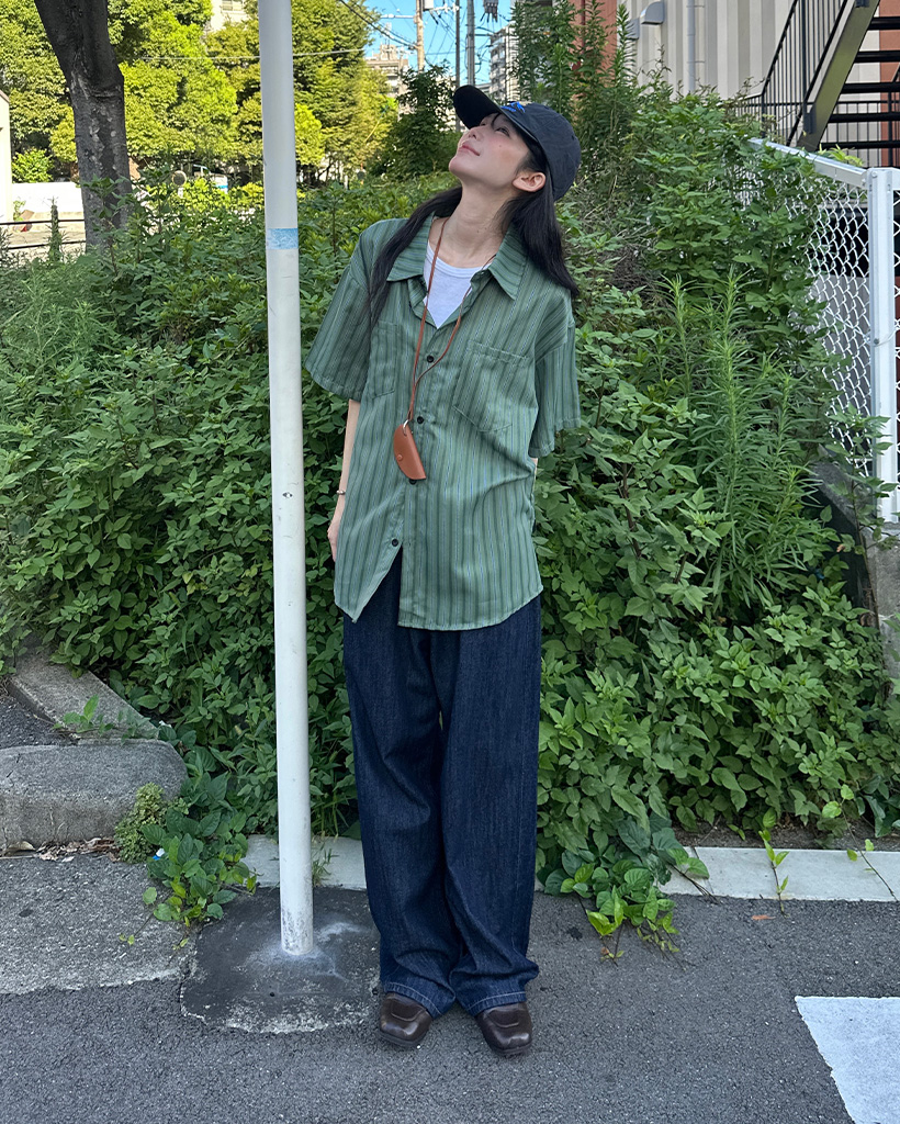 (ユニセックス)ストライプワイドフッド半袖シャツ
