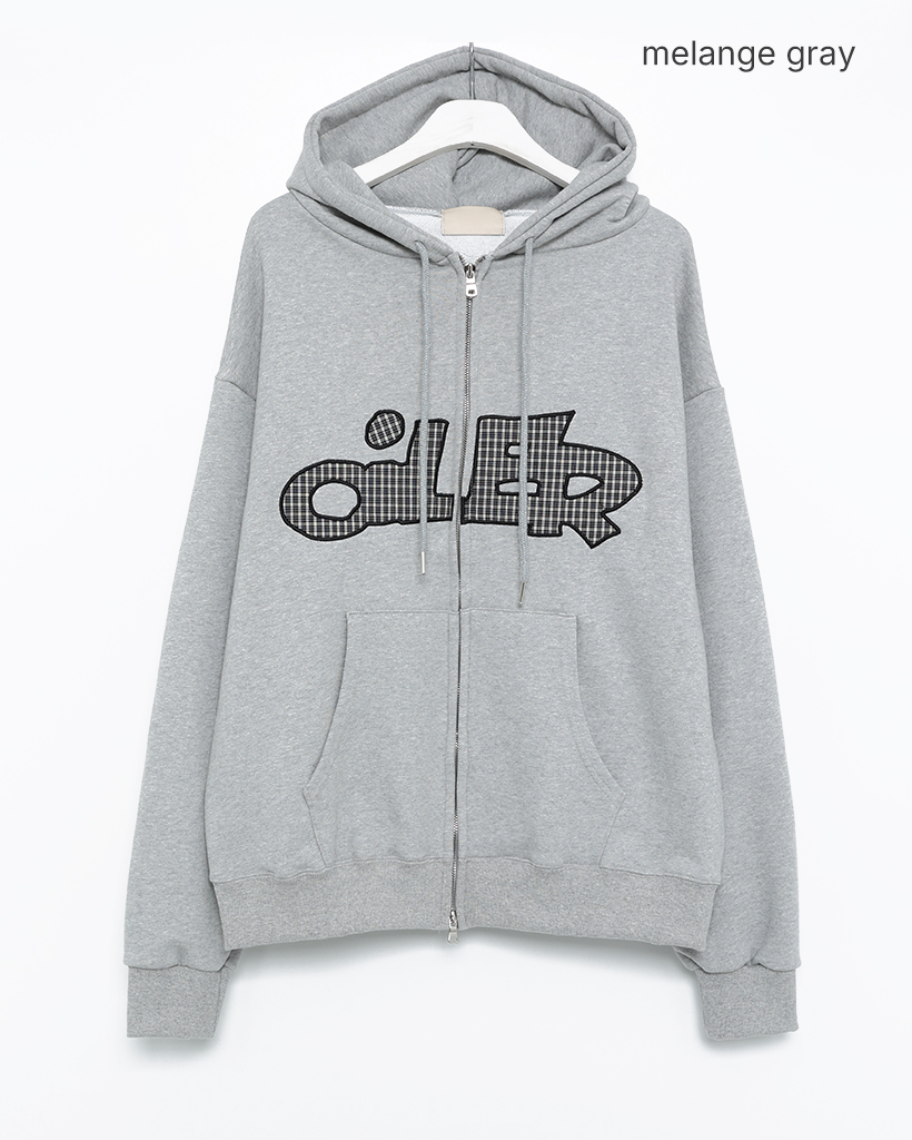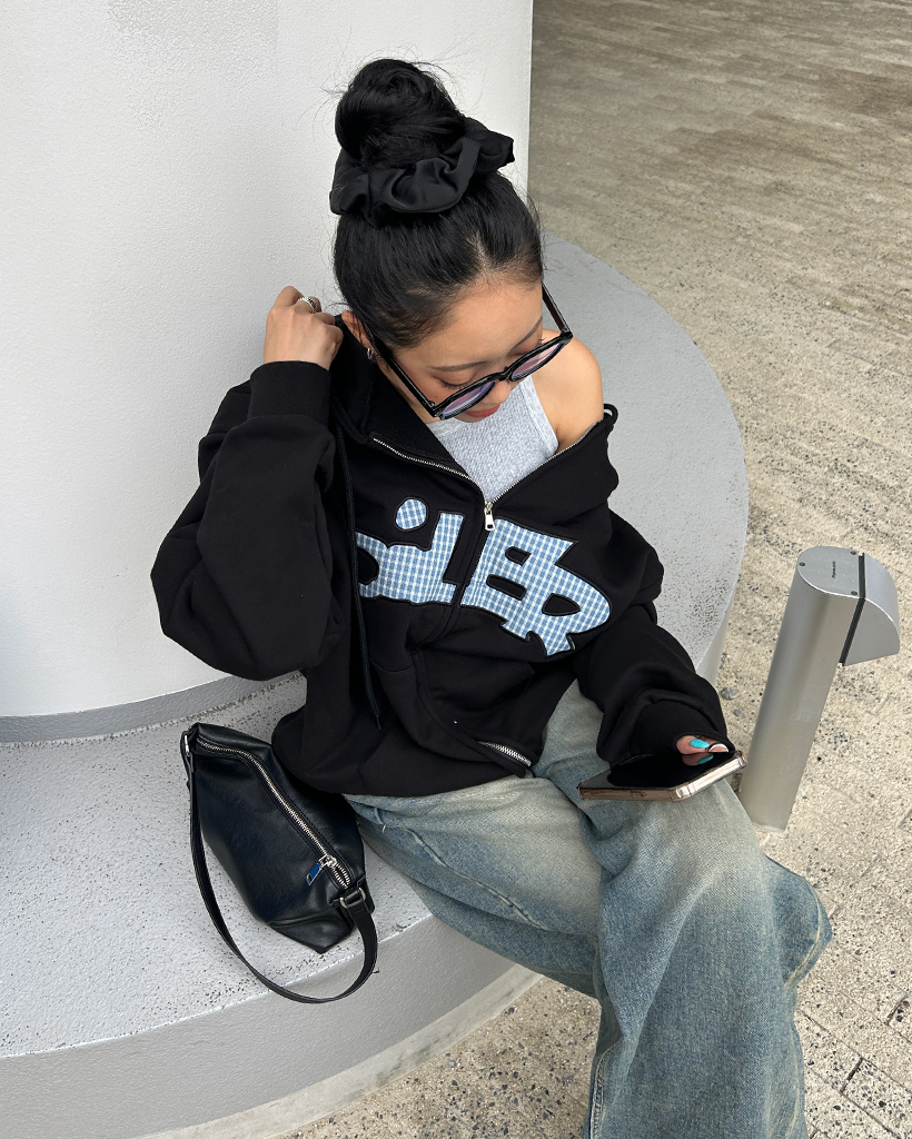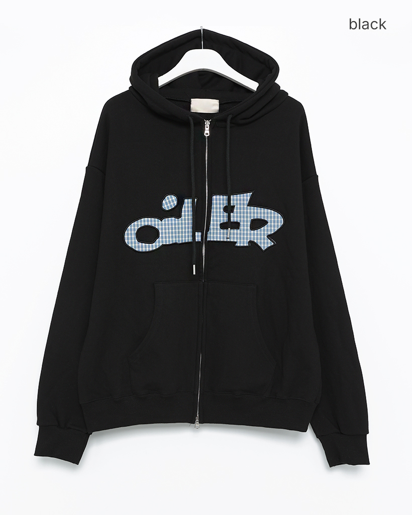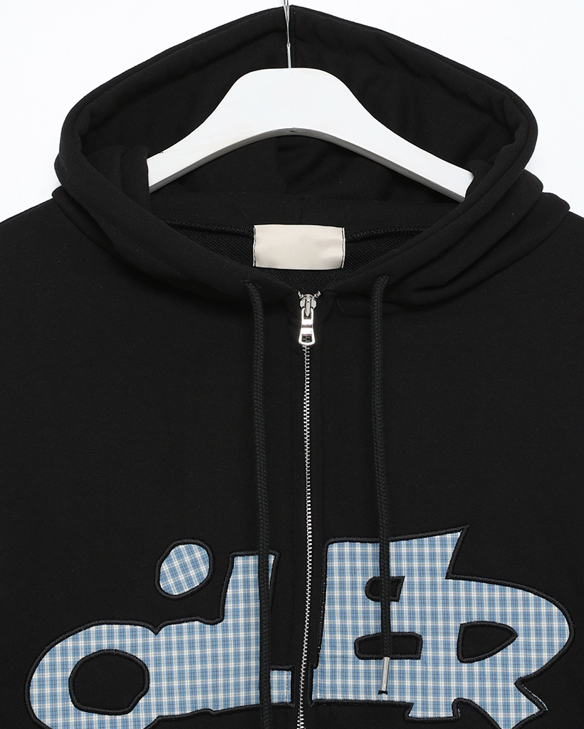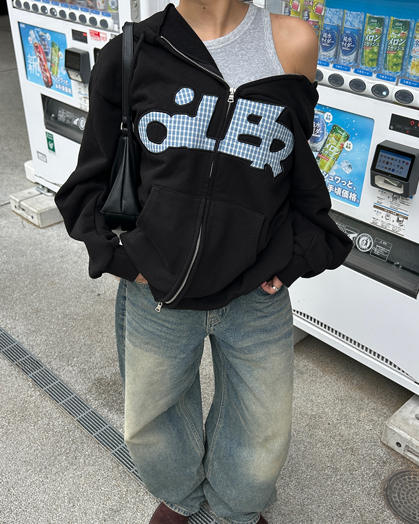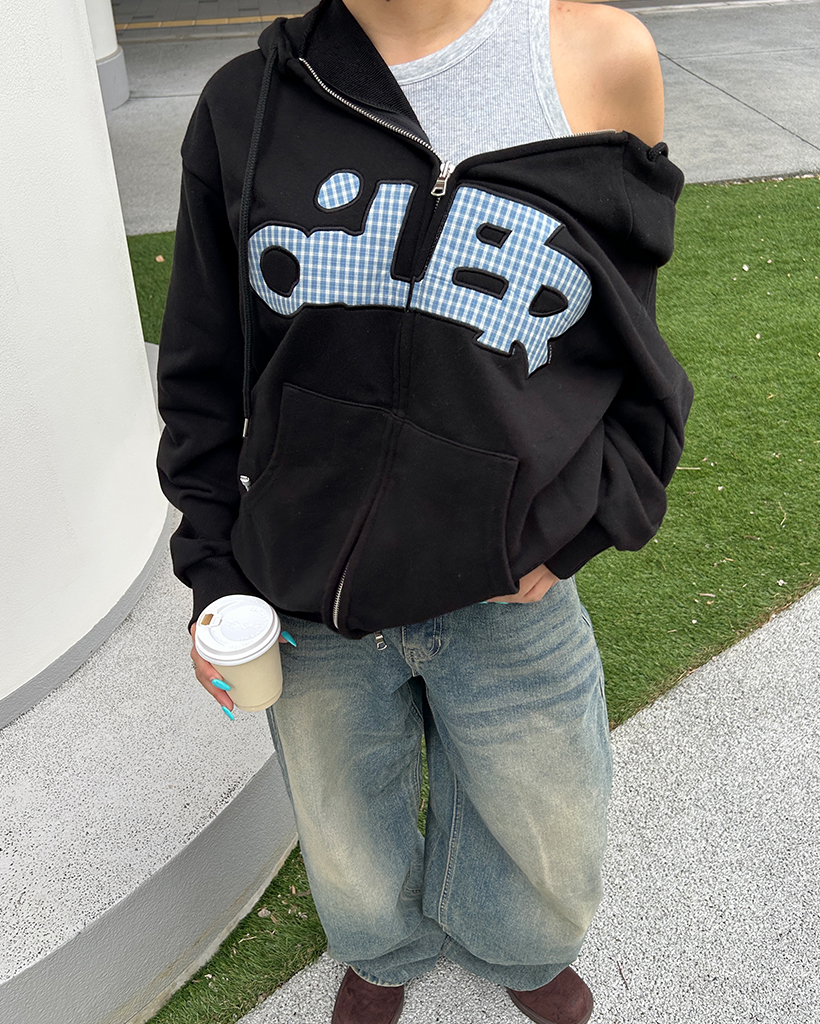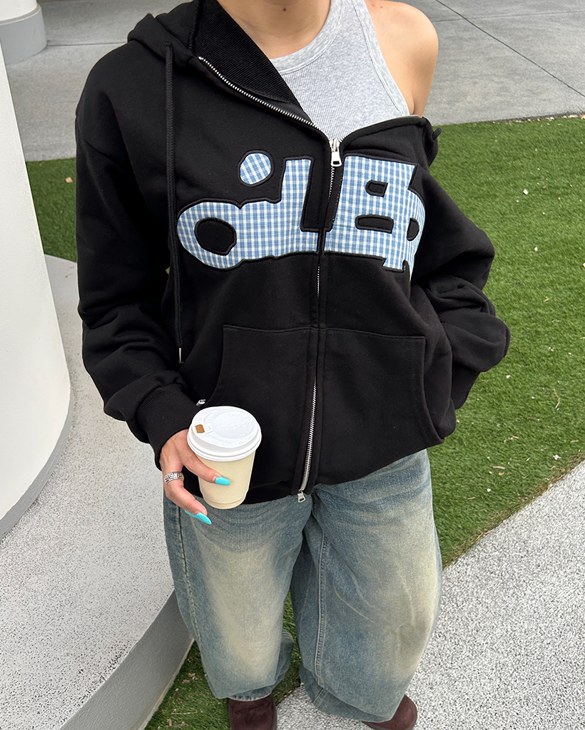 (ユニセックス)タータンチェックパッチダブルジップパーカー