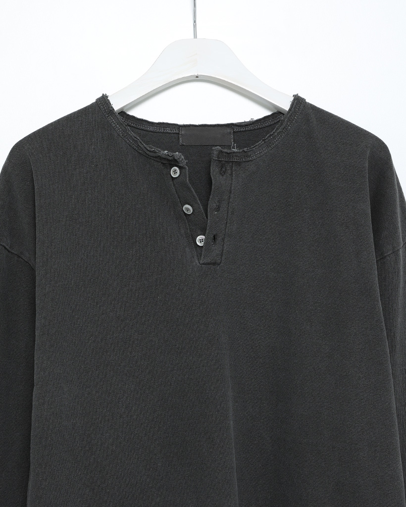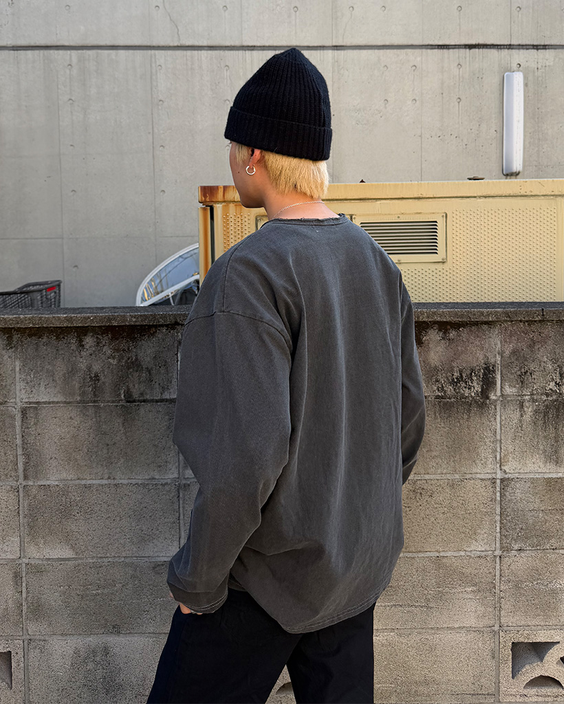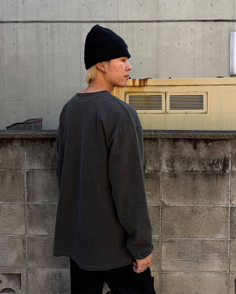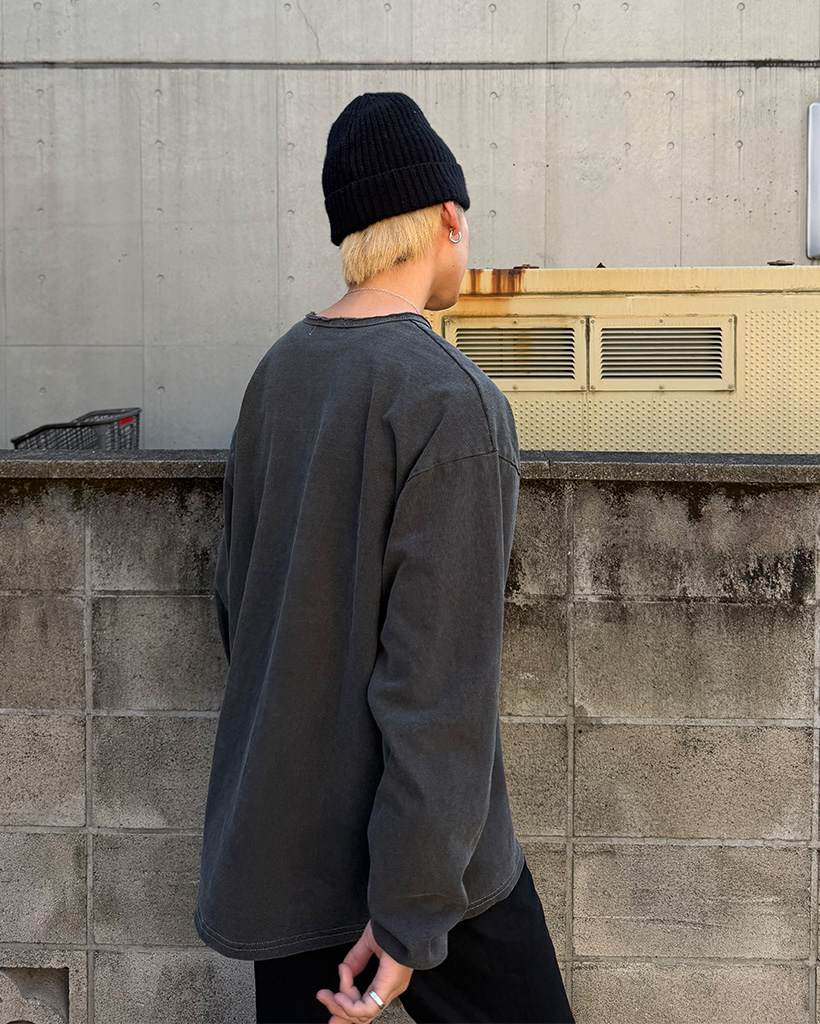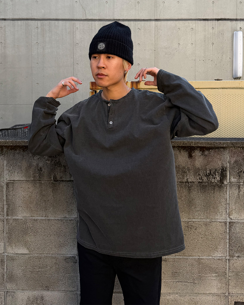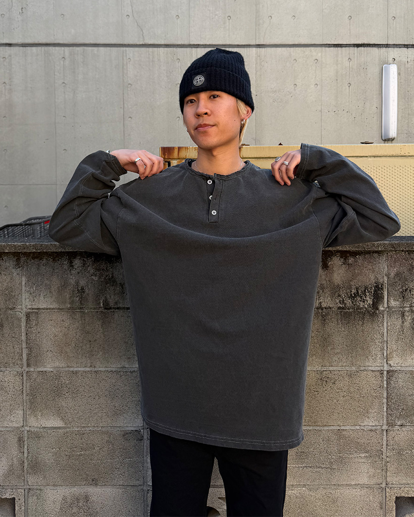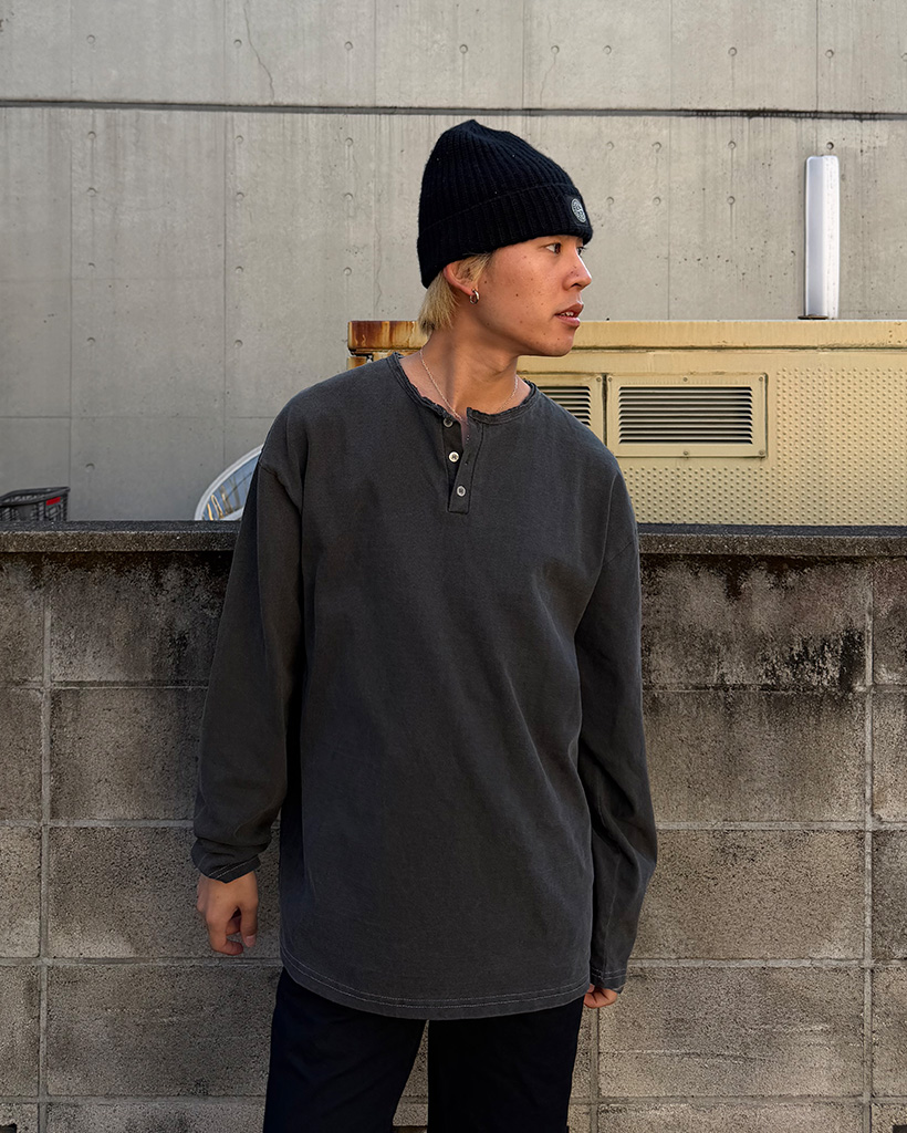 ピグメントヘンリーネックヴィンテージディテールポイント長袖Tシャツ