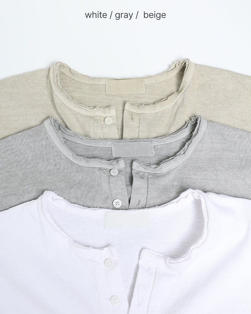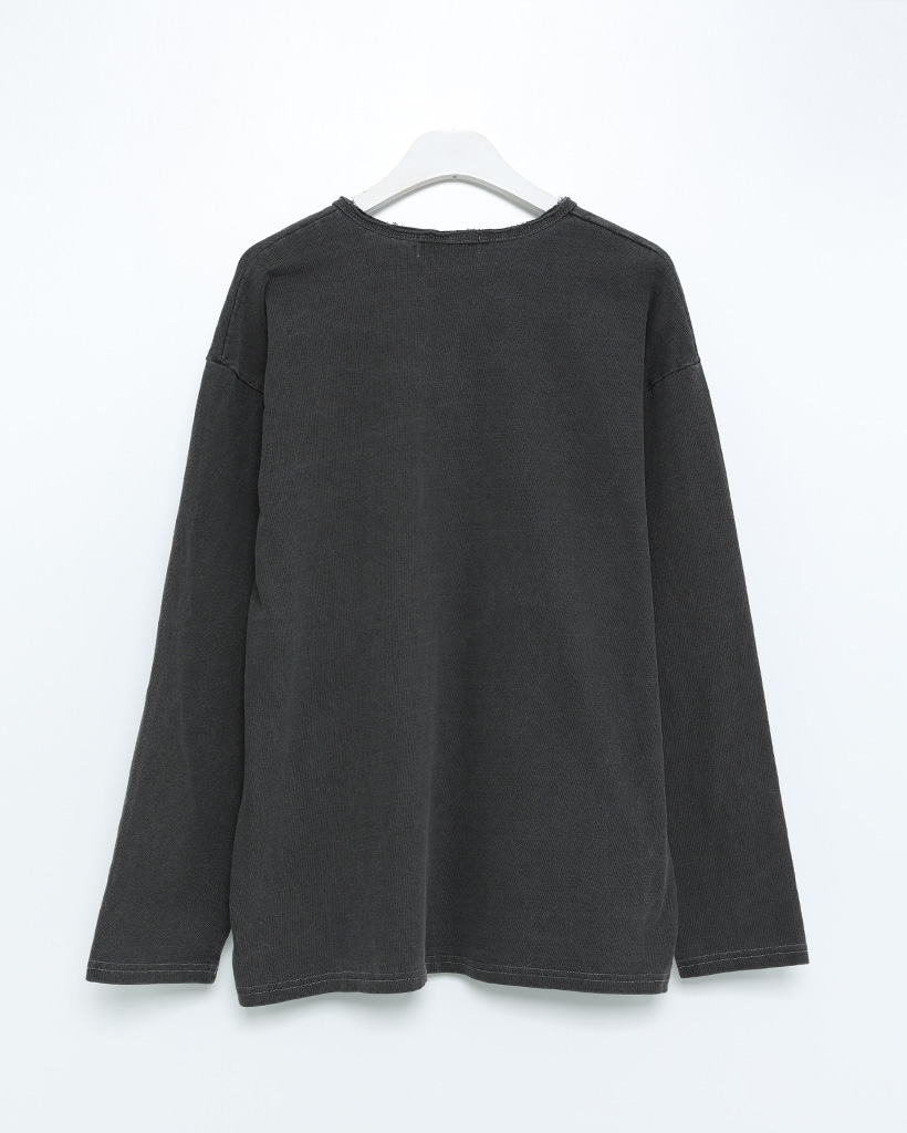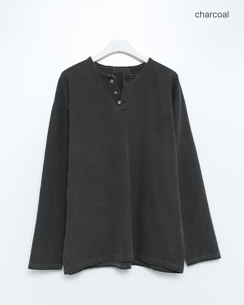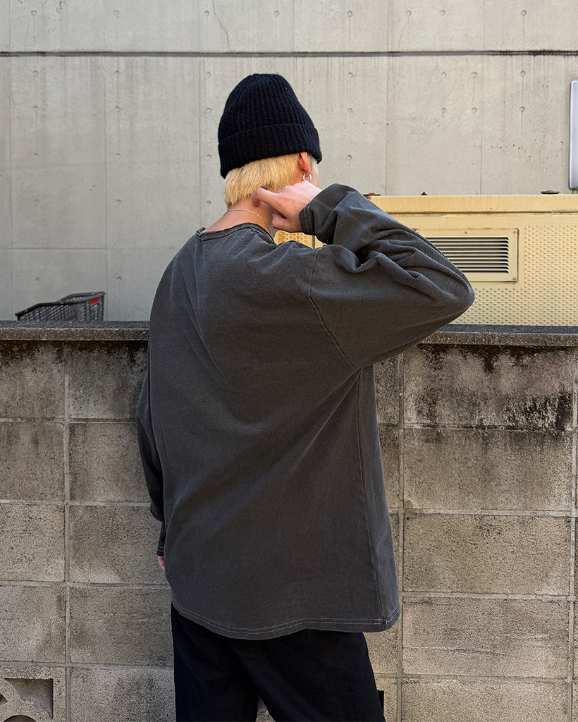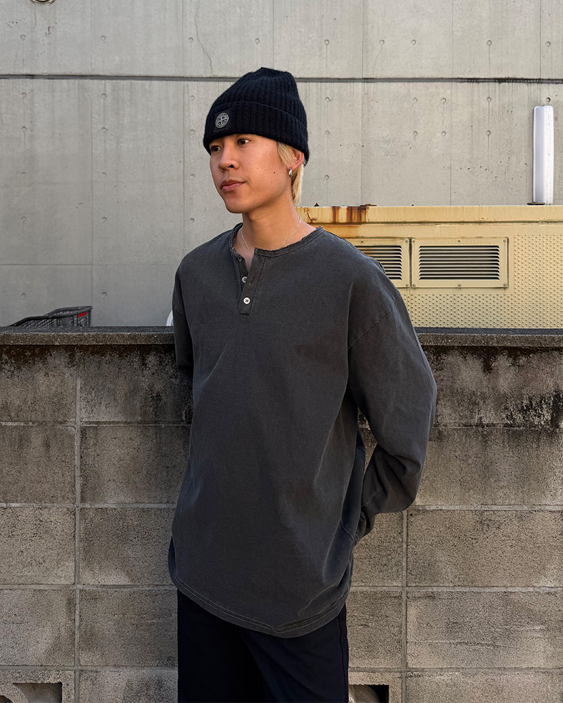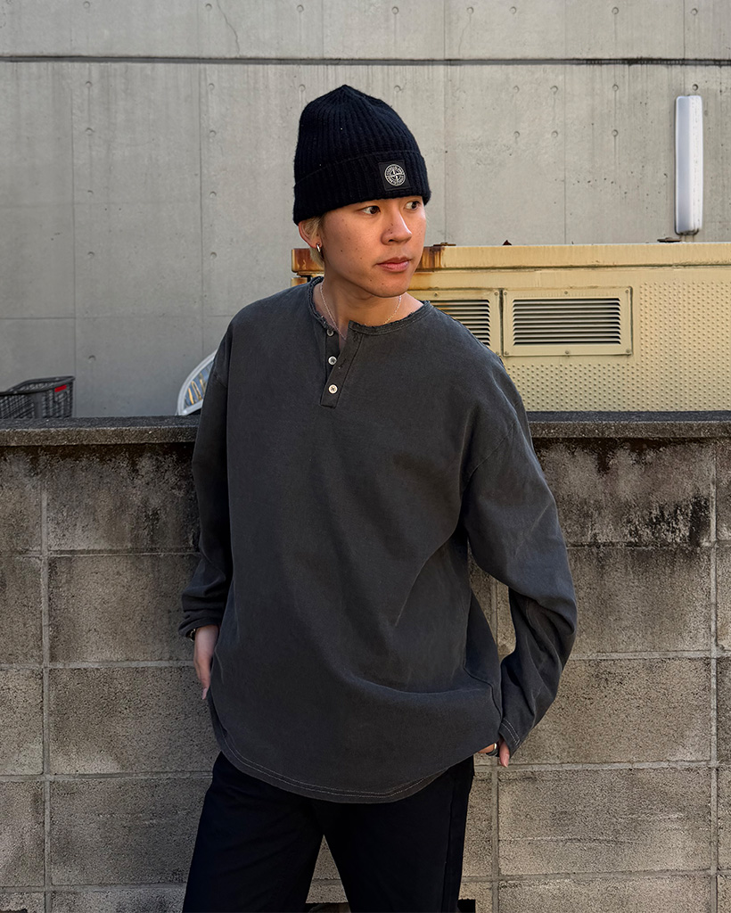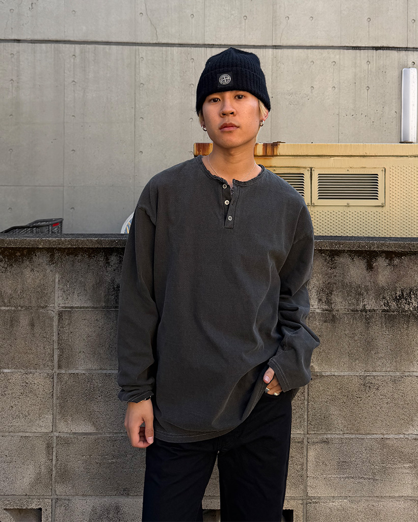 ピグメントヘンリーネックヴィンテージディテールポイント長袖Tシャツ