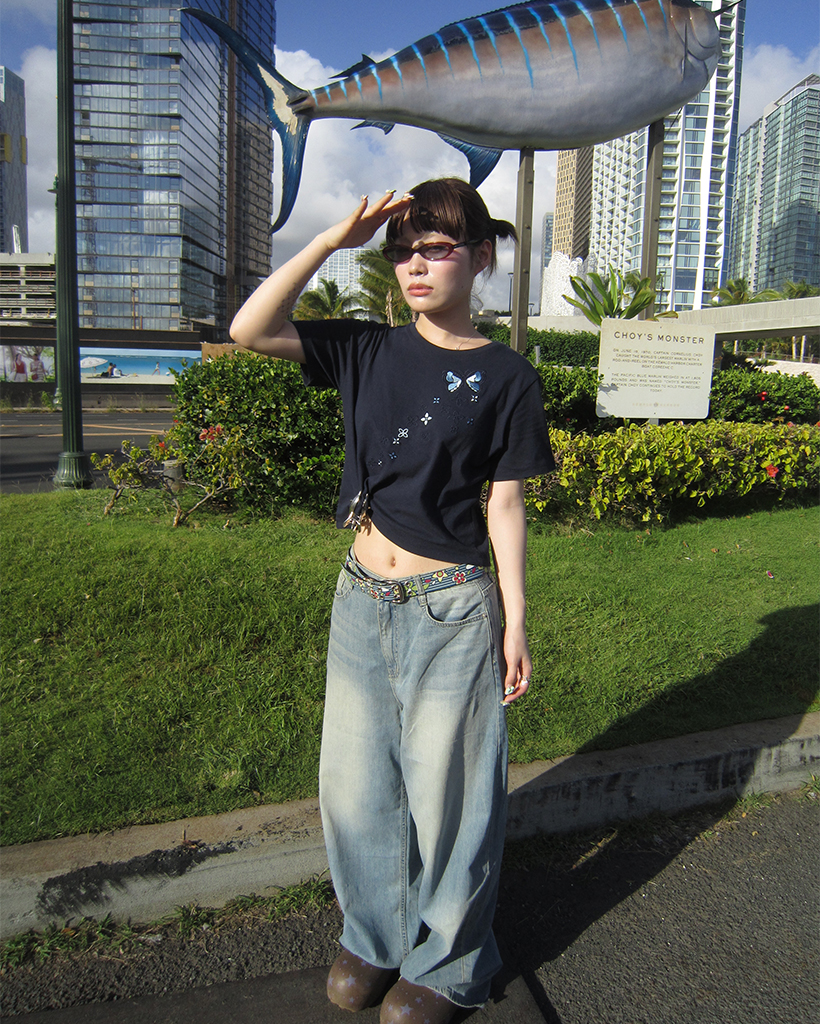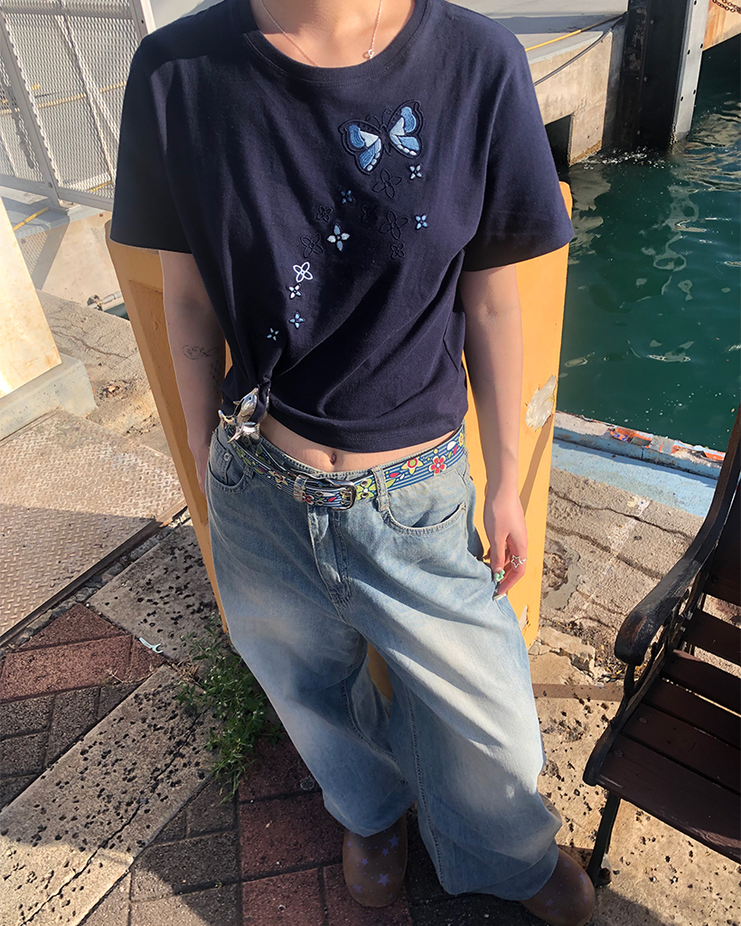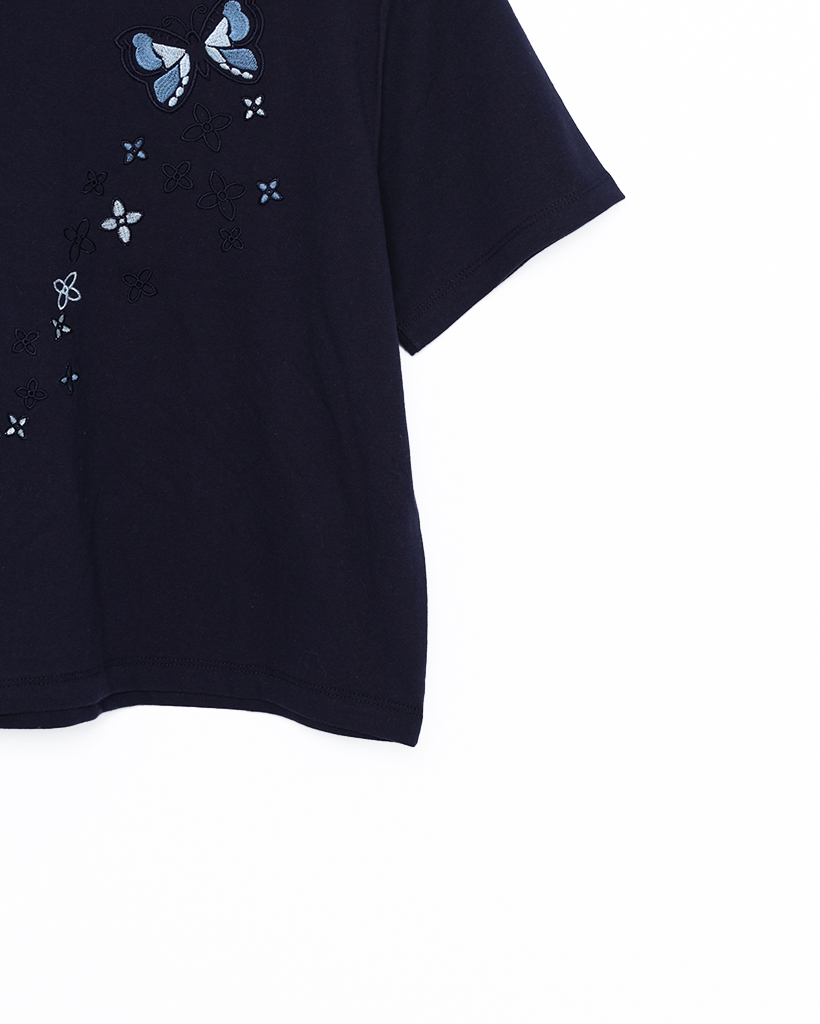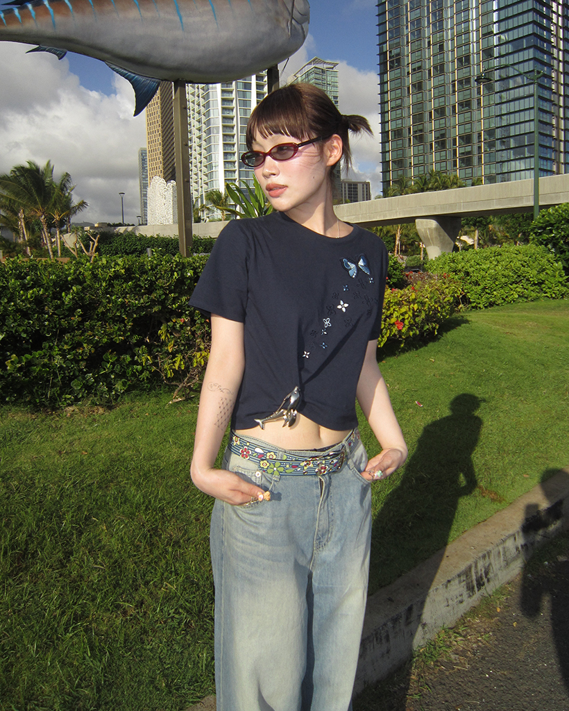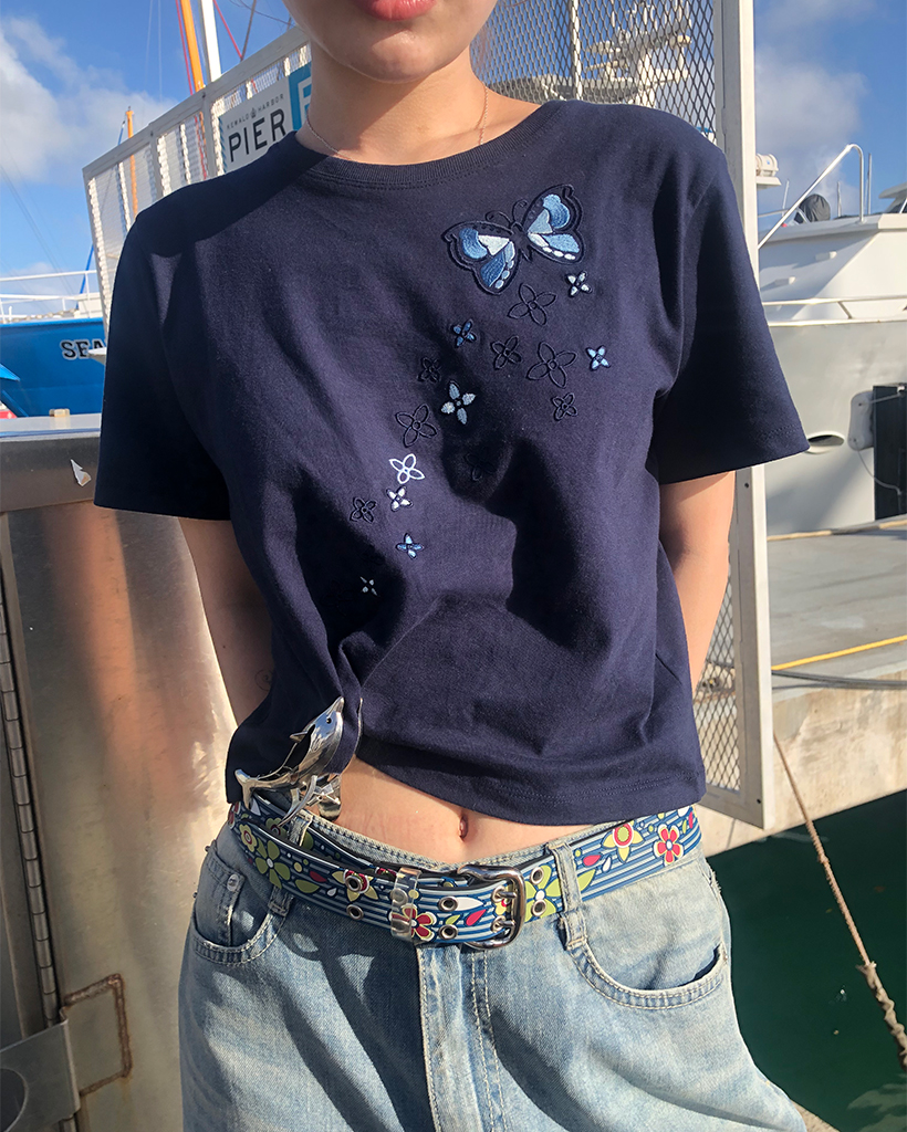 フラワーバタフライステッチクロップドハーフTシャツ