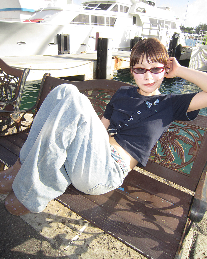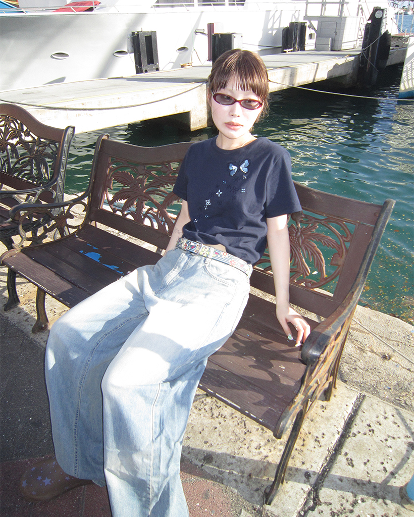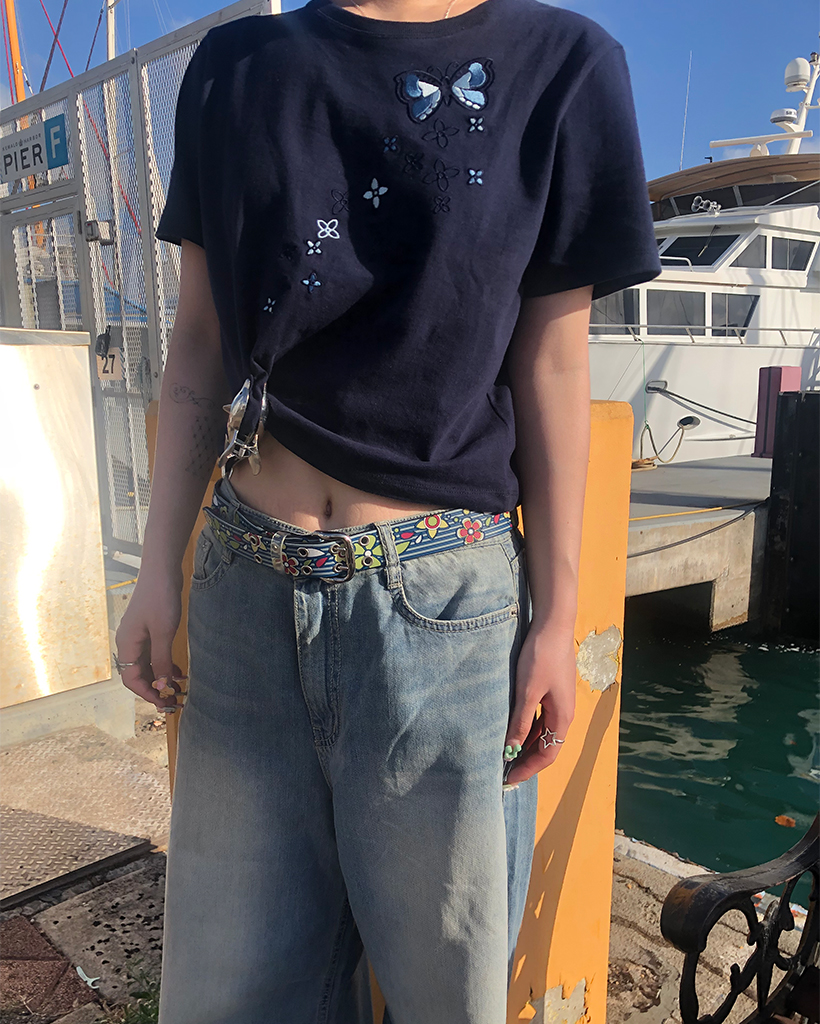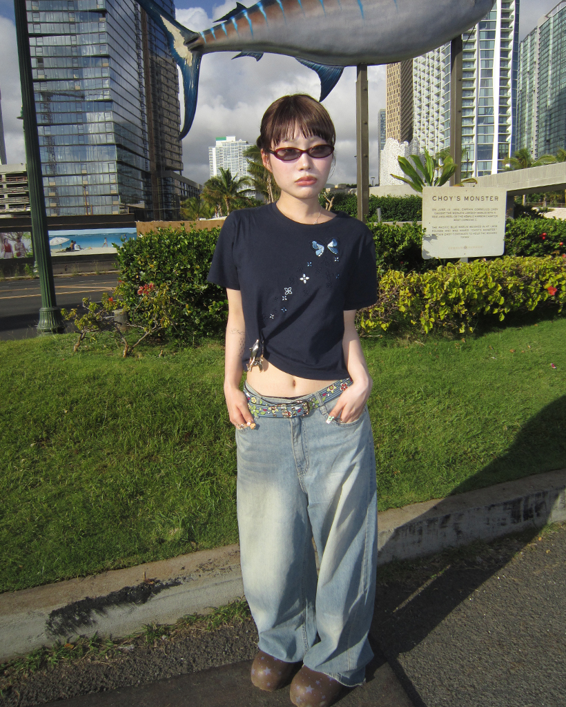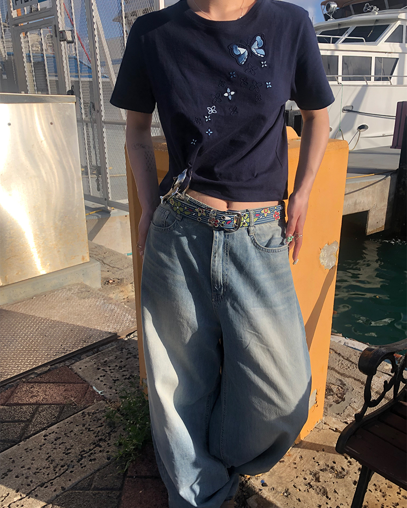 フラワーバタフライステッチクロップドハーフTシャツ