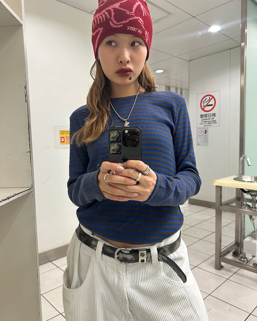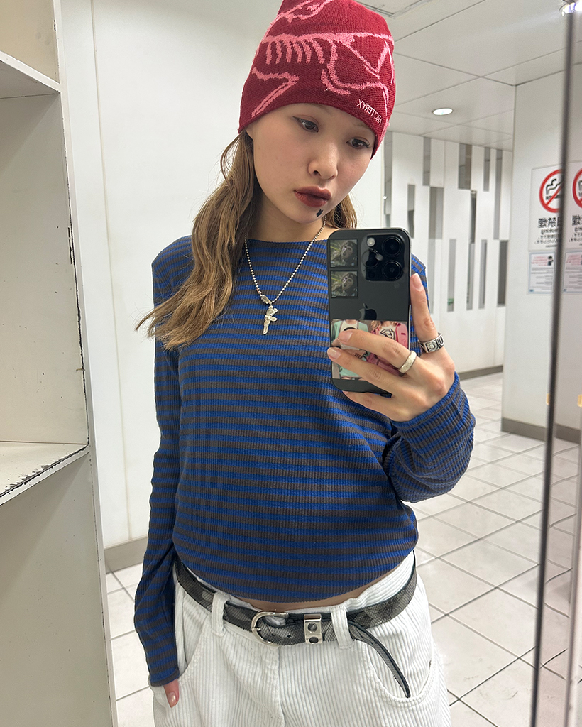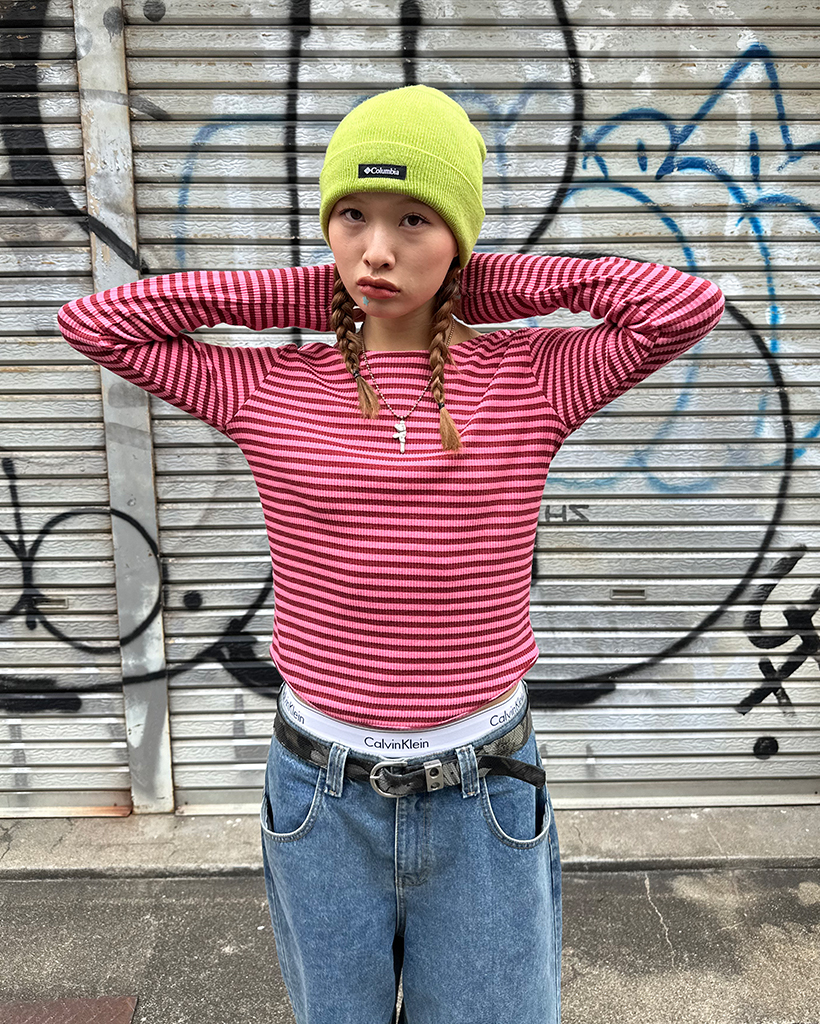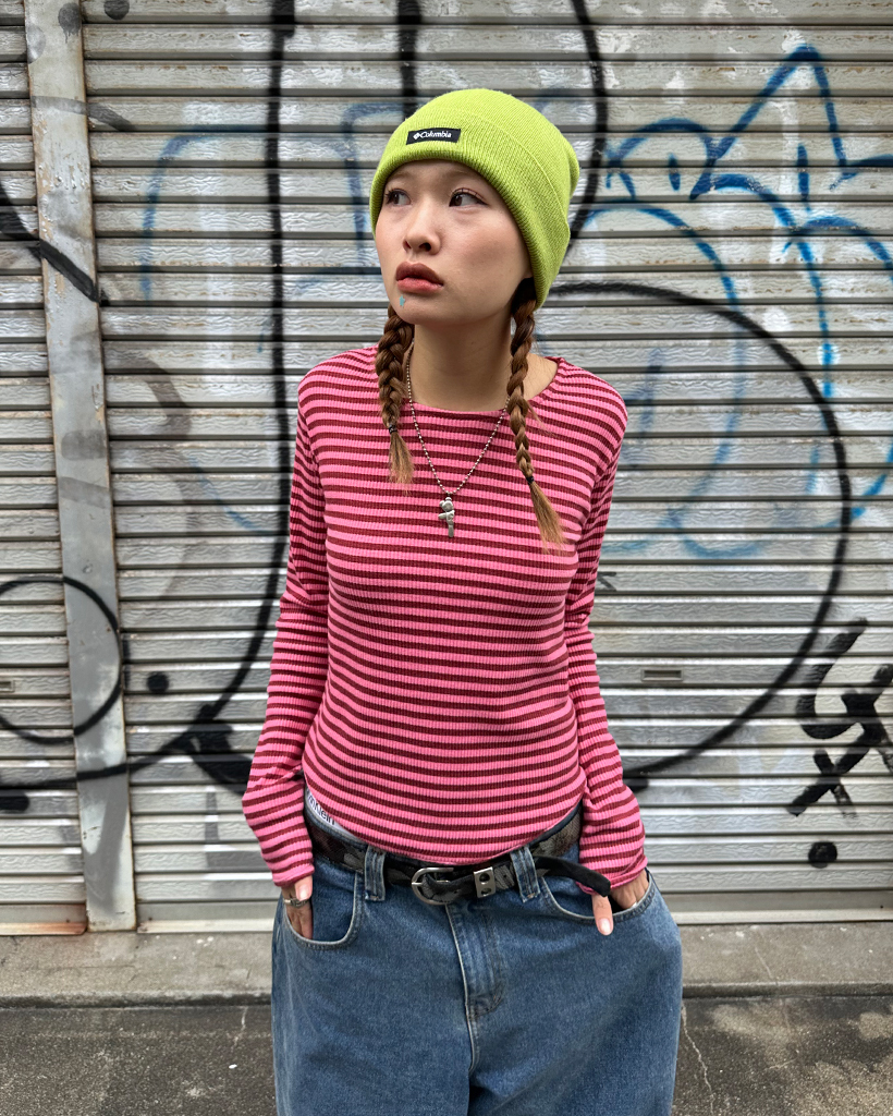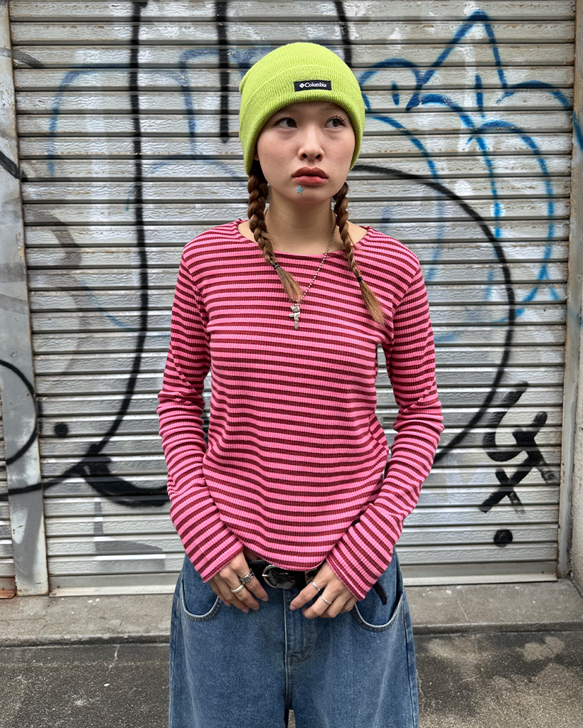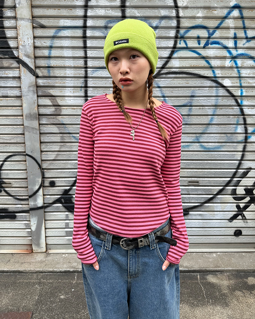オブロングネックラウンドヘムボーダーリブロングTシャツ