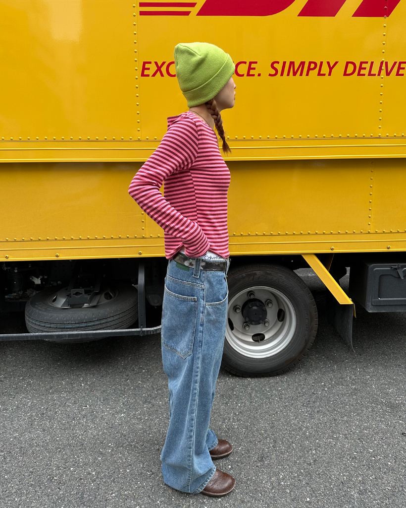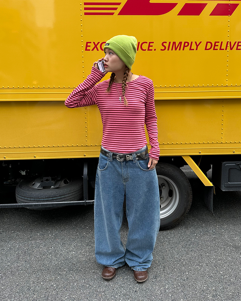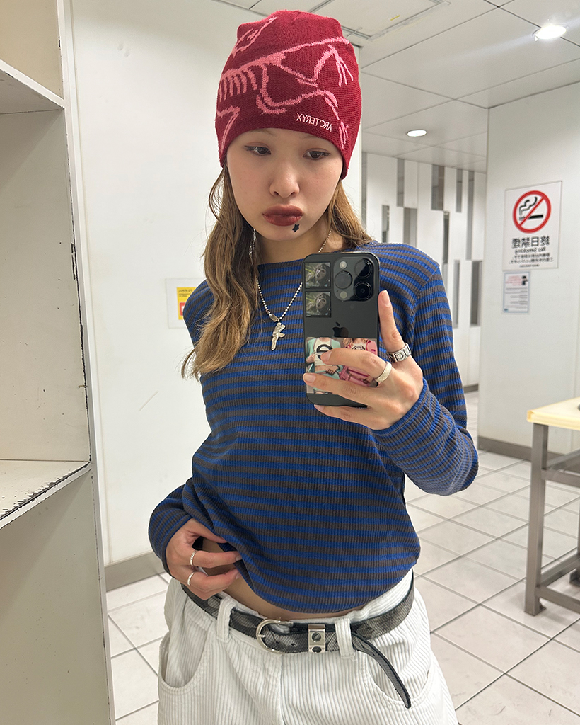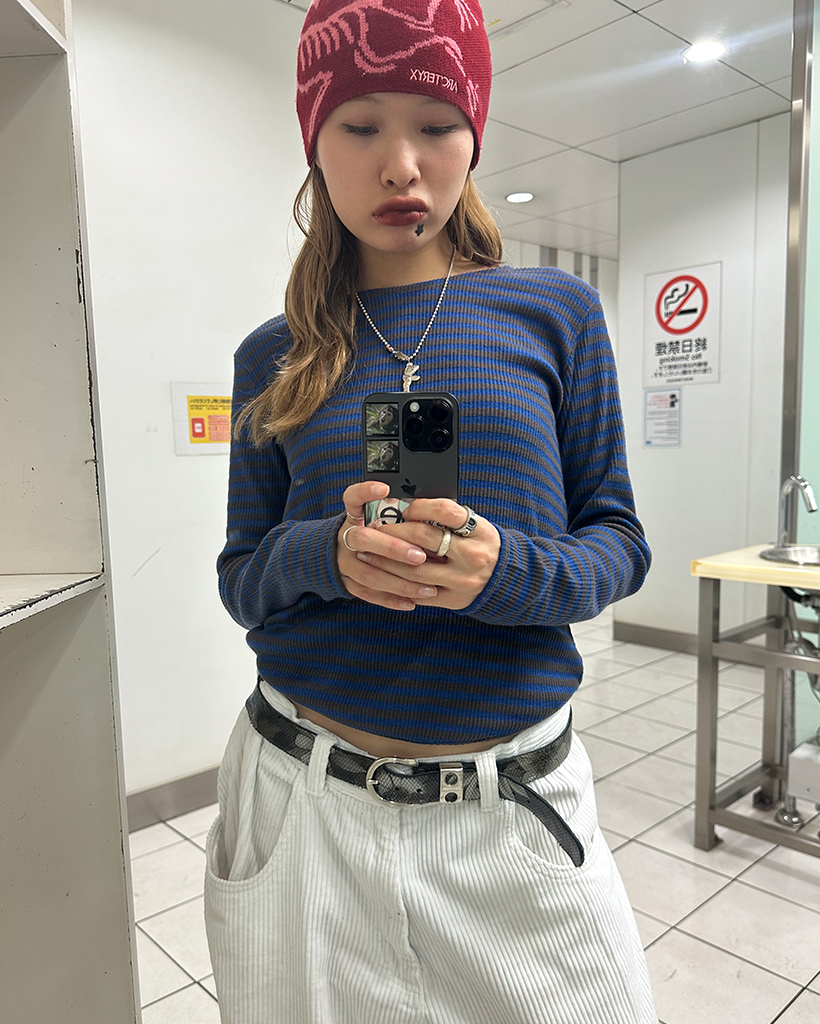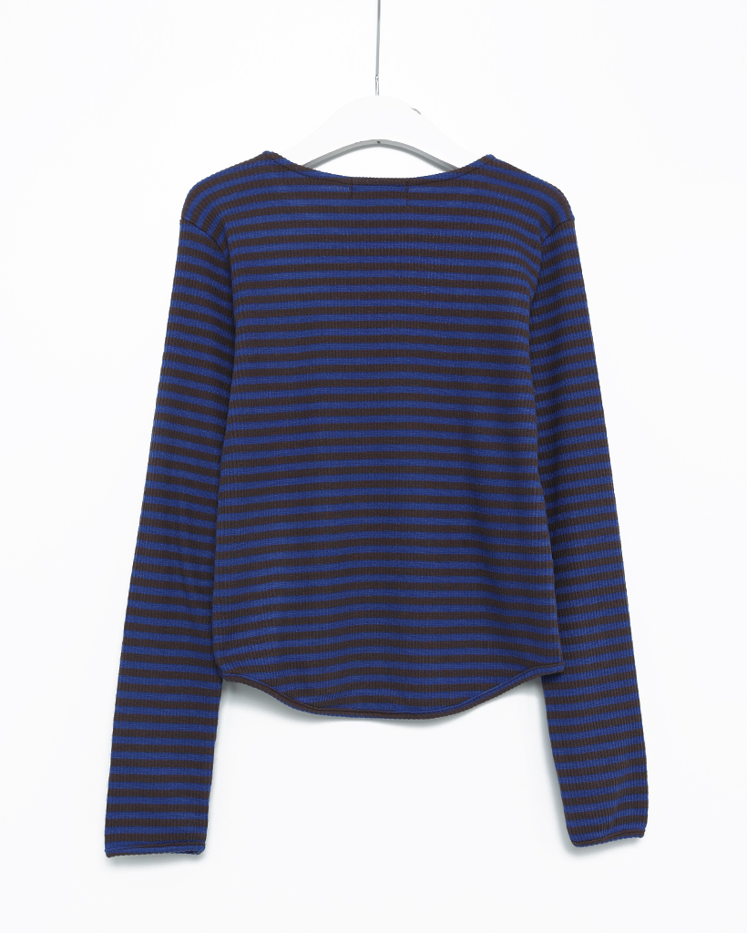 オブロングネックラウンドヘムボーダーリブロングTシャツ