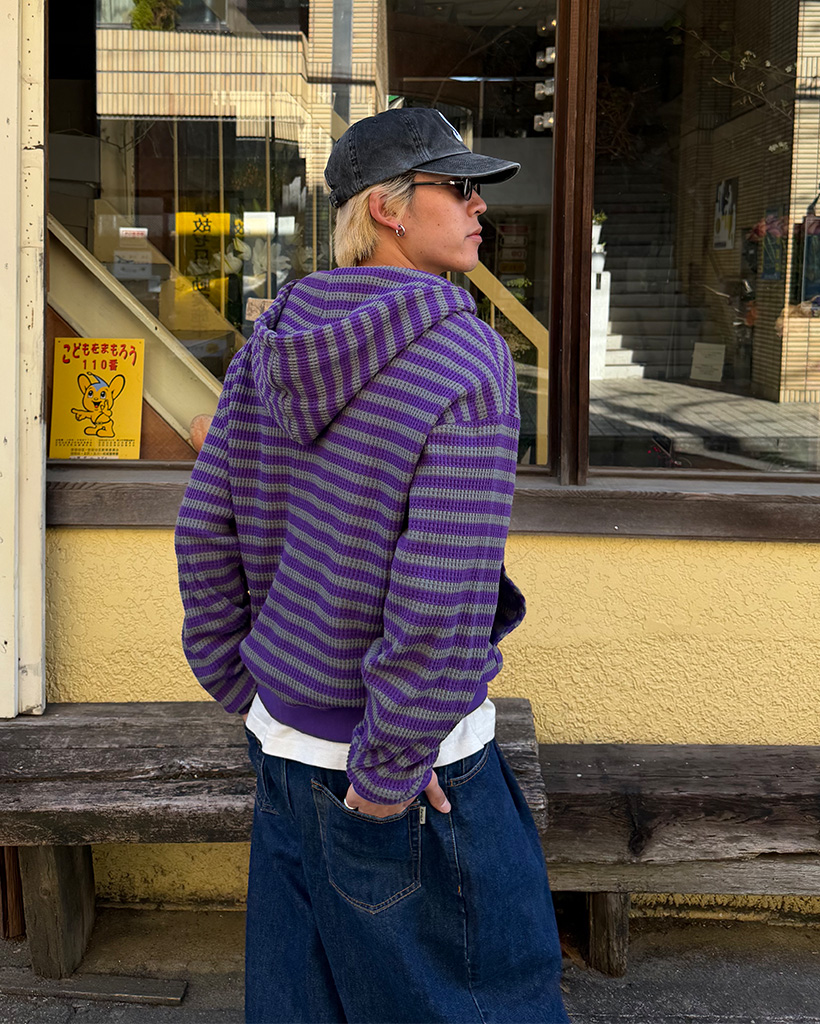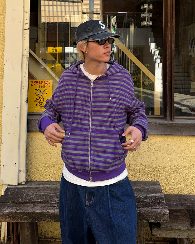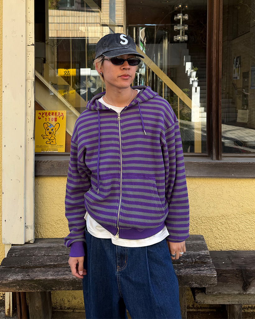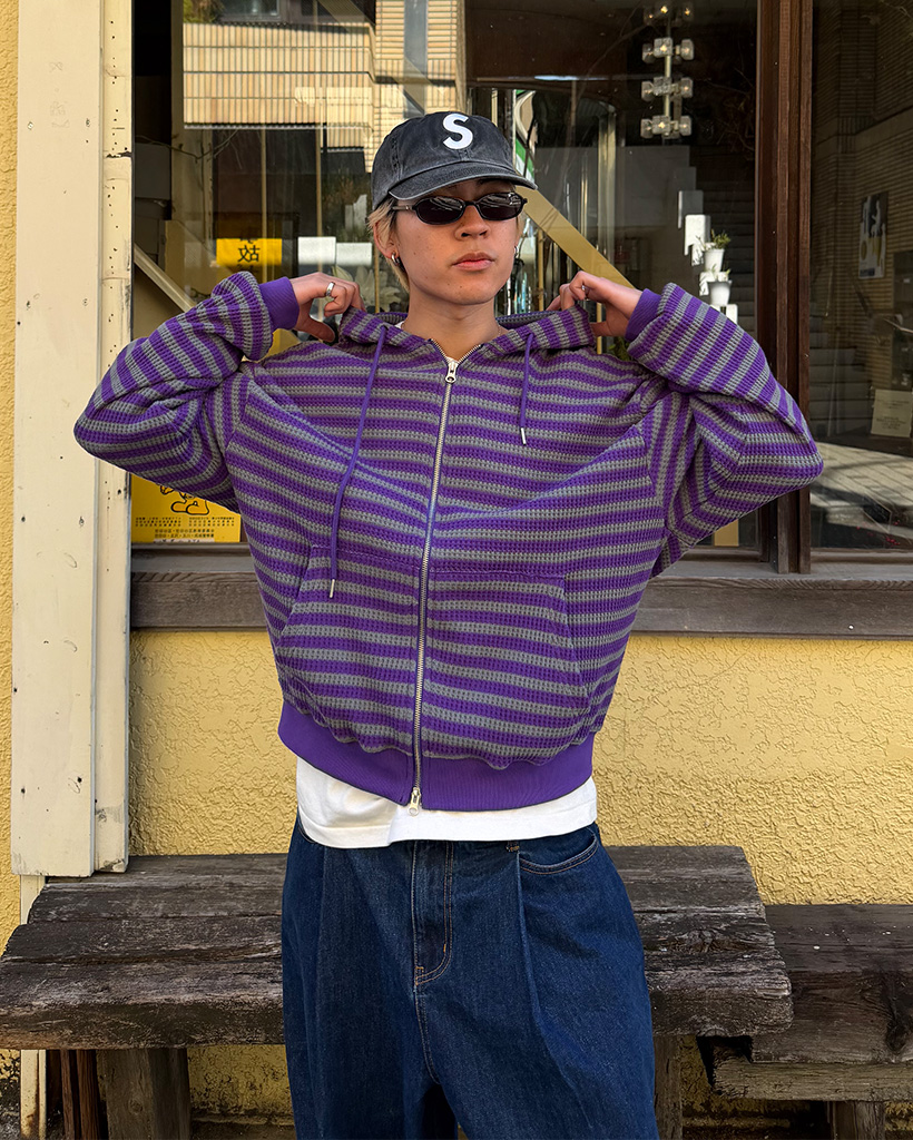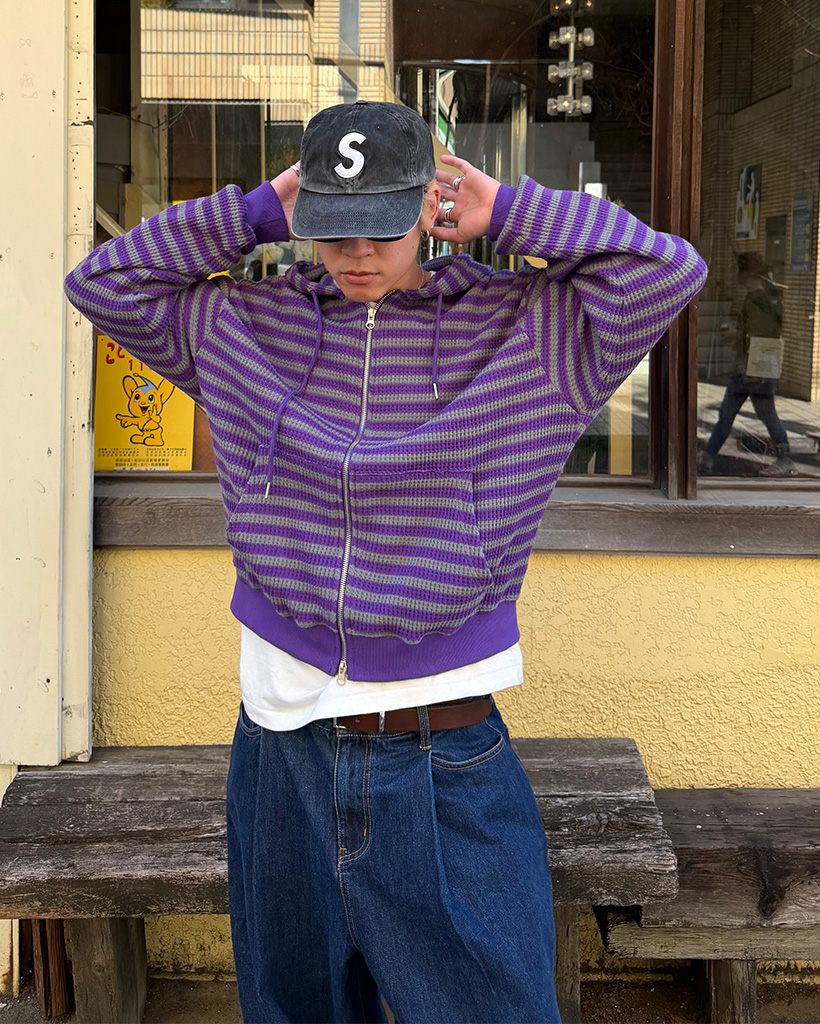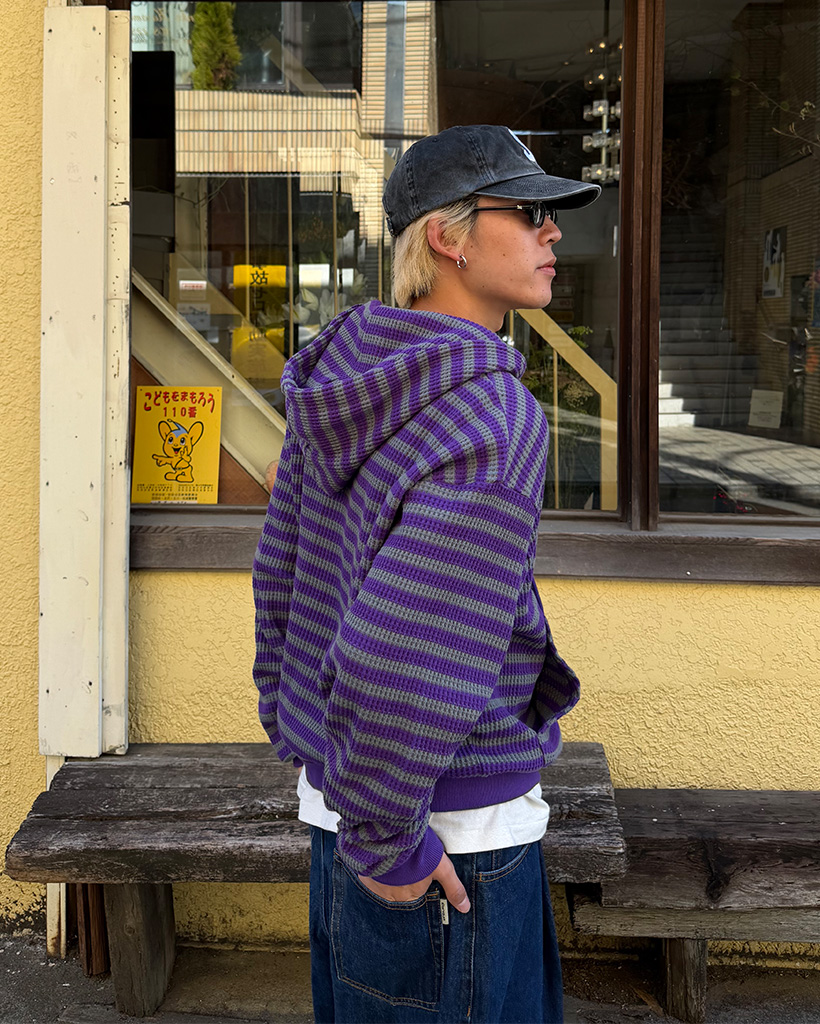 (ユニセックス)ボーダーダブルジップワッフルニットパーカー