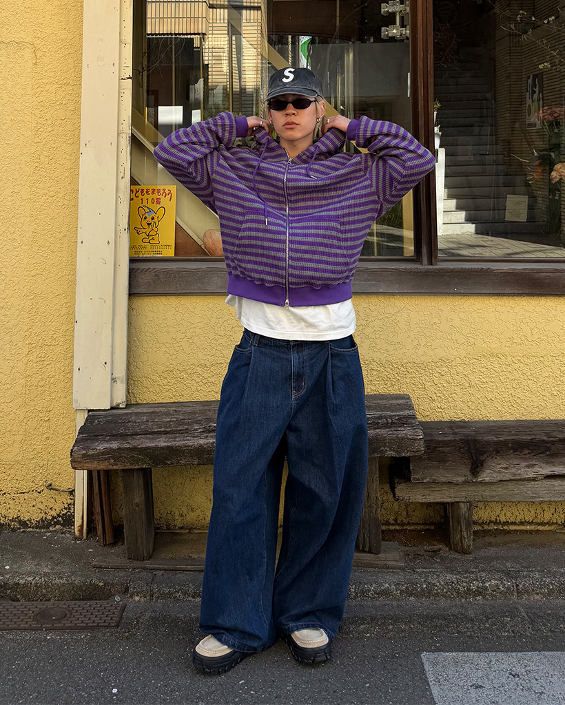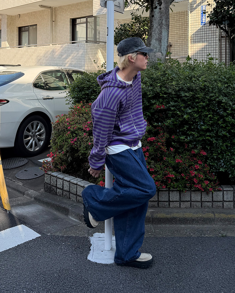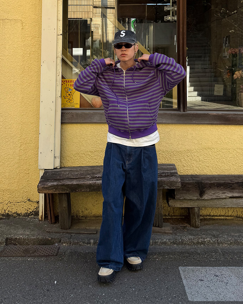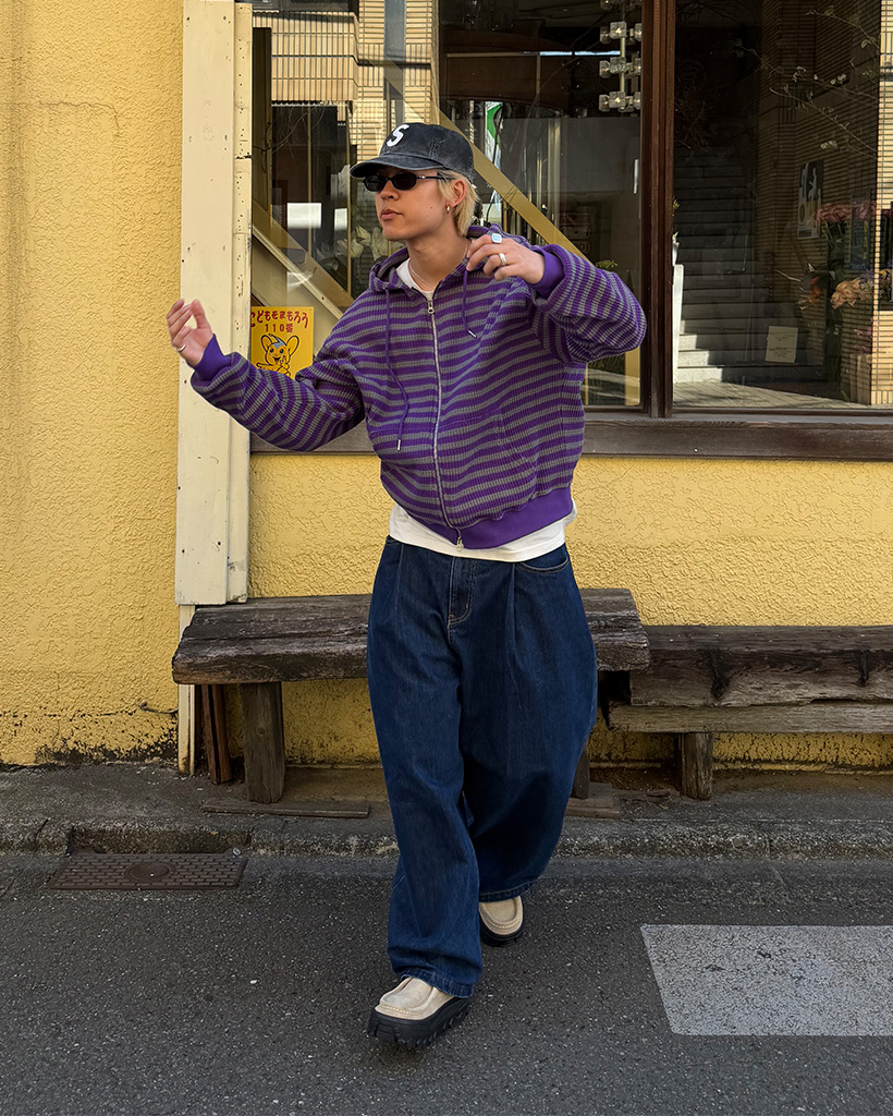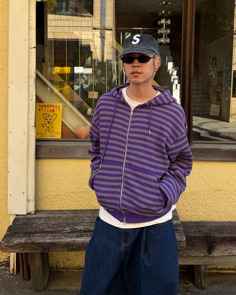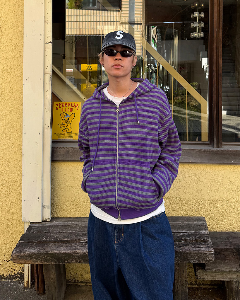 (ユニセックス)ボーダーダブルジップワッフルニットパーカー