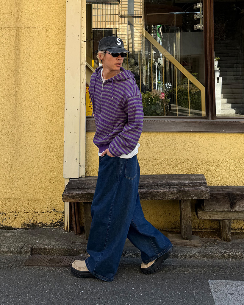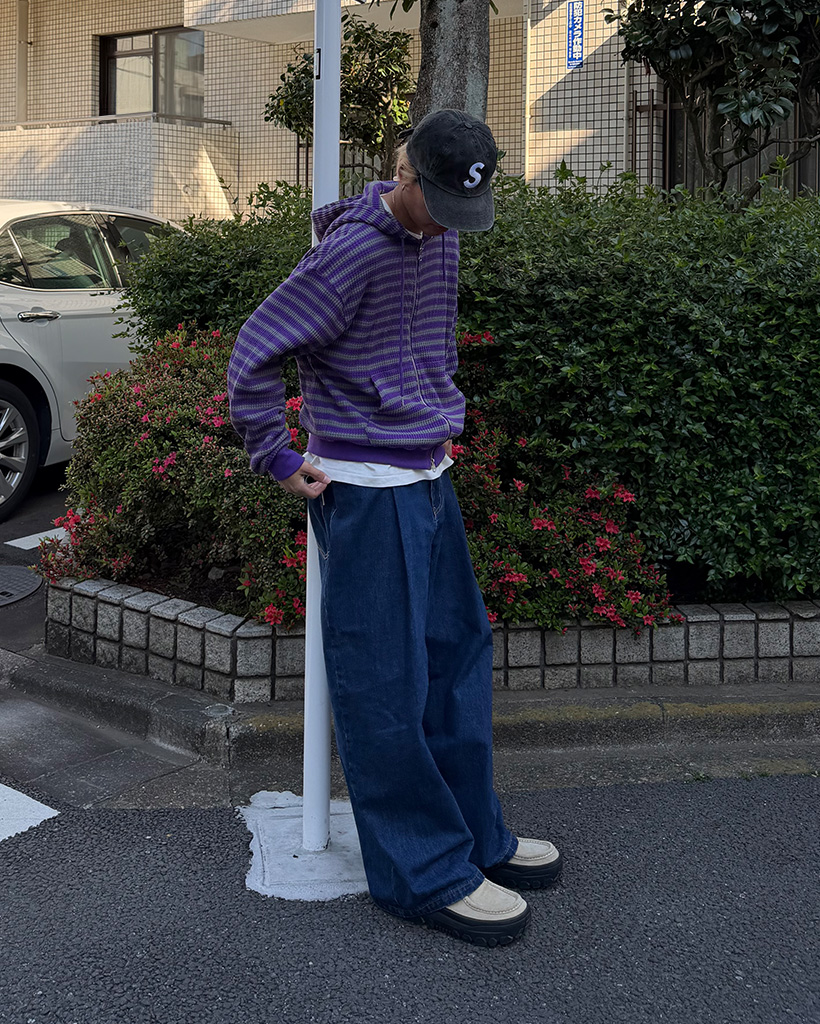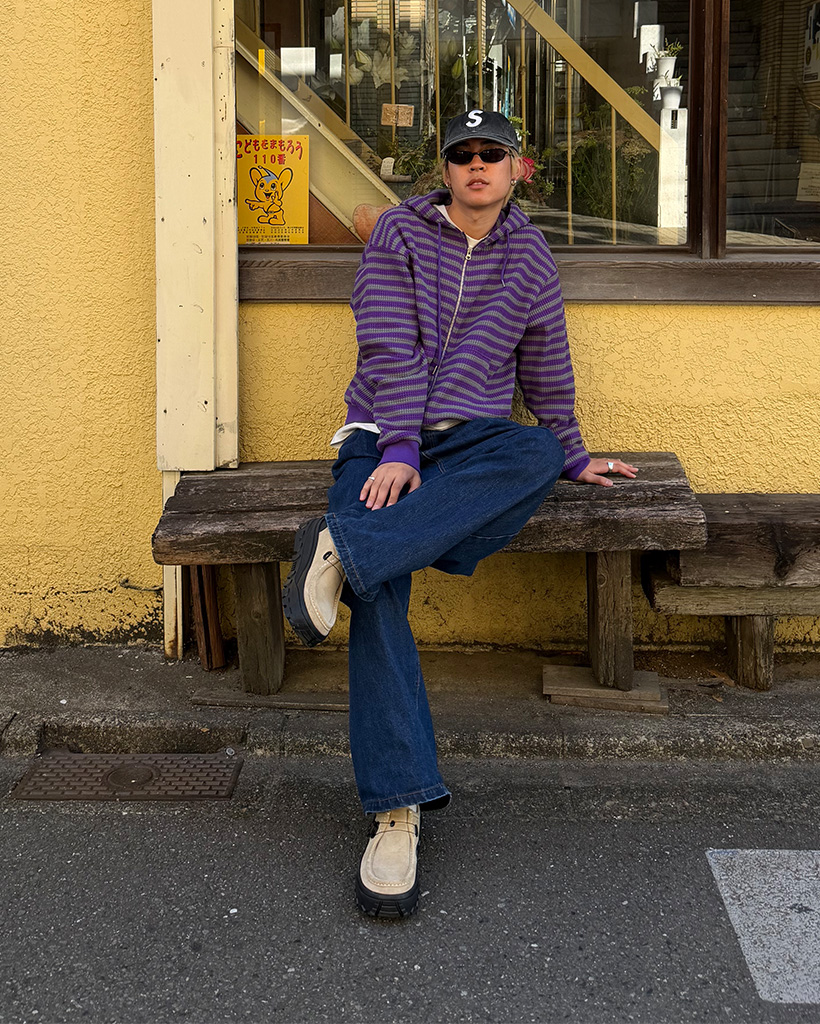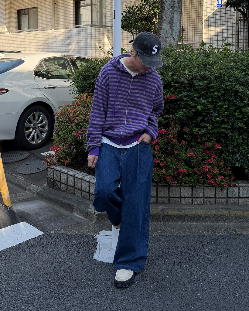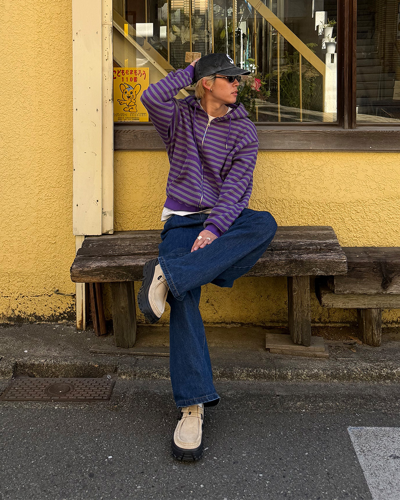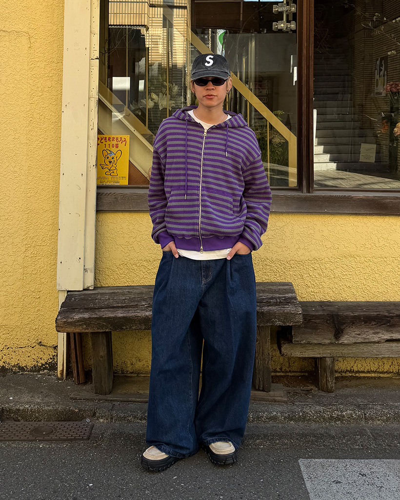 (ユニセックス)ボーダーダブルジップワッフルニットパーカー