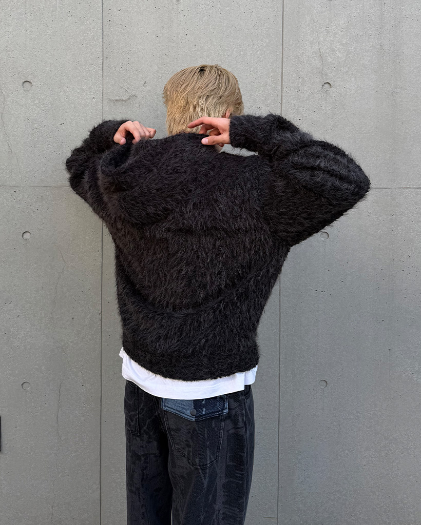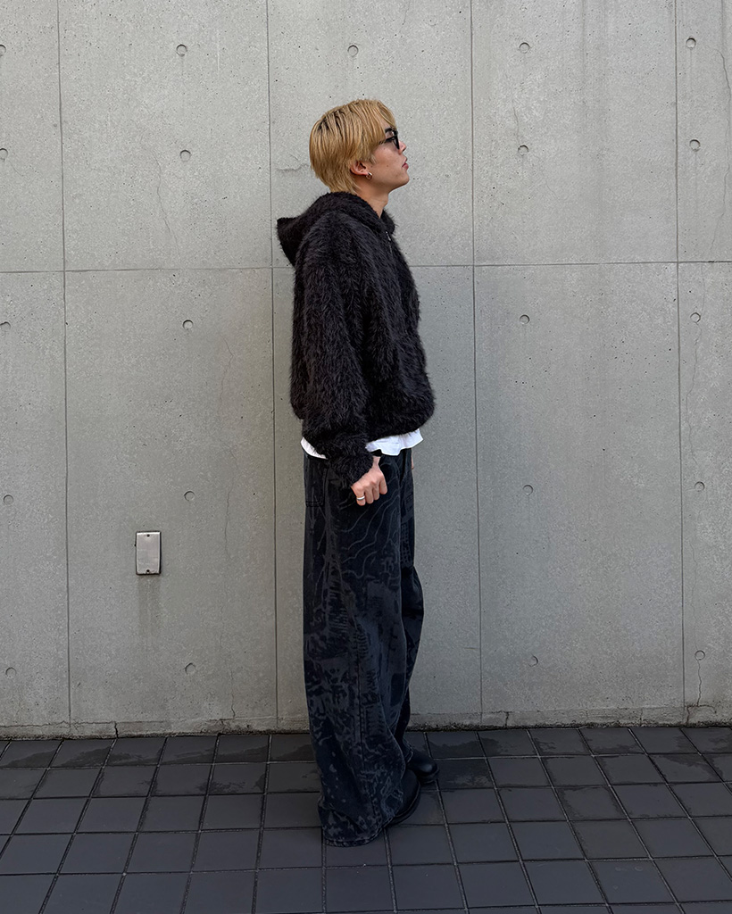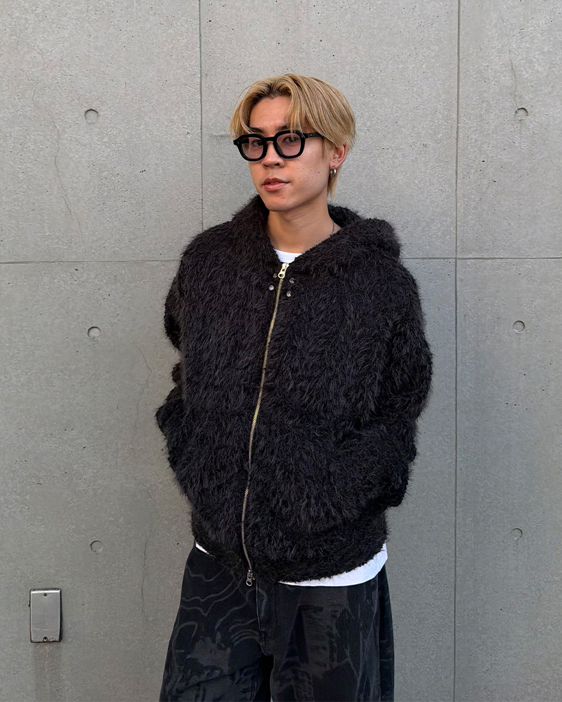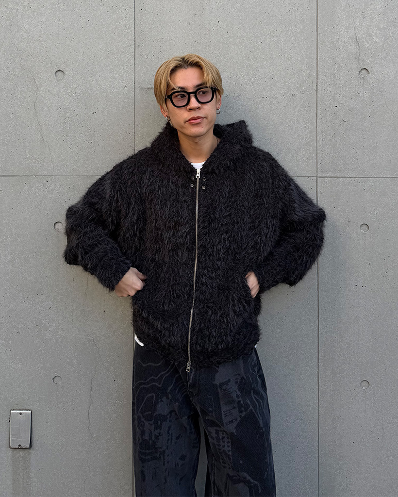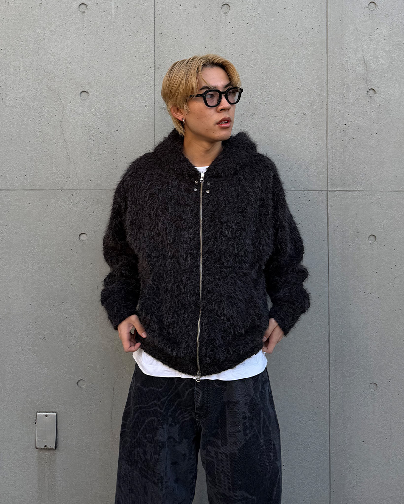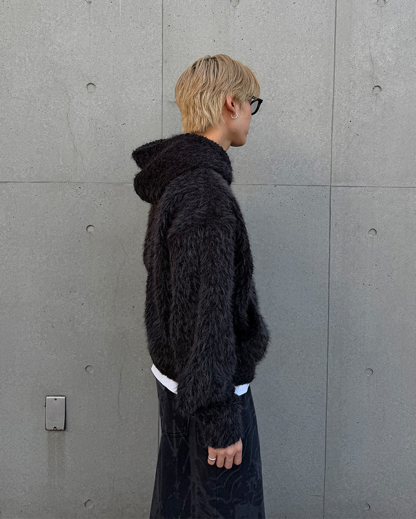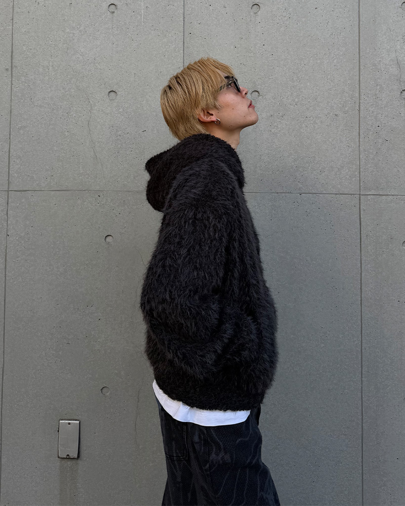 (ユニセックス)ファーファスナーフード付きカーディガン