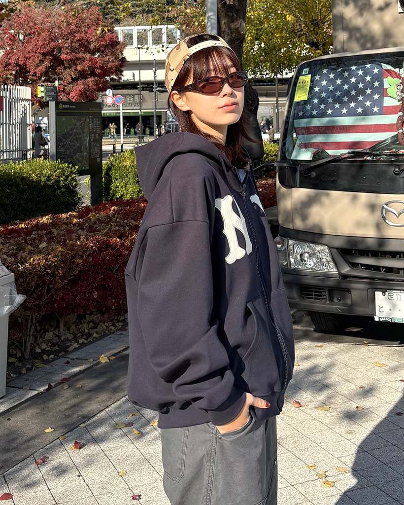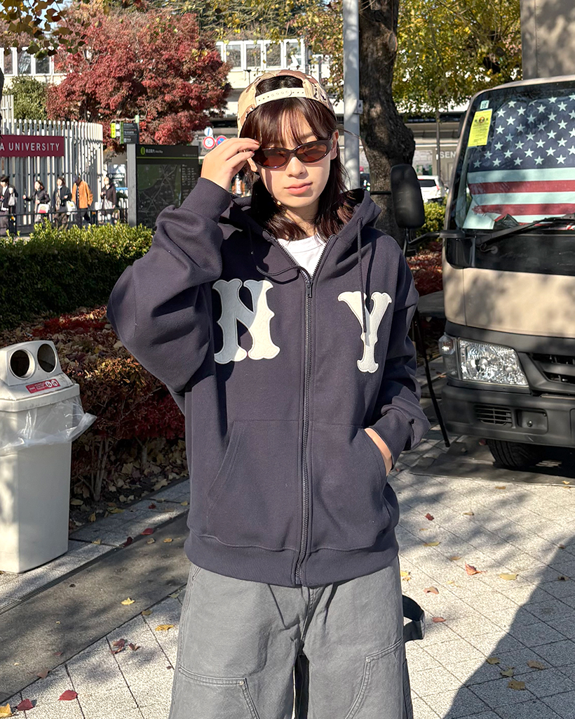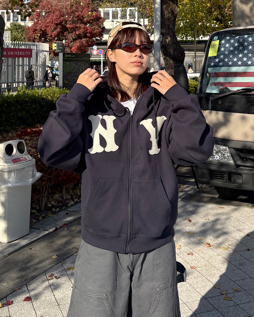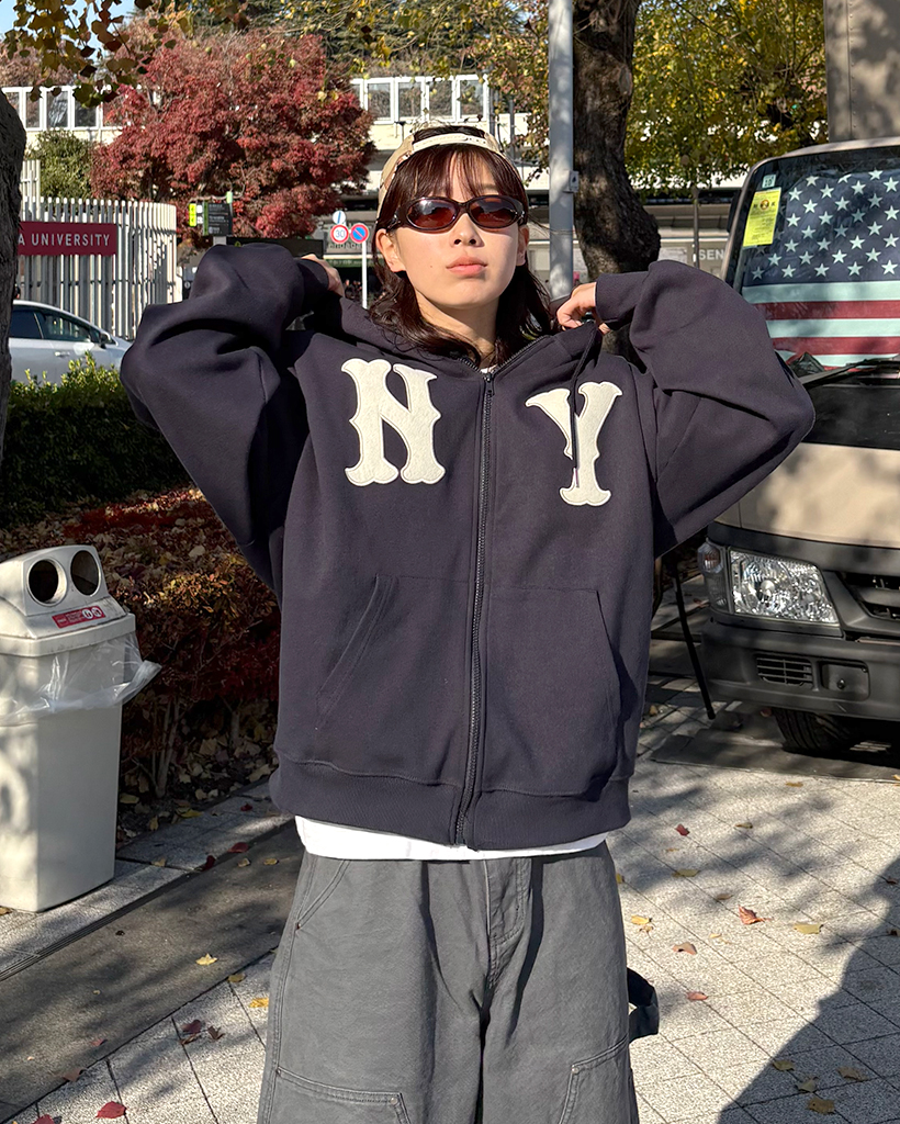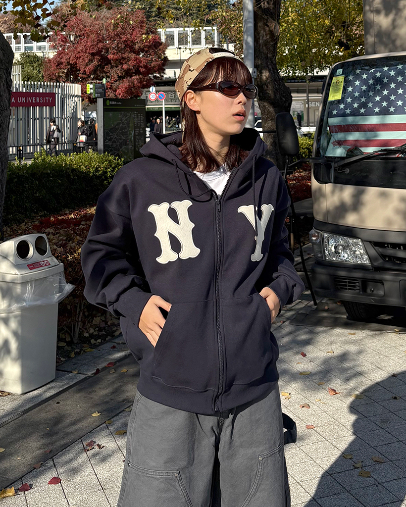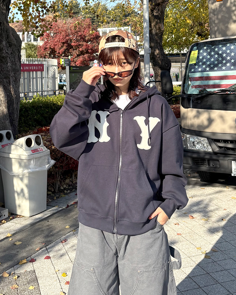 (ユニセックス)ルーズフィットNYフード付きジップアップ