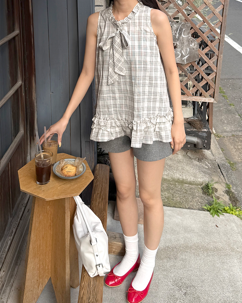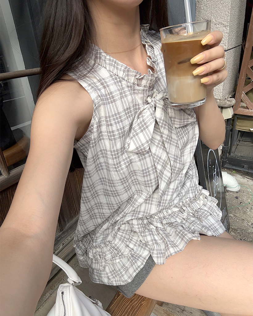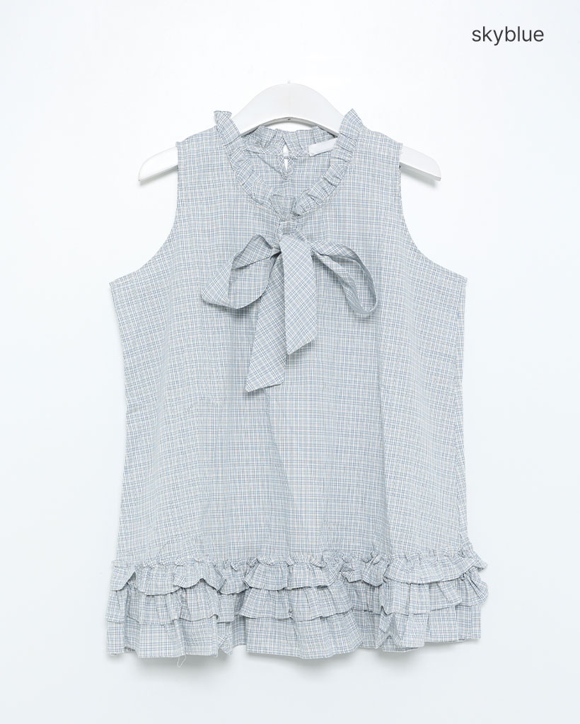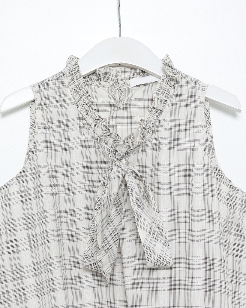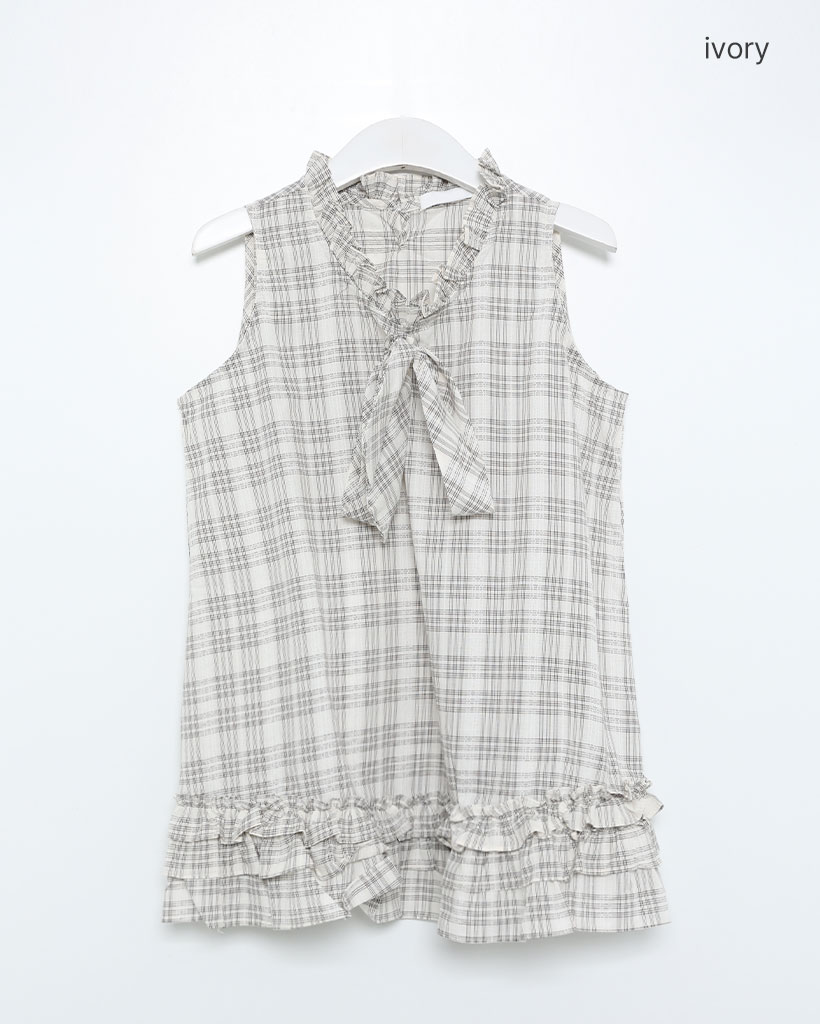 チェックリボンネックポイントノースリーブブラウス