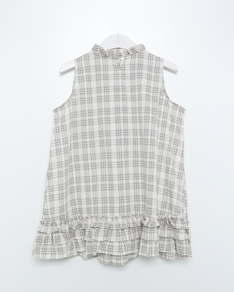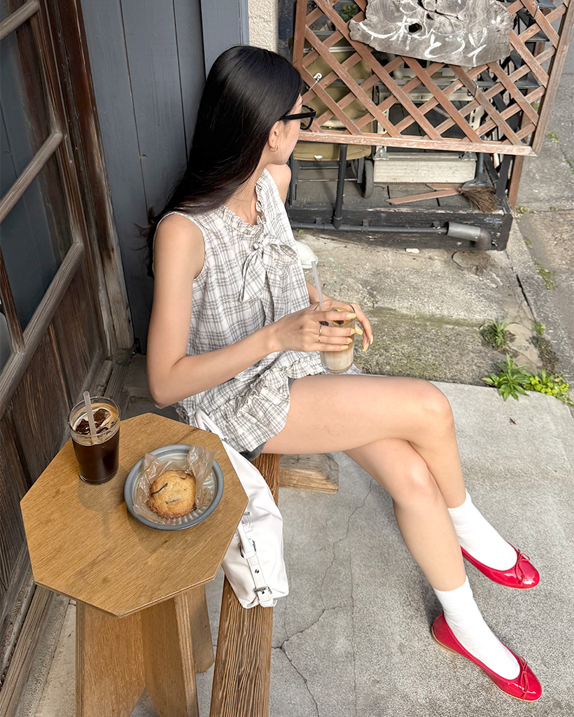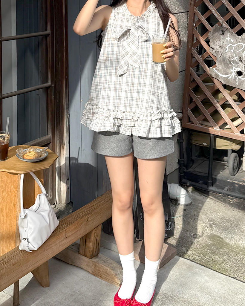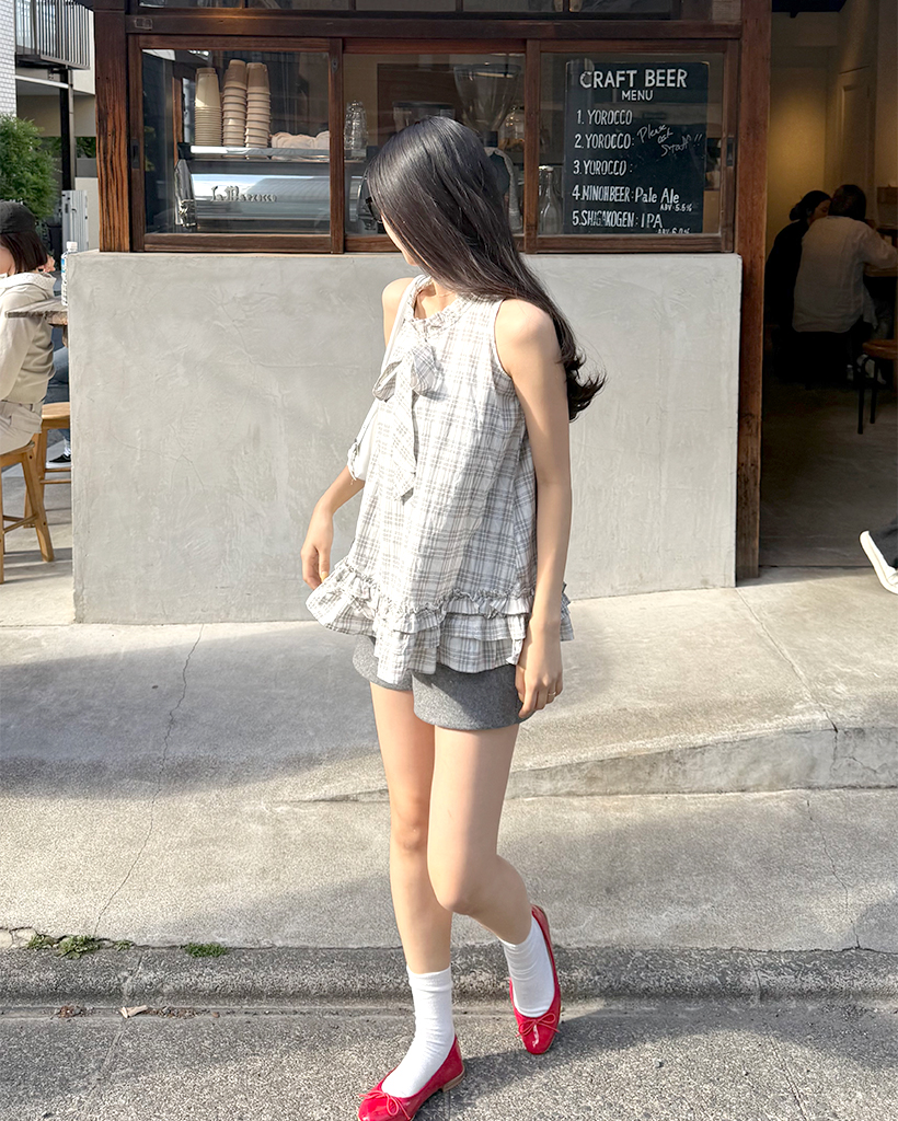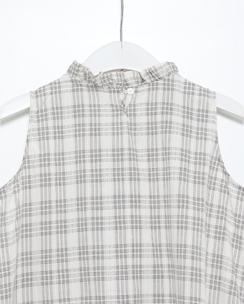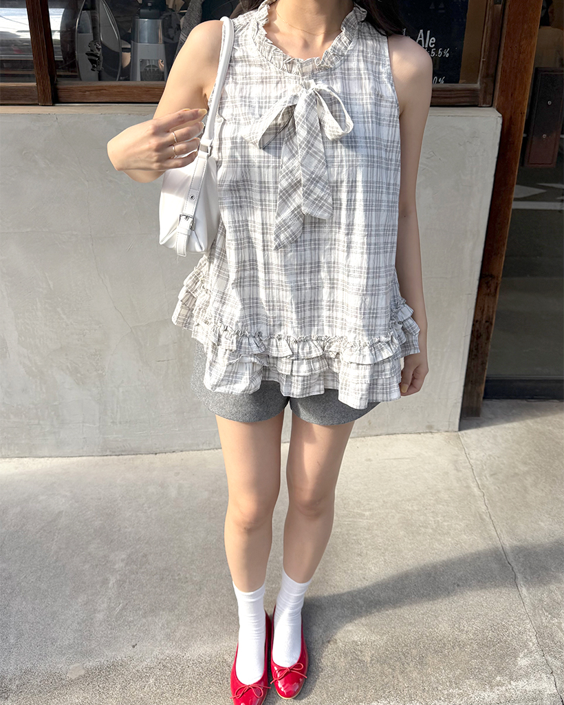チェックリボンネックポイントノースリーブブラウス