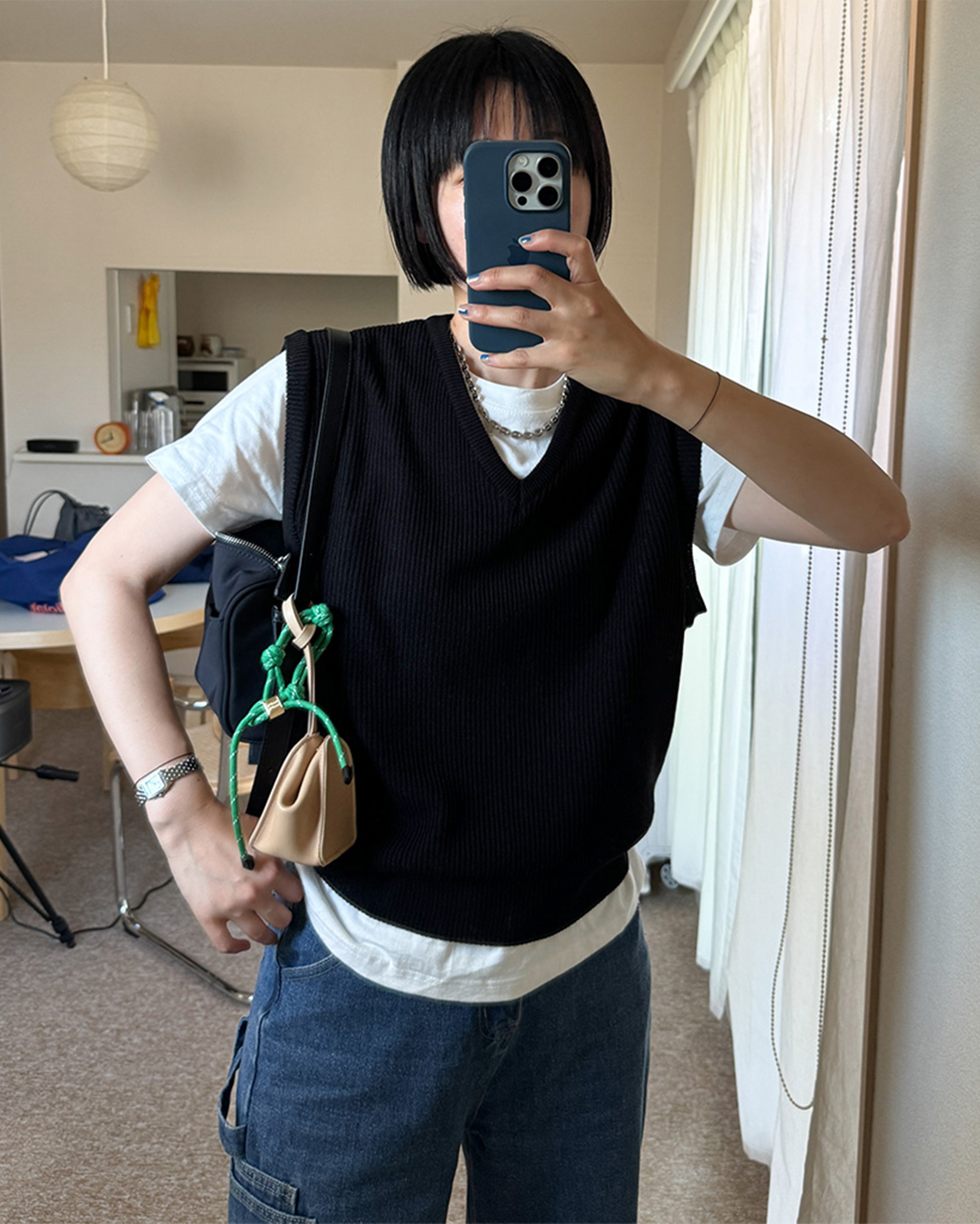 - Tipsドライタッチなアクリル糸を薄手の畦編みに仕立てたVネックニットベスト。