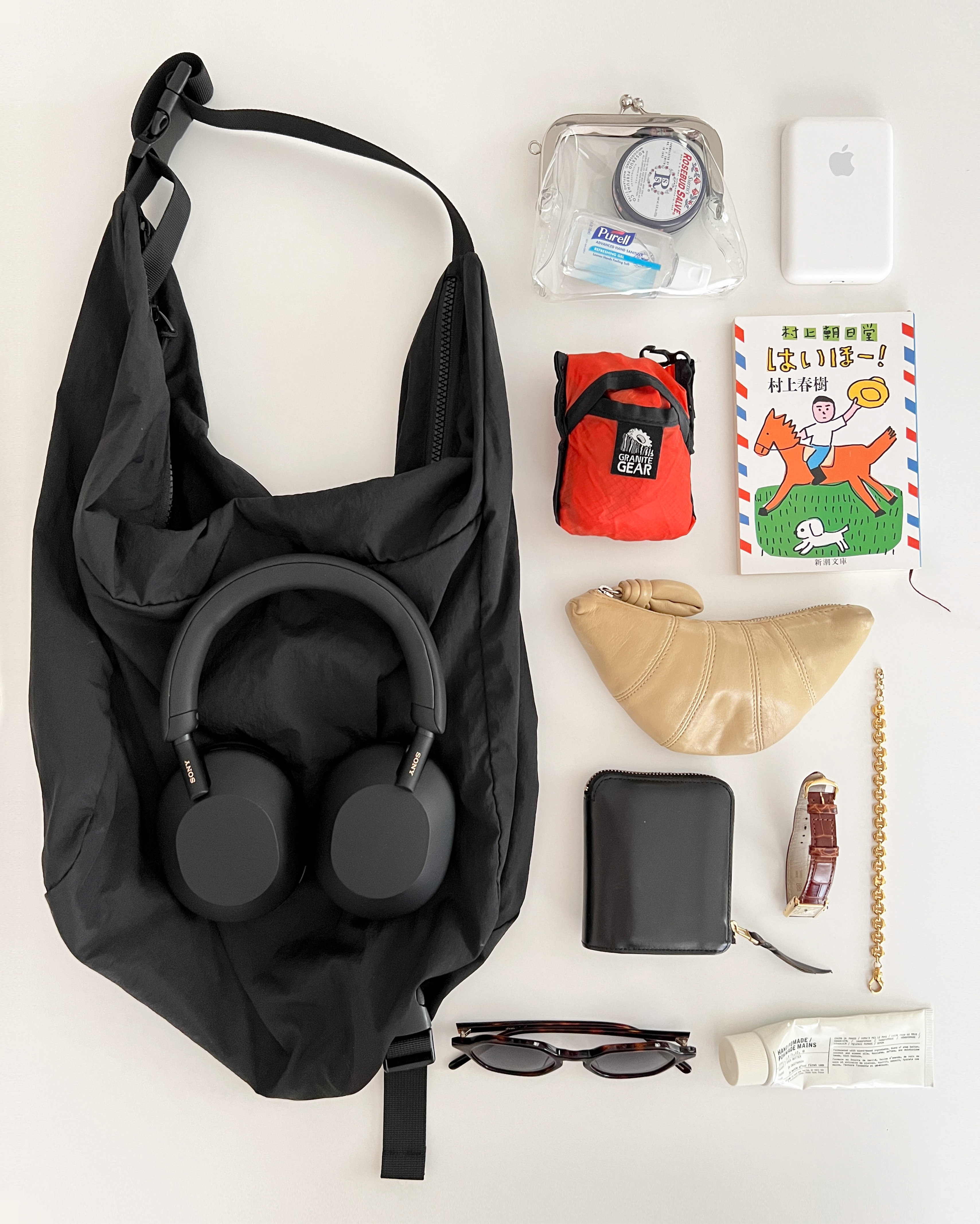 横から見ると上が長辺・下が短辺の台形(舟形)で、底のマチがしっかりと設けられた本体なので、ショルダーと底部分のそれぞれのストラップを調整することで荷物の量に応じて、体に合ったポジションで持ちやすいシルエットになっています。