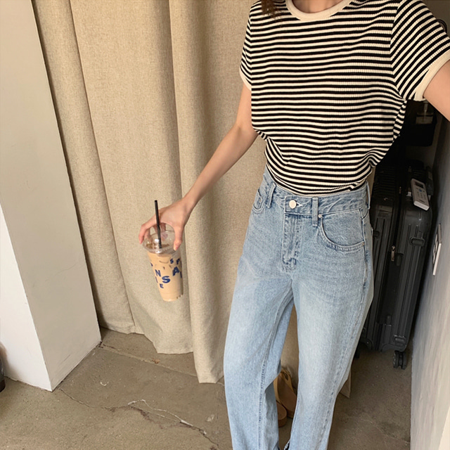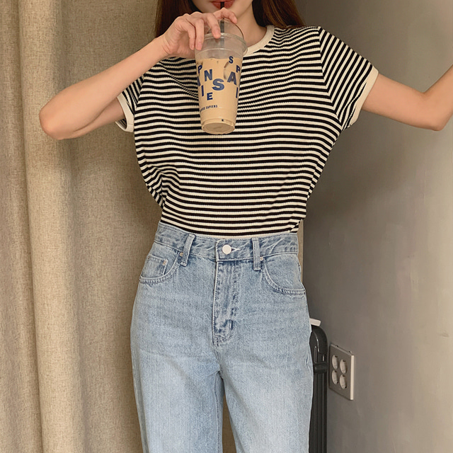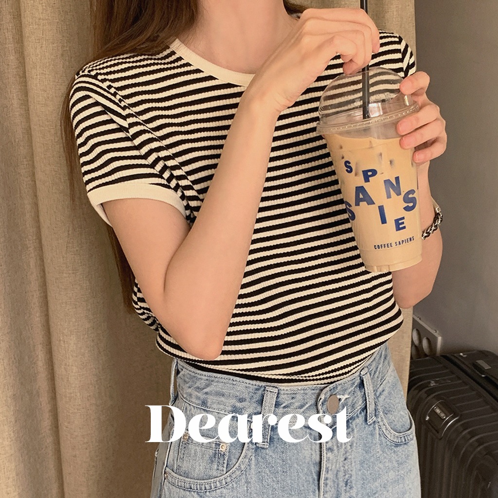 [Dearest] ボーダー柄リブTシャツ(ブラック)