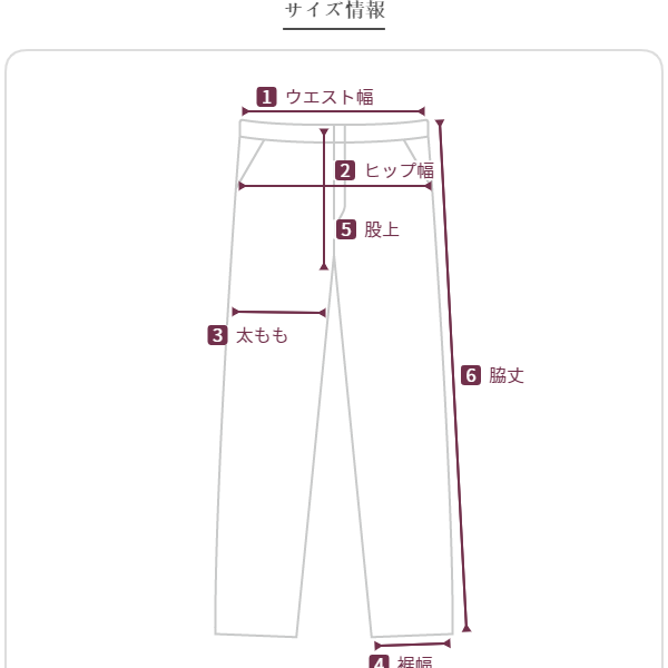2 ヒップ幅 | 50 19.5 | 52 20.5 | 54 21.5 |