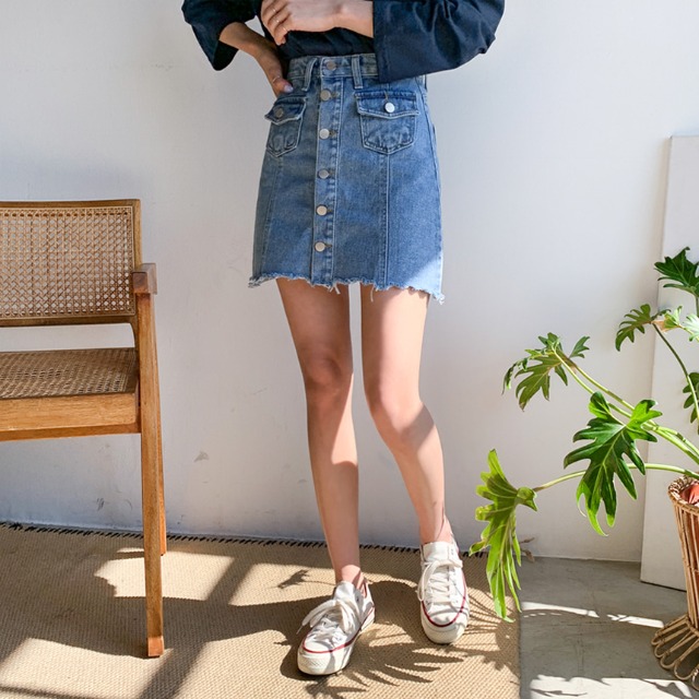 フロントボタン両ポケットラフカッティングデニムミニスカート