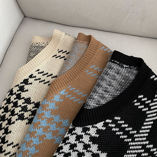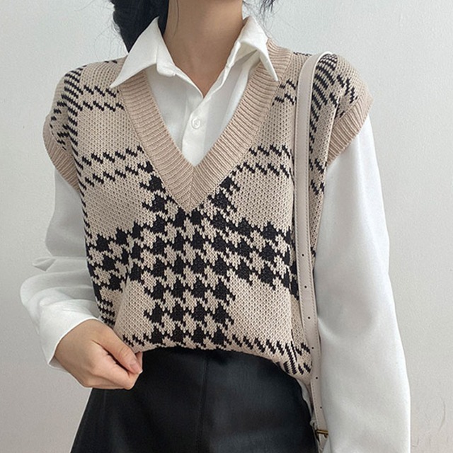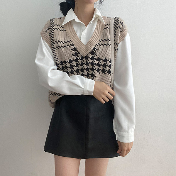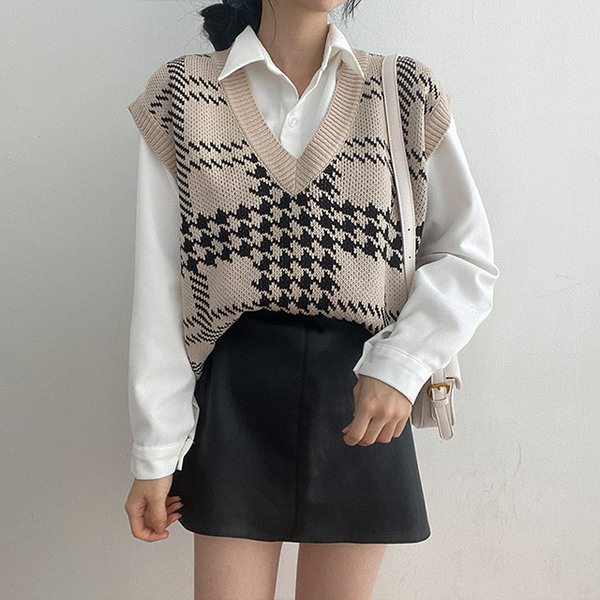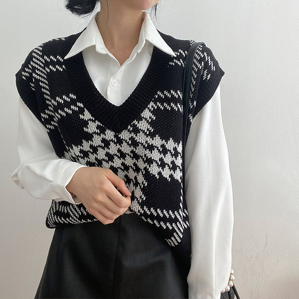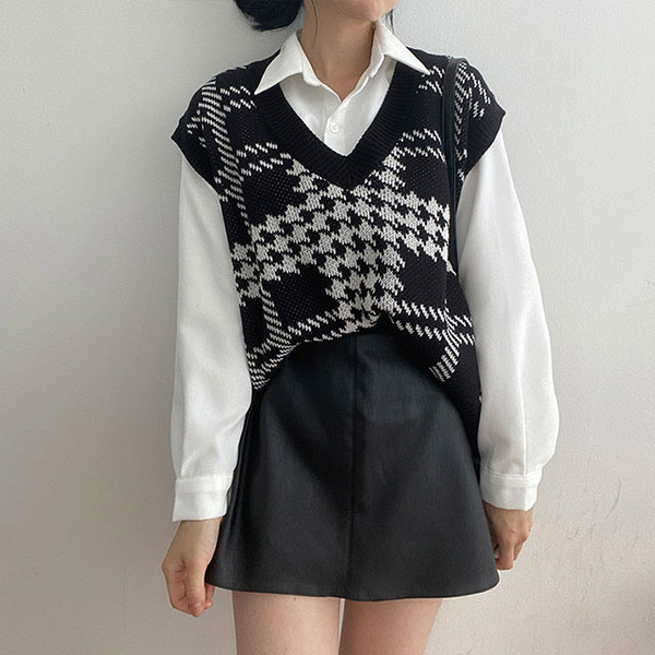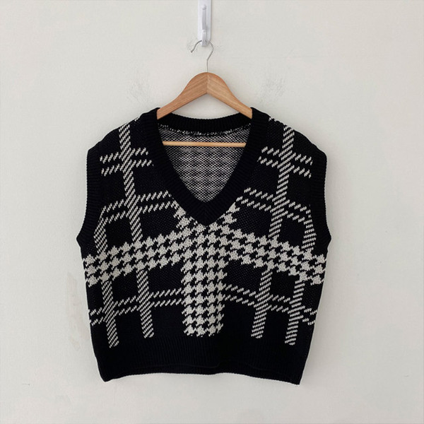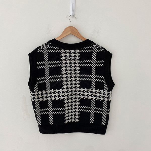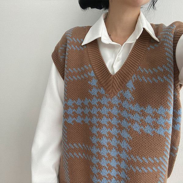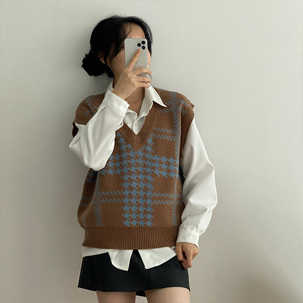 Women's/[3color] 秋 ブイネック チェック ニット ベスト