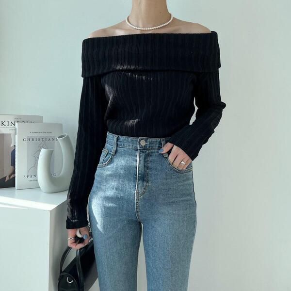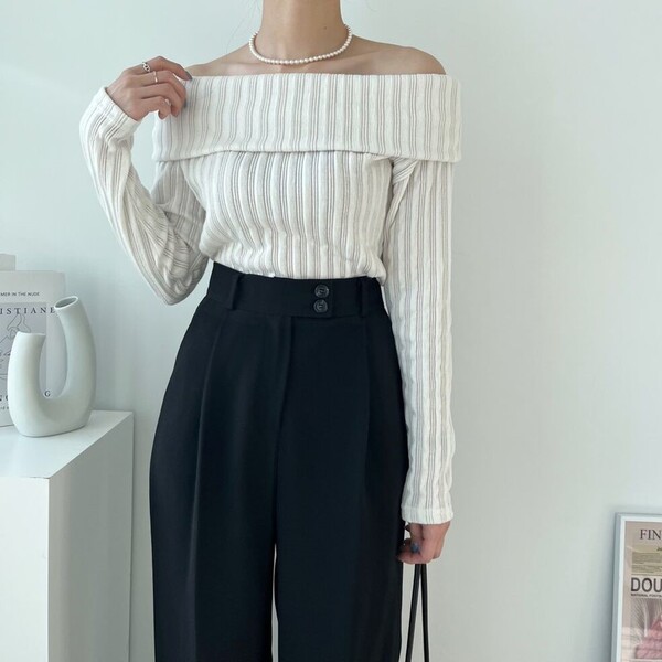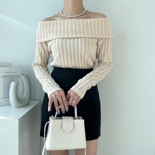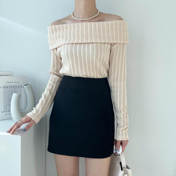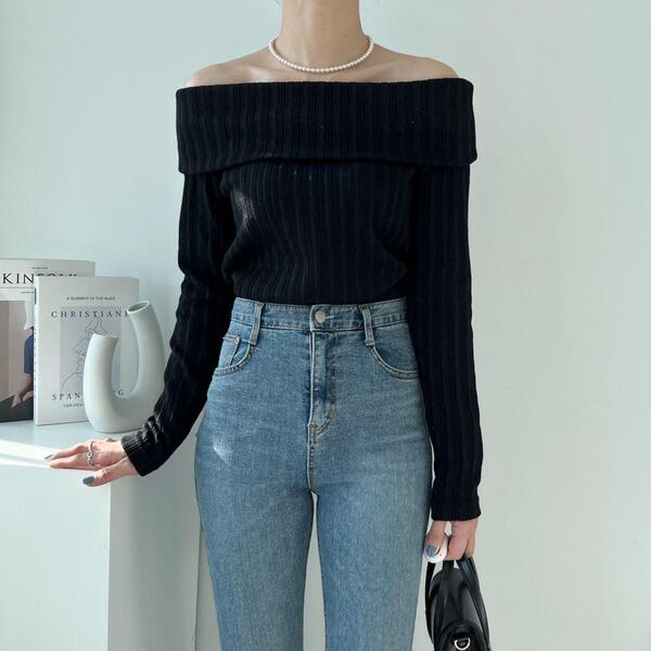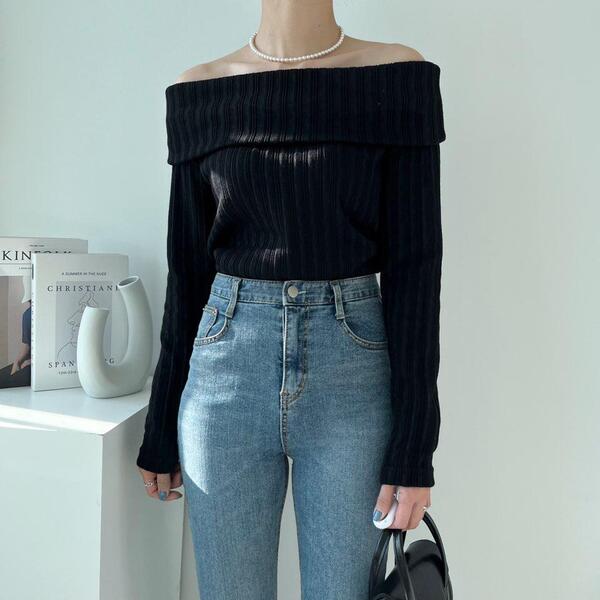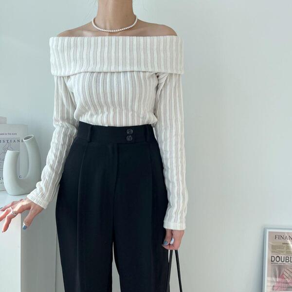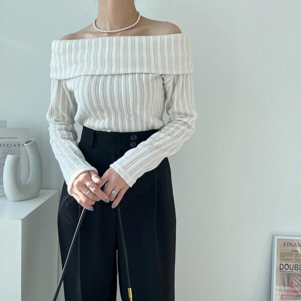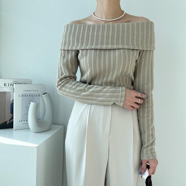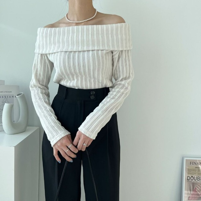(4col)スリム オフショルダー リブ Tシャツ