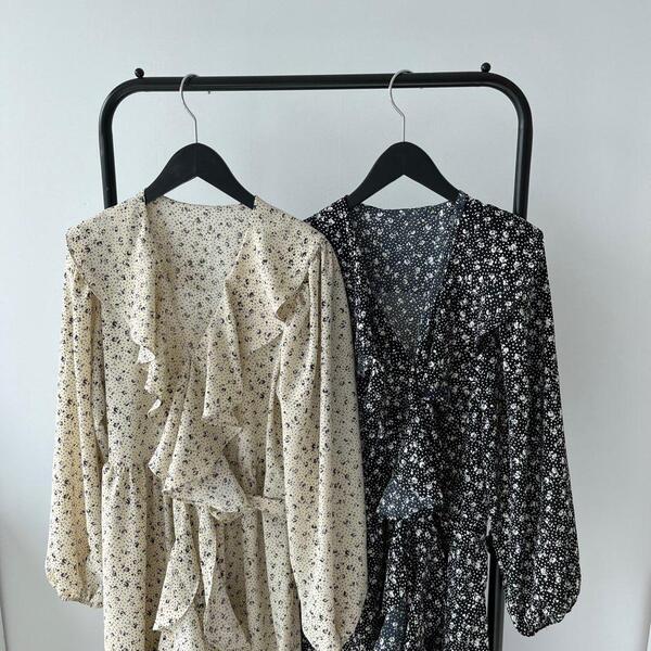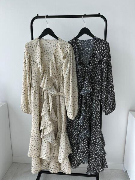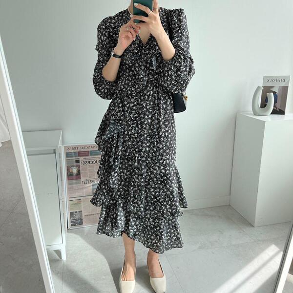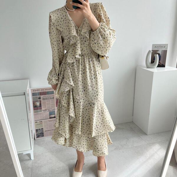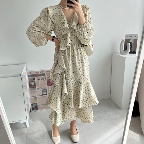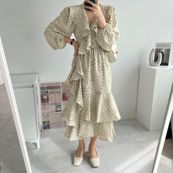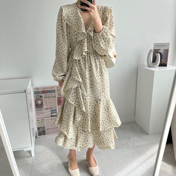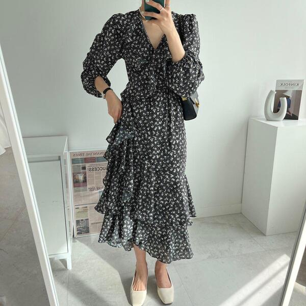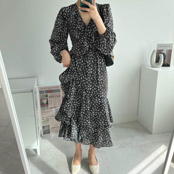 Women's/[2col/ロングバージョン] フリル ラッフル フラワー シフォン ラップ ロングドレス