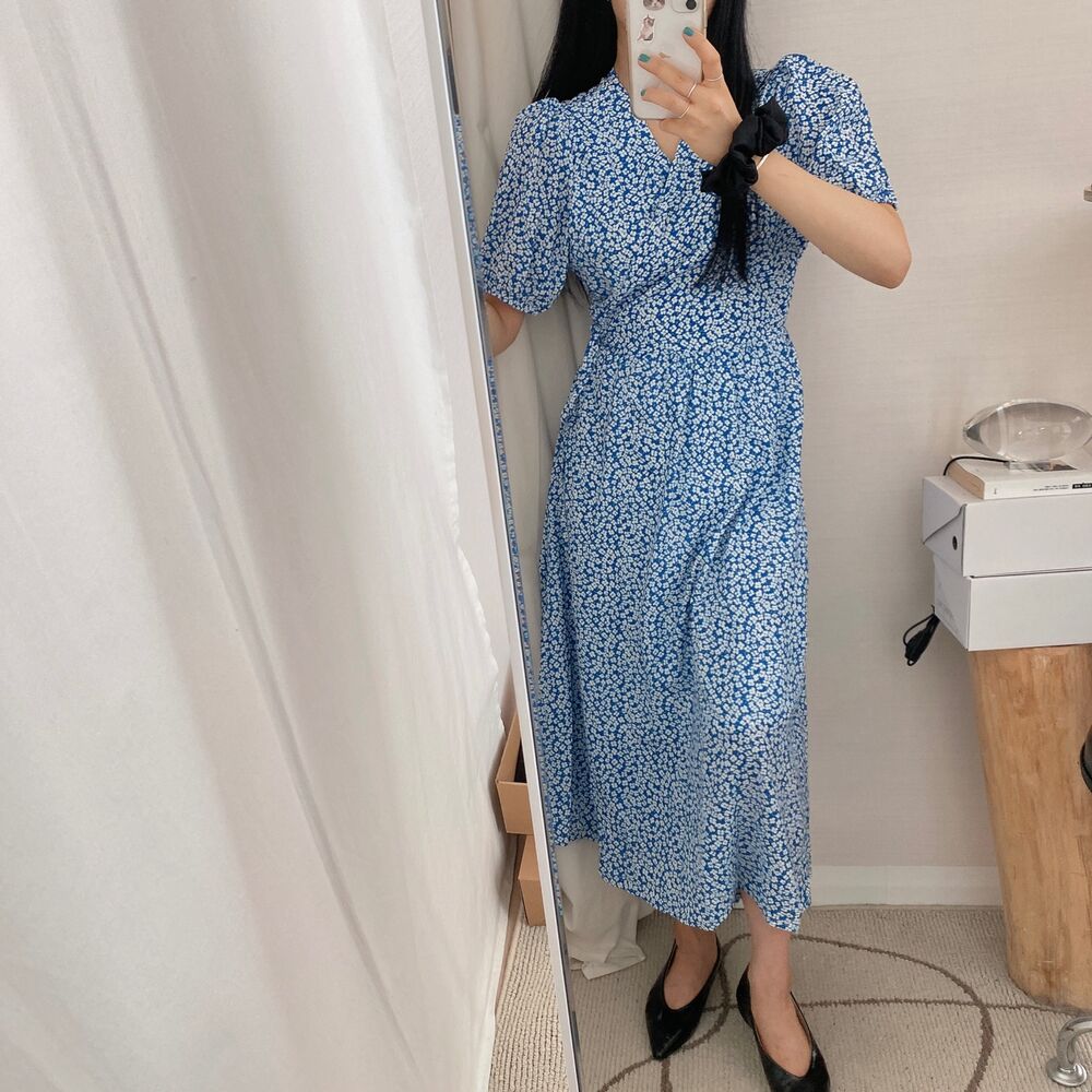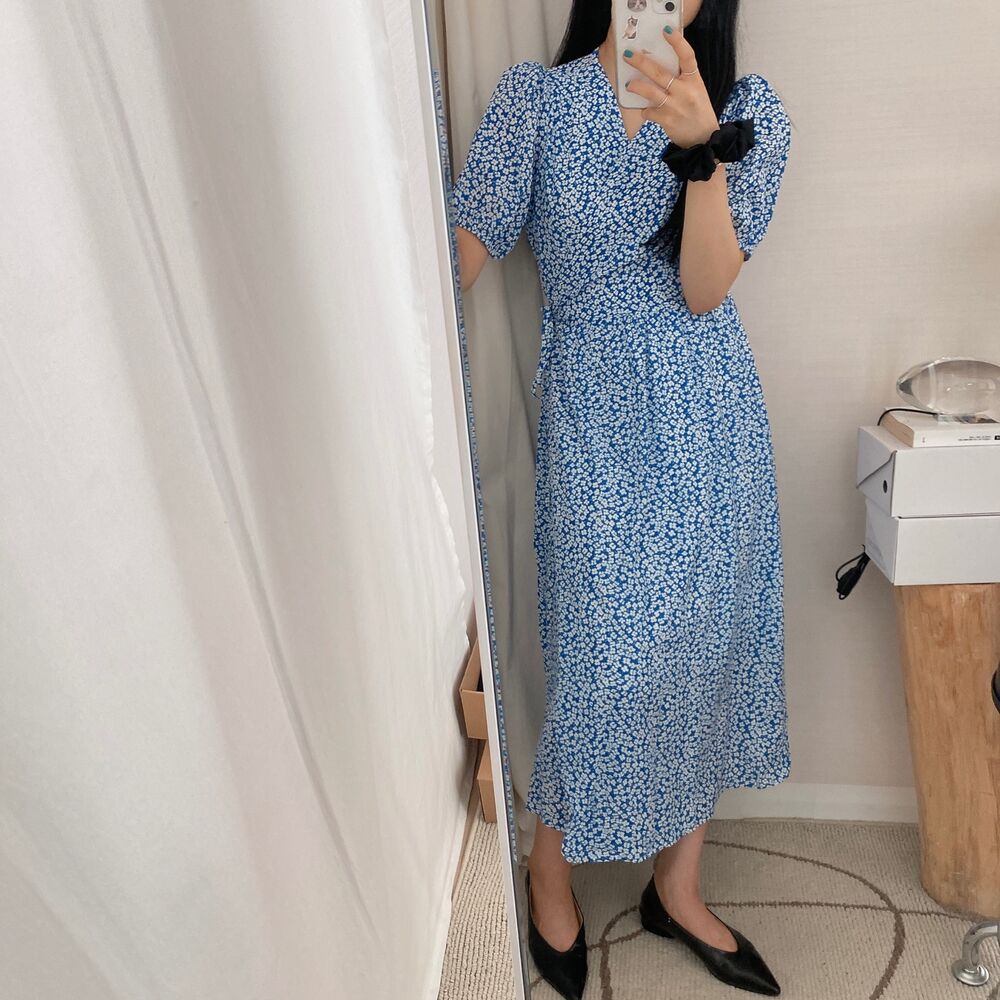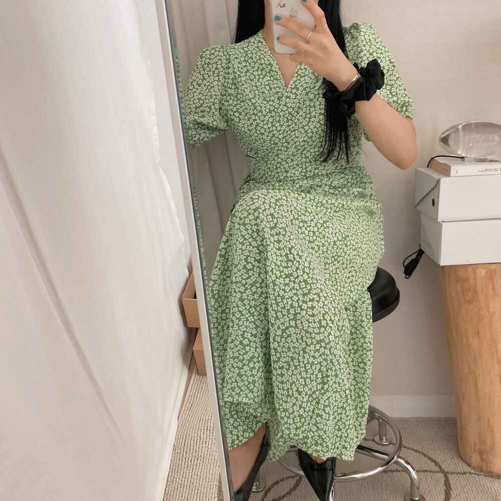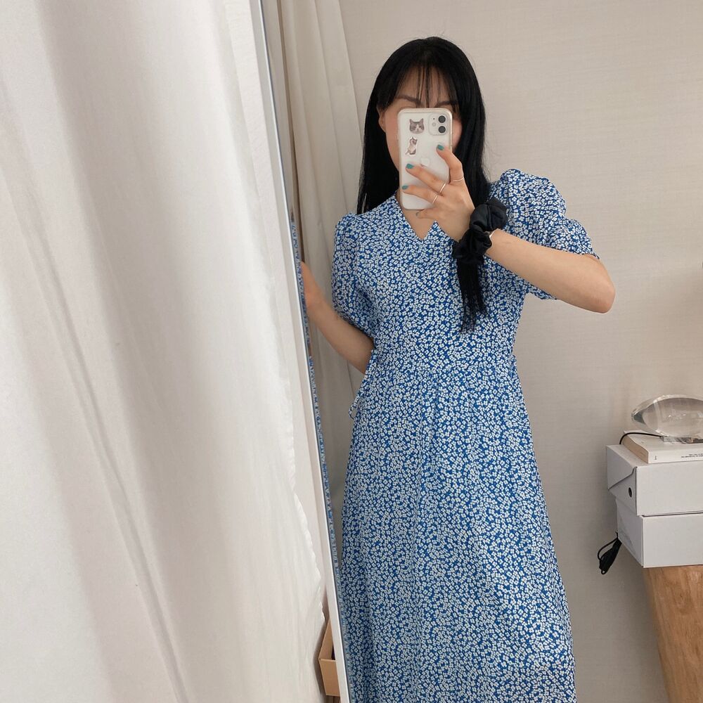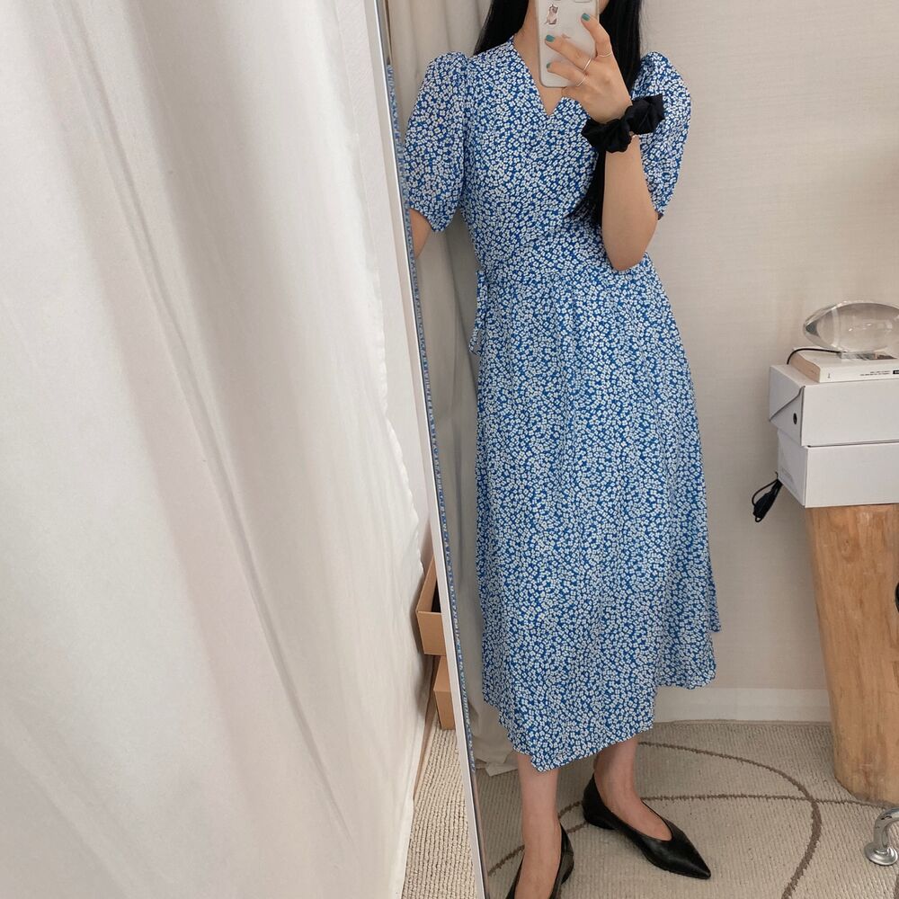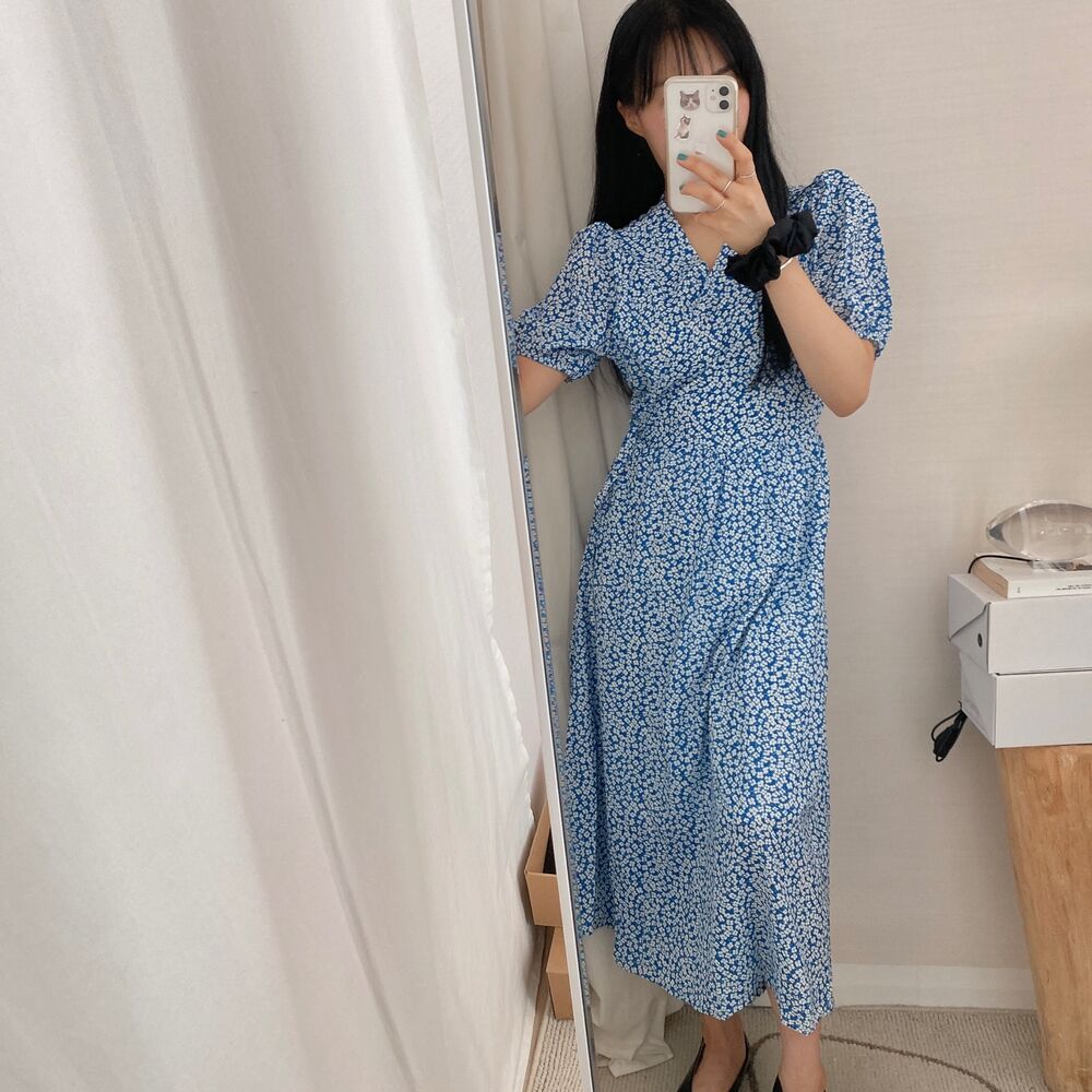 フラワースプリングシフォンパフショートスリーブドレス
