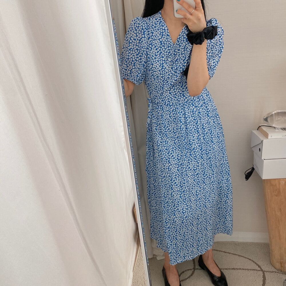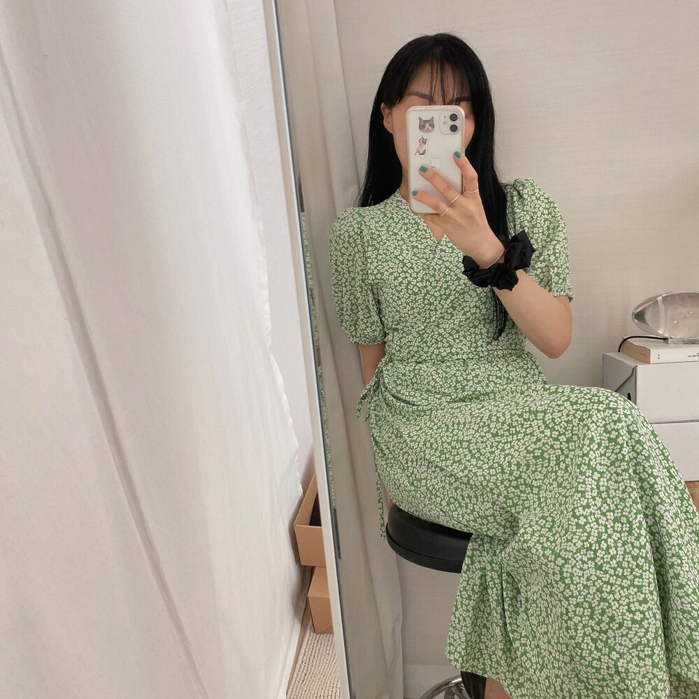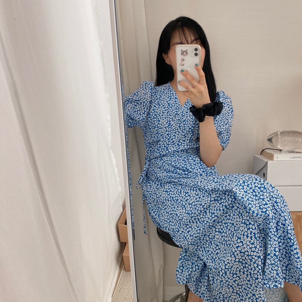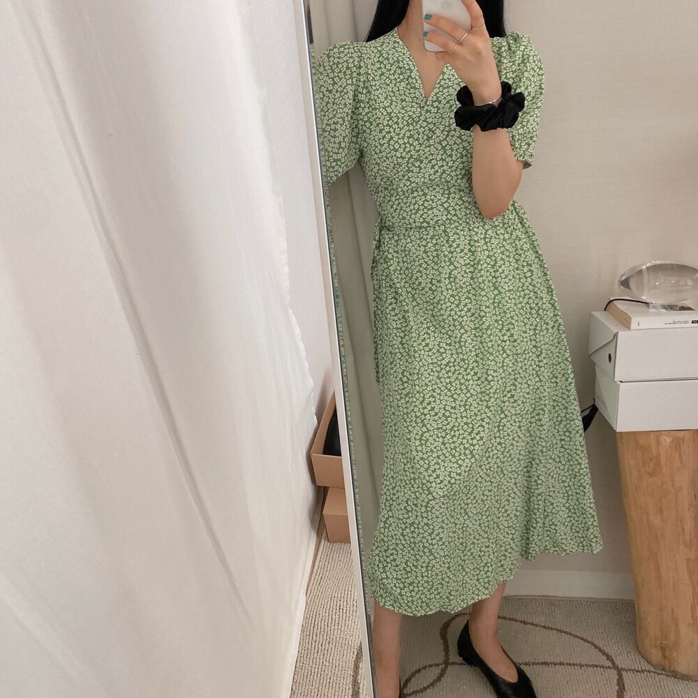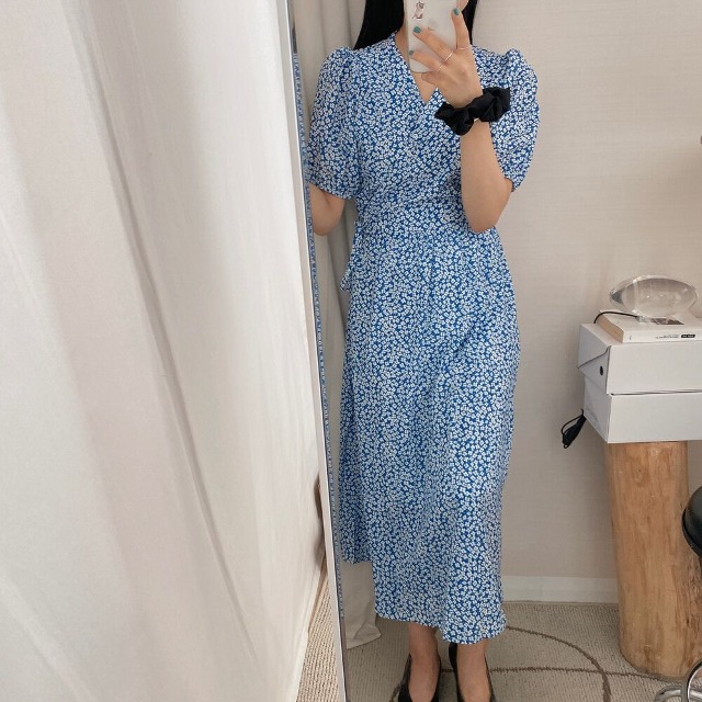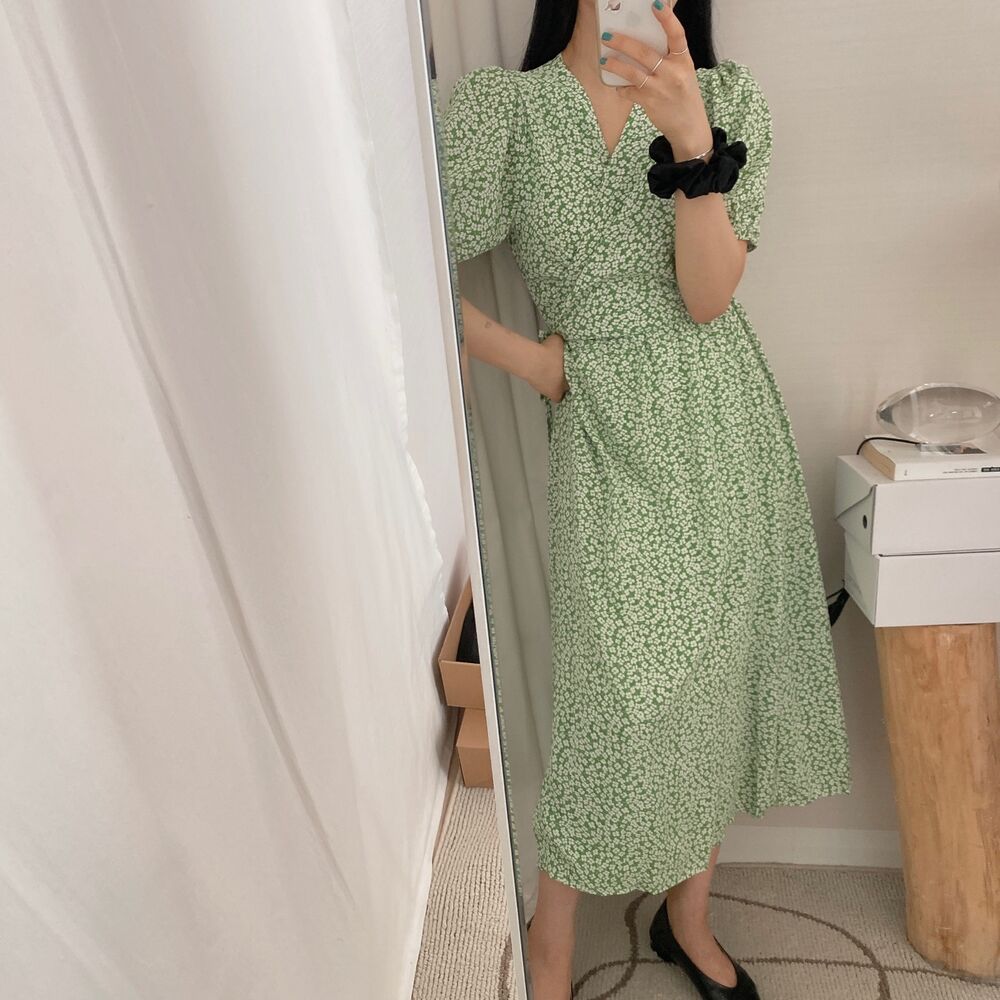 フラワースプリングシフォンパフショートスリーブドレス