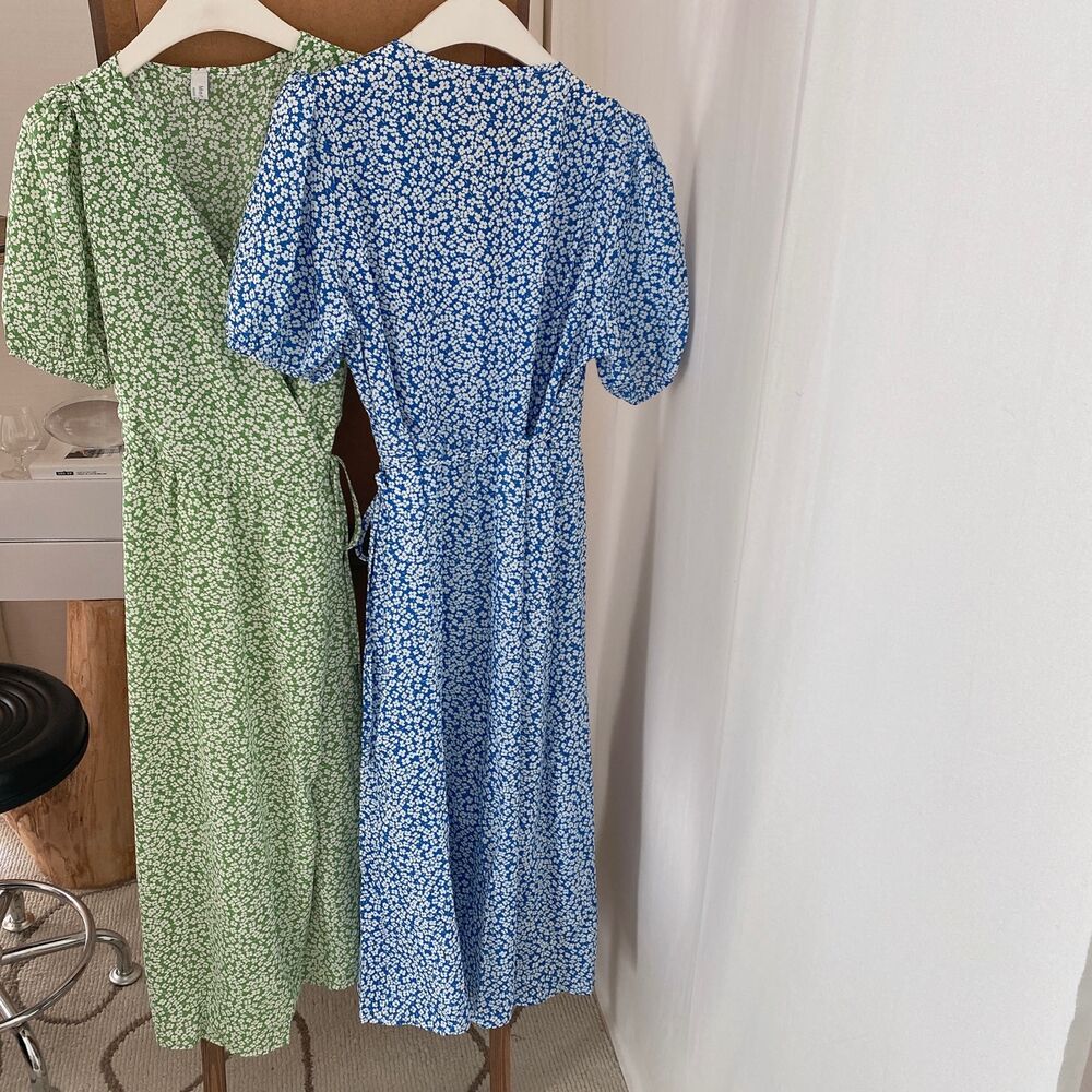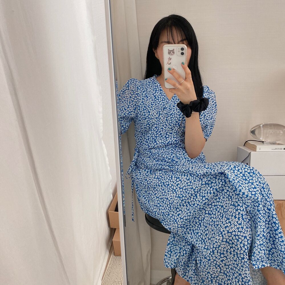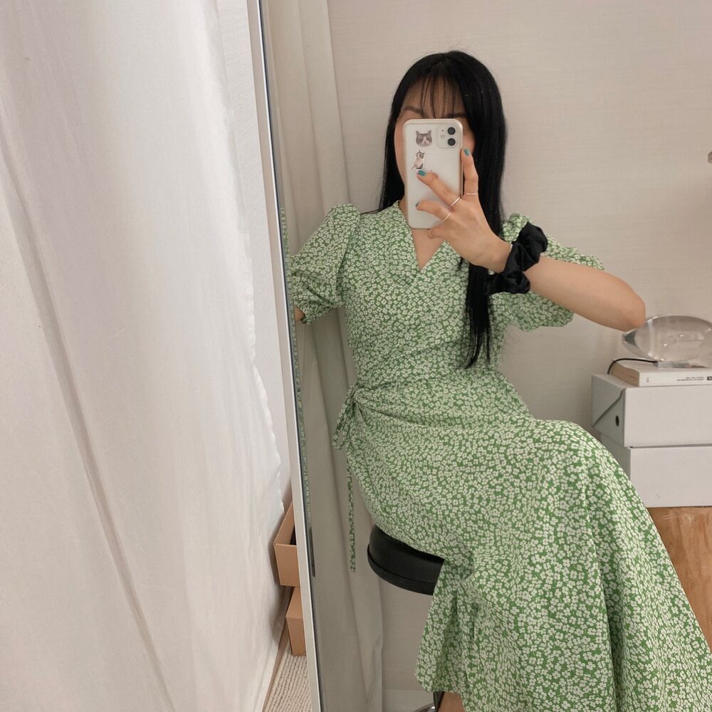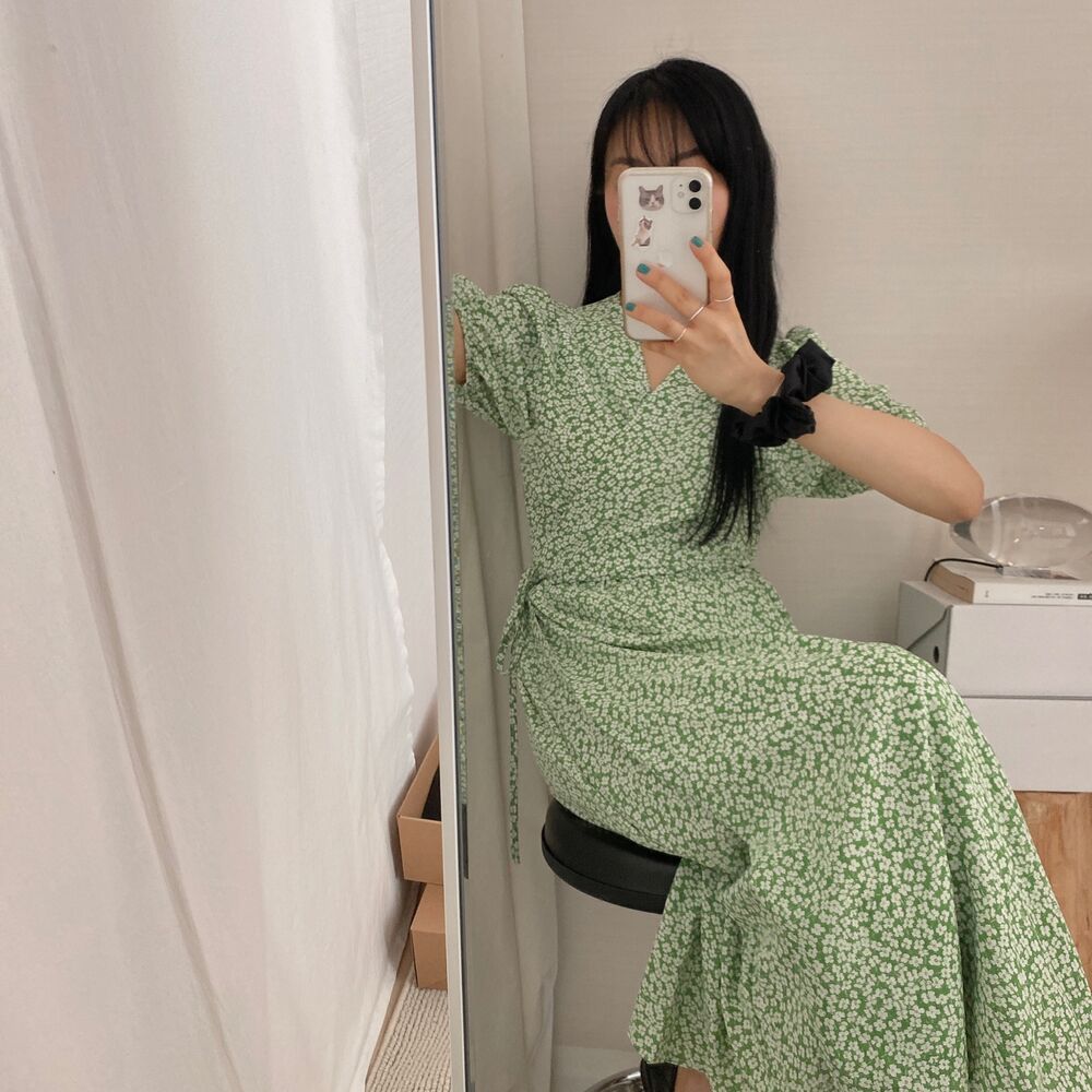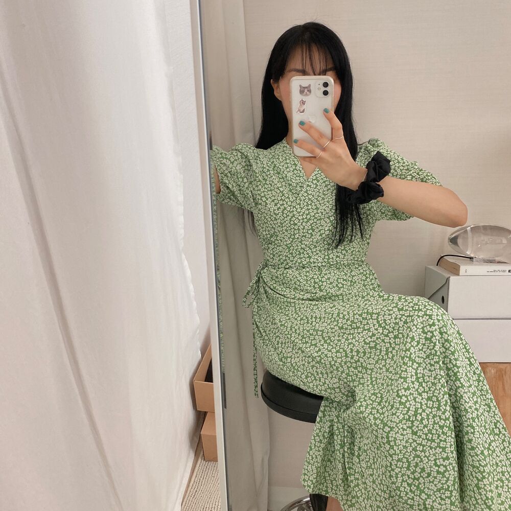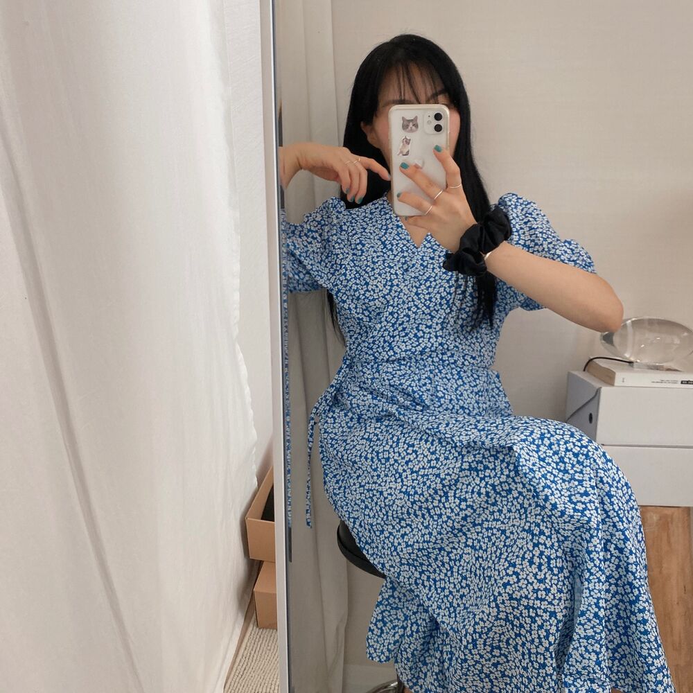 フラワースプリングシフォンパフショートスリーブドレス