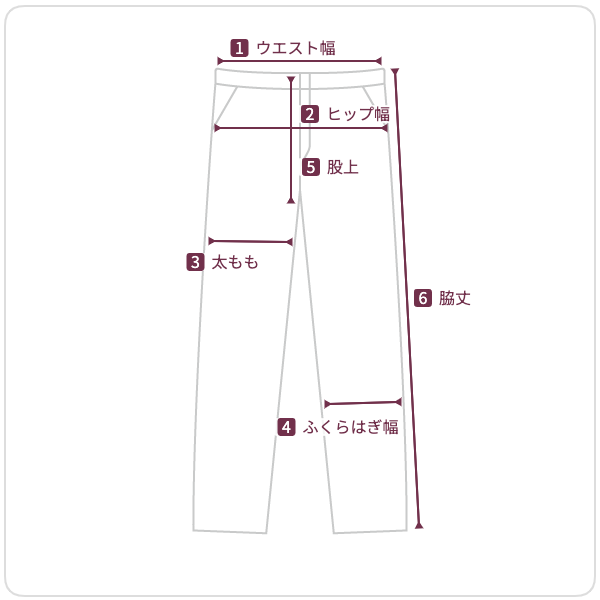 2 ヒップ幅 | 46 18 | 48 19 | 50 19.5 |