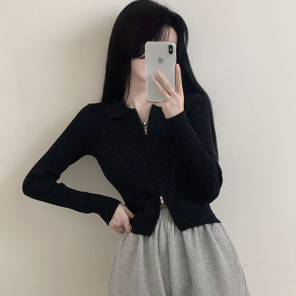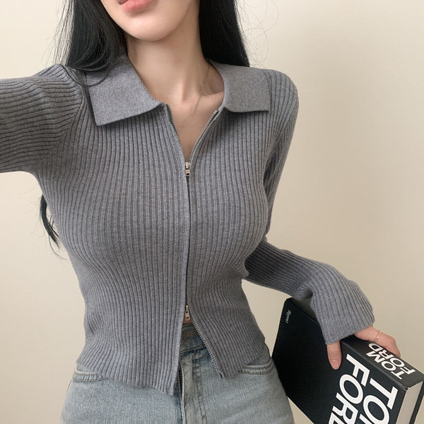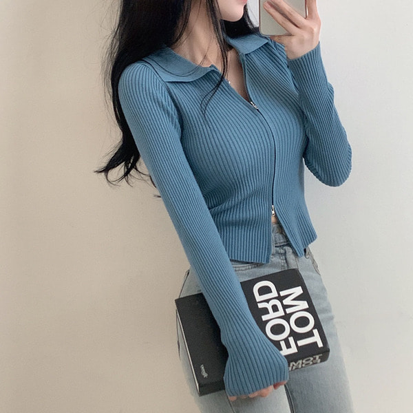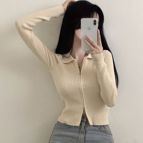 スリムフィット2WAYカラーリブ編み長袖クロップドジップアップ