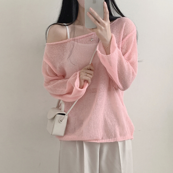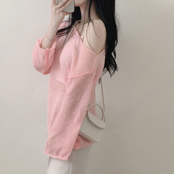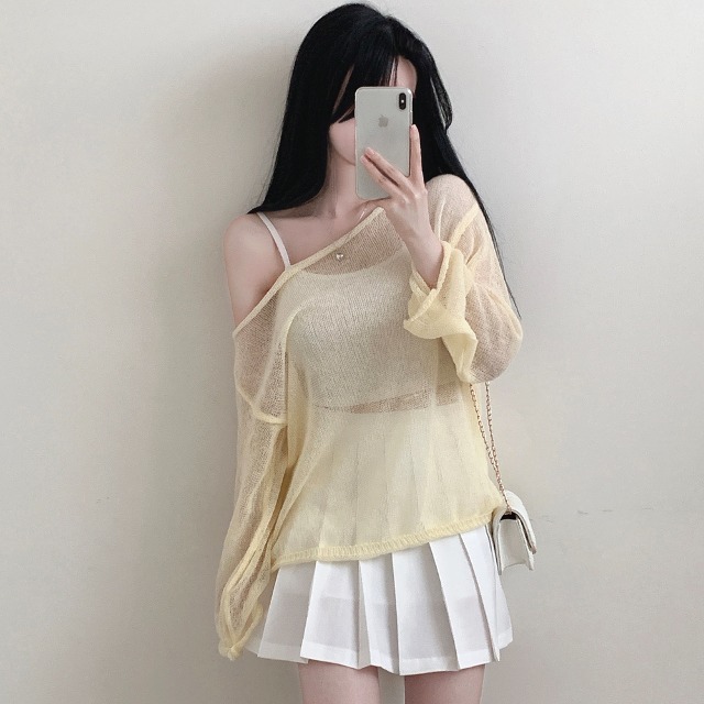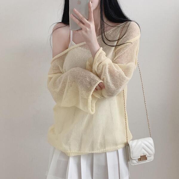 パステルシースルーオフショルダーロングスリーブニットウェア