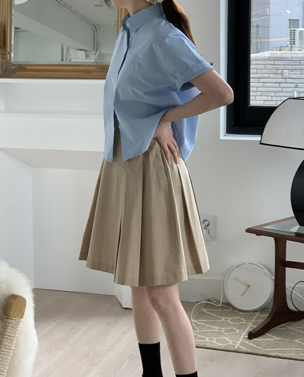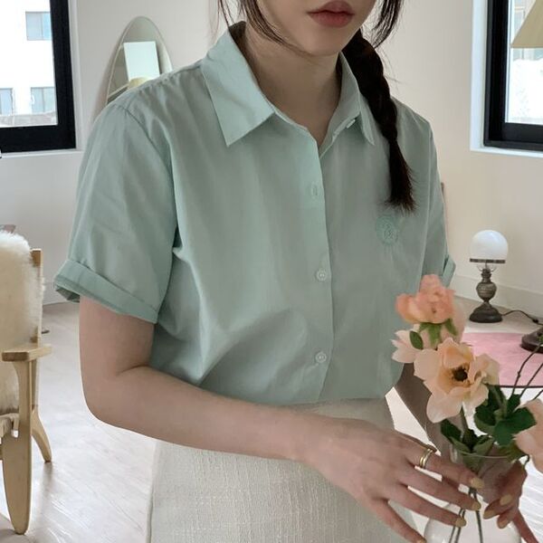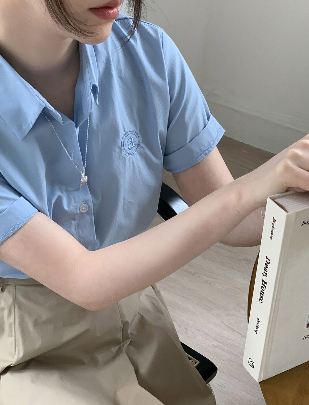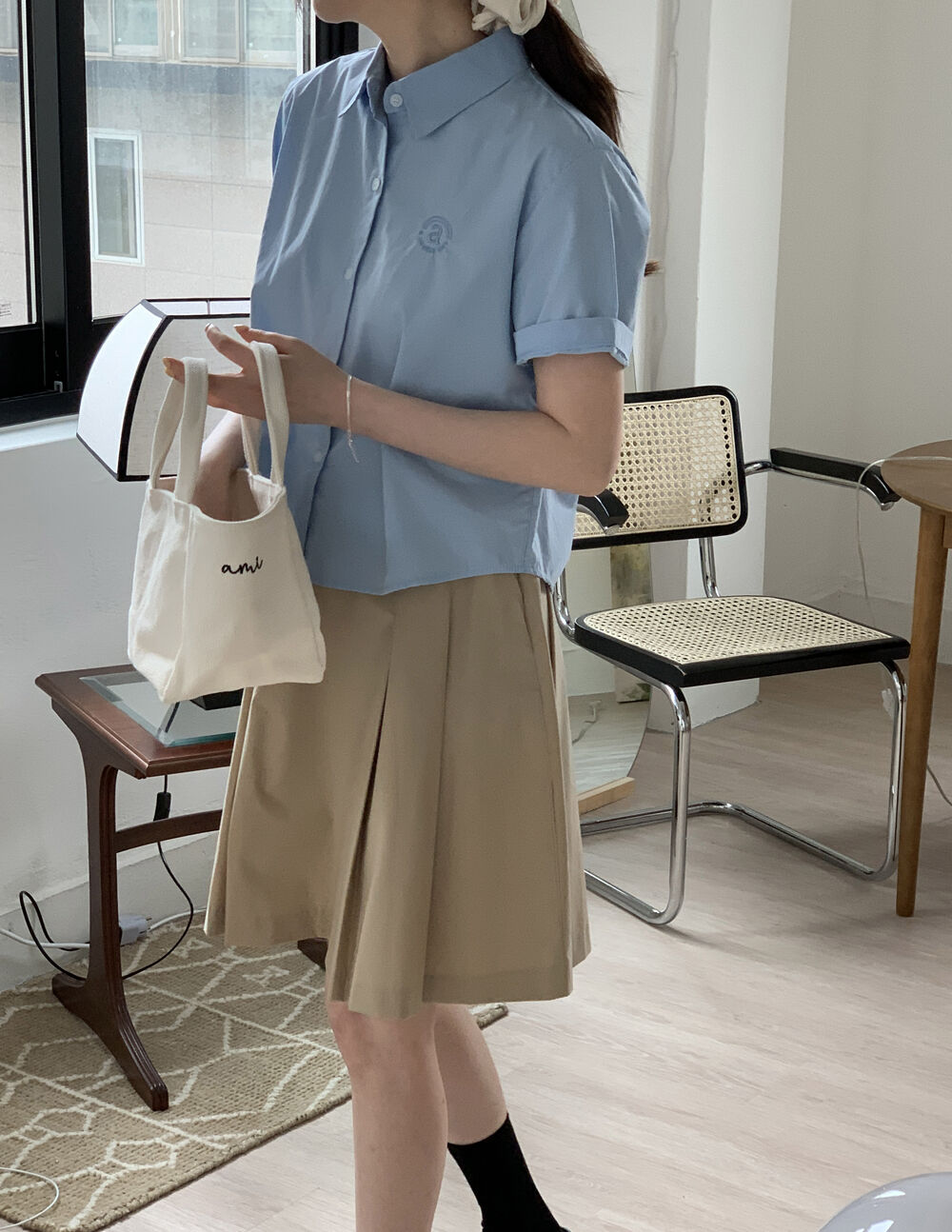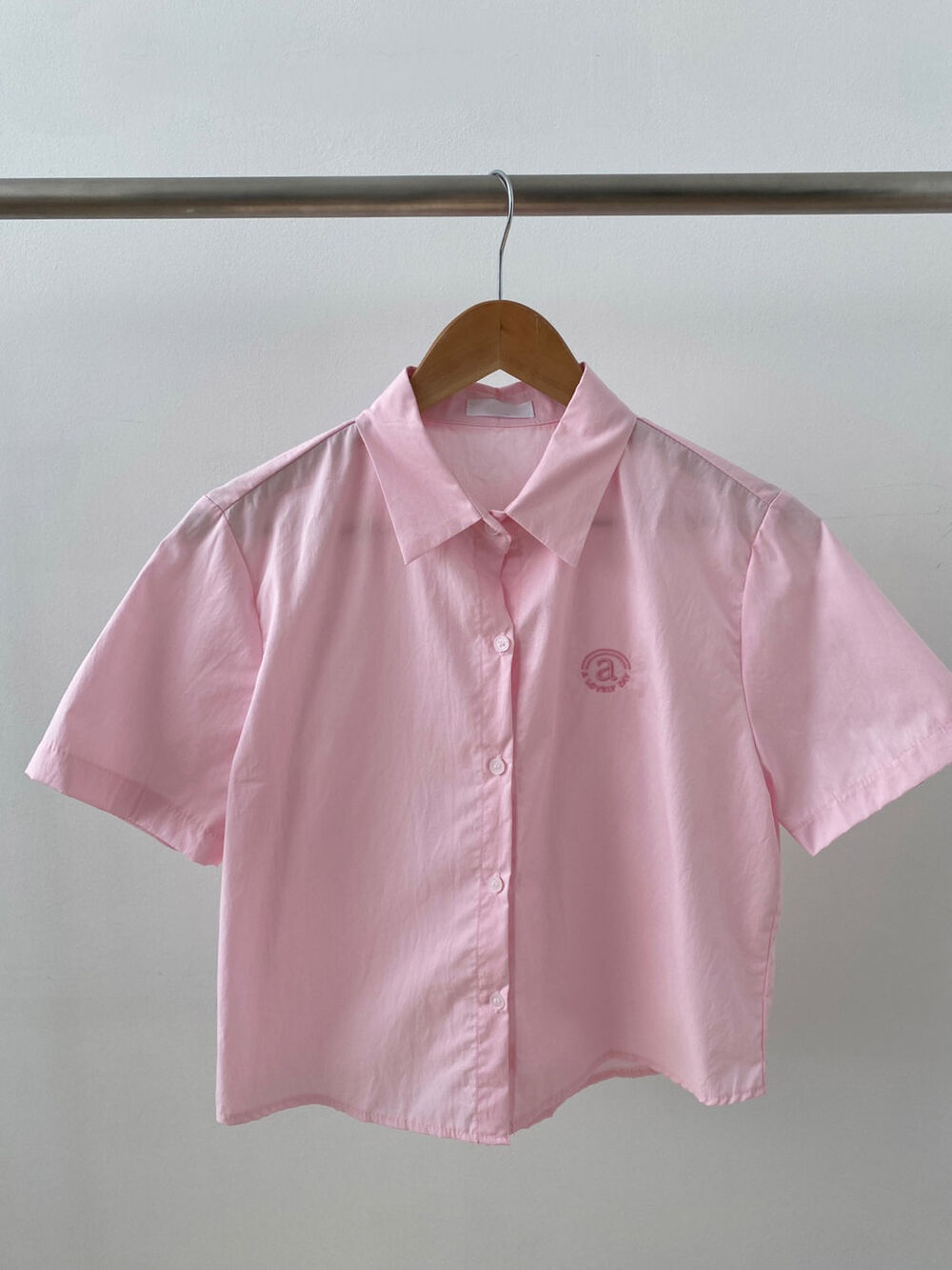 [5 color] 刺繍コットンクロップド半袖シャツ