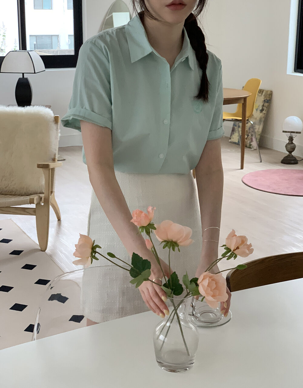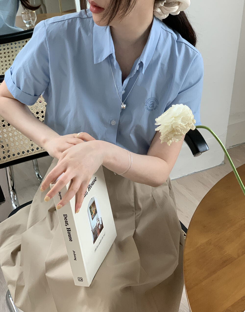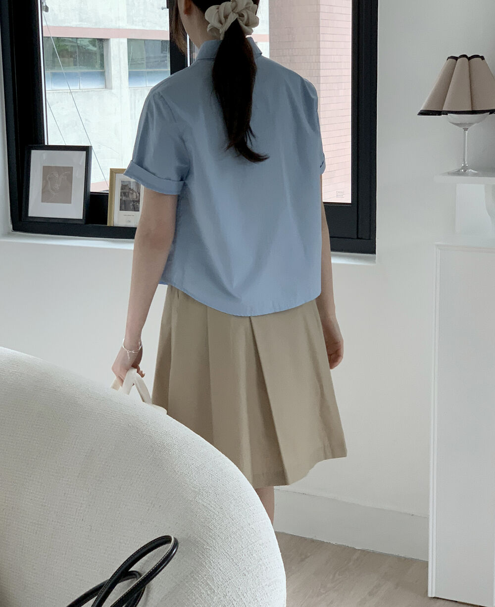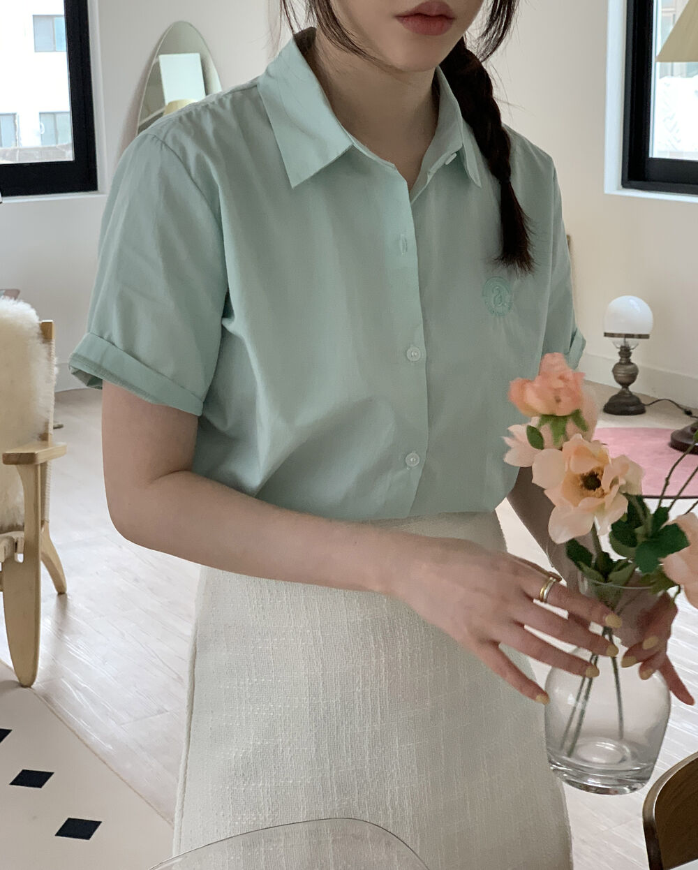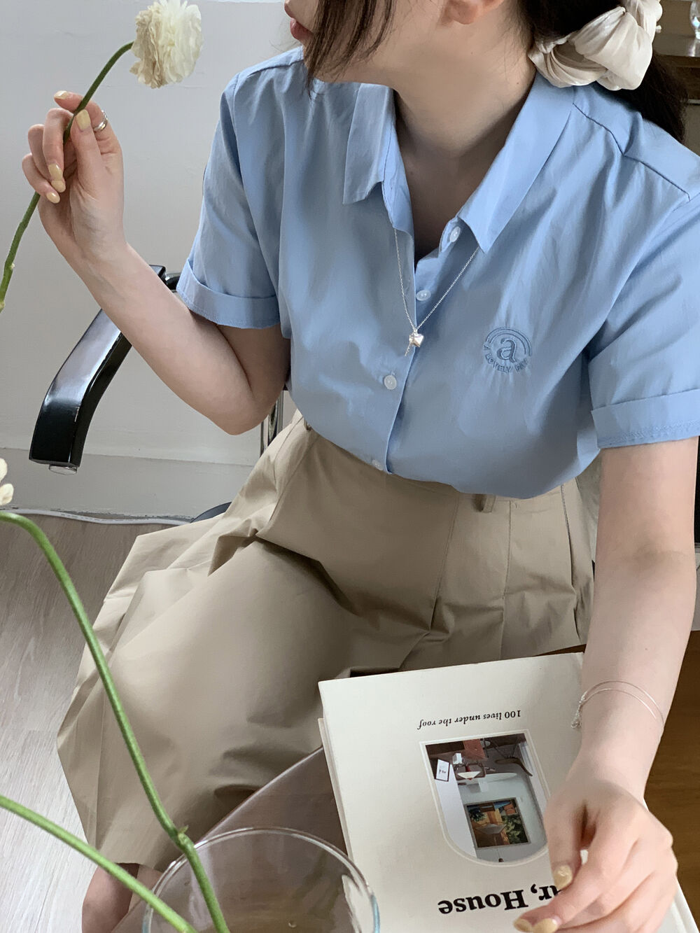 [5 color] 刺繍コットンクロップド半袖シャツ
