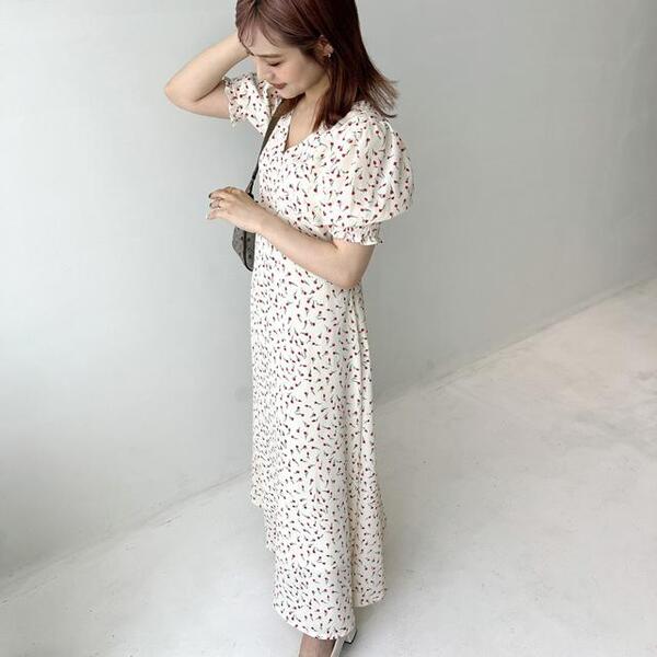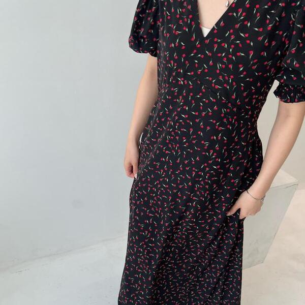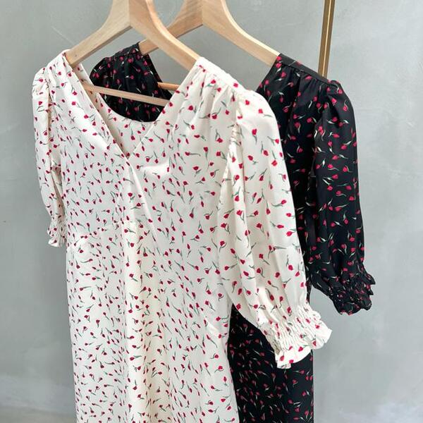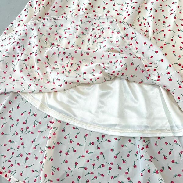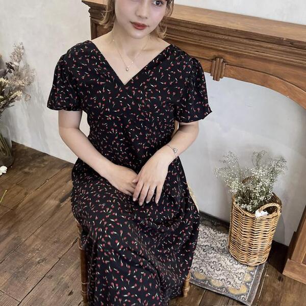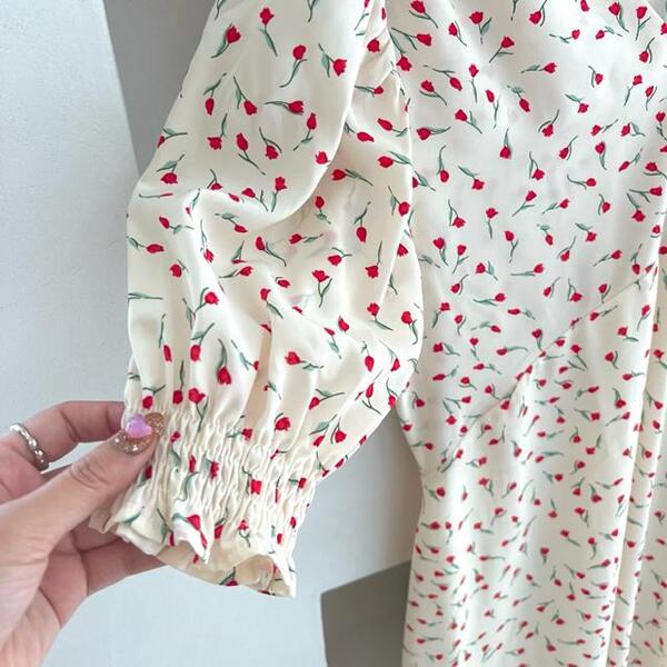 チューリップの総柄が新しいワンピース。