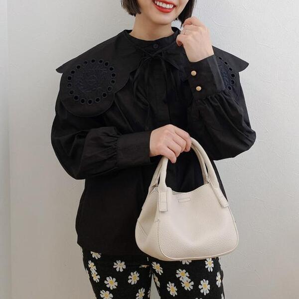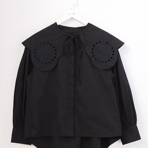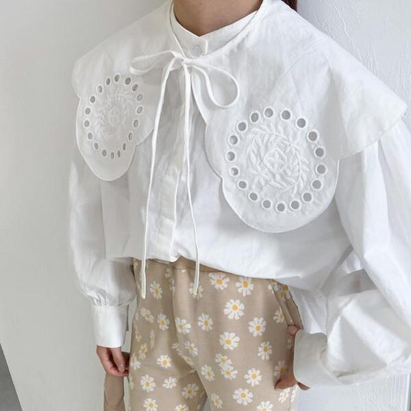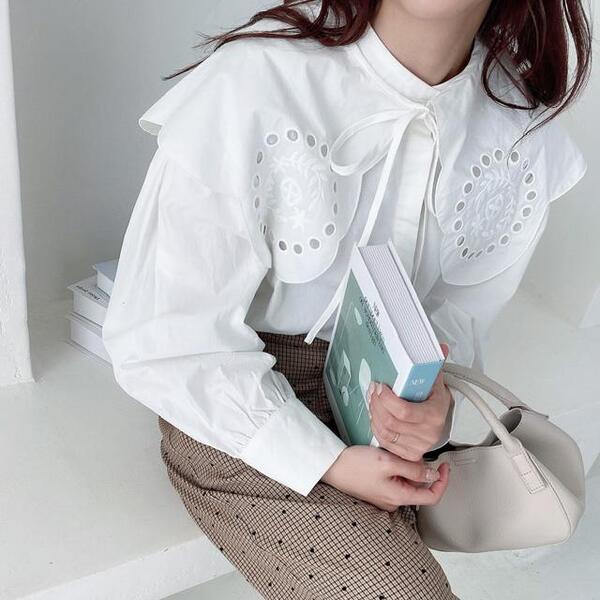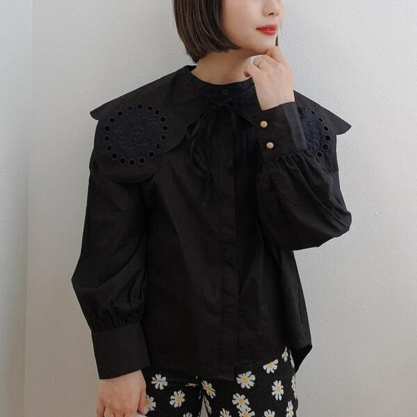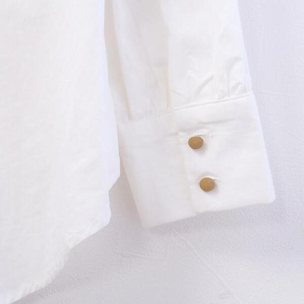 トレンドの付け襟に袖口のくるみボタンがポイントになっていて