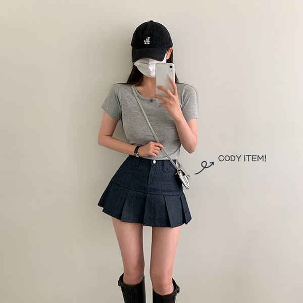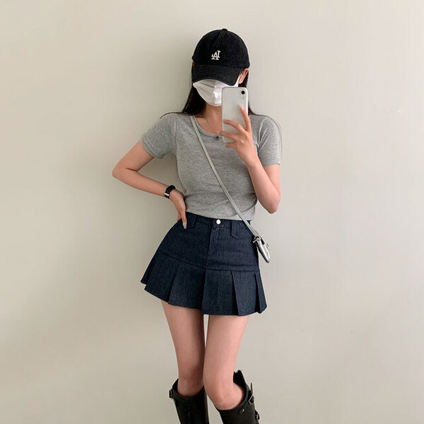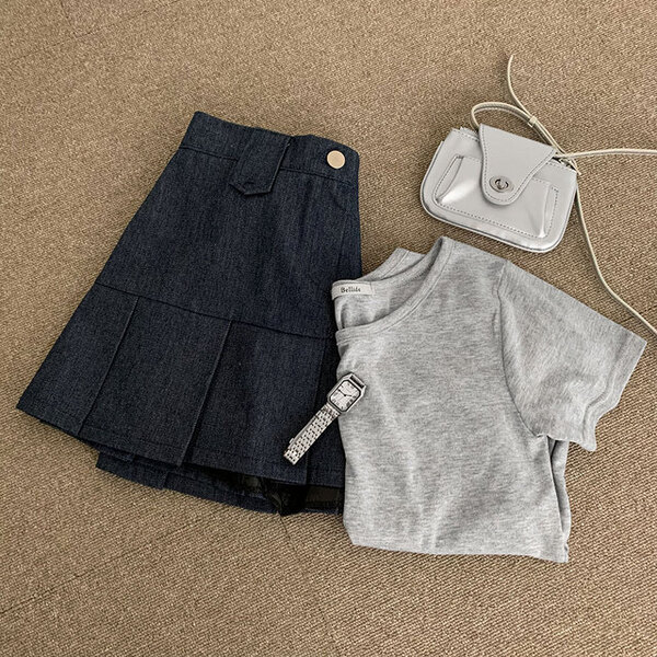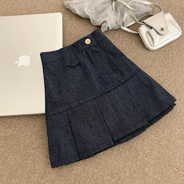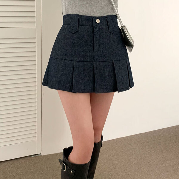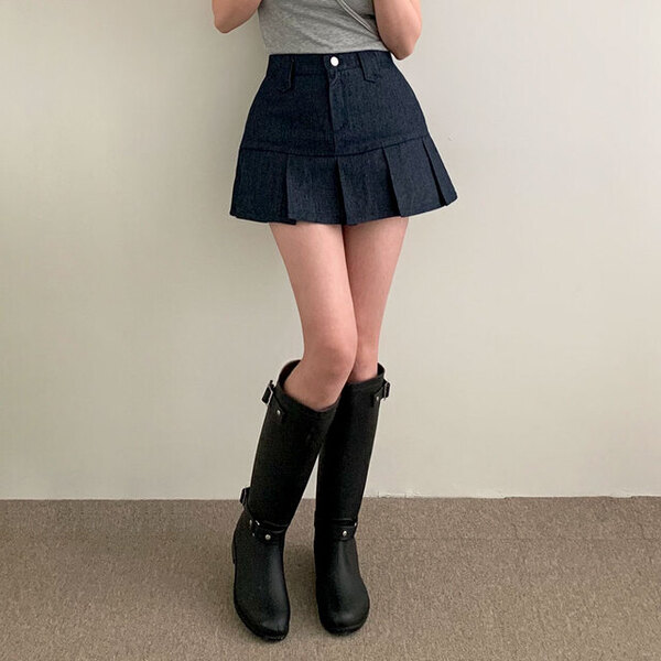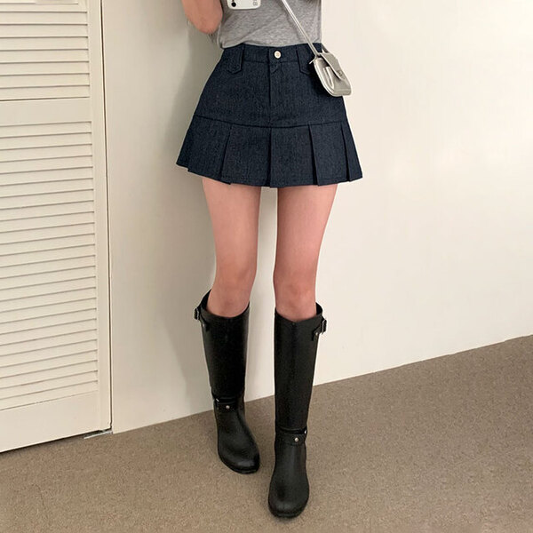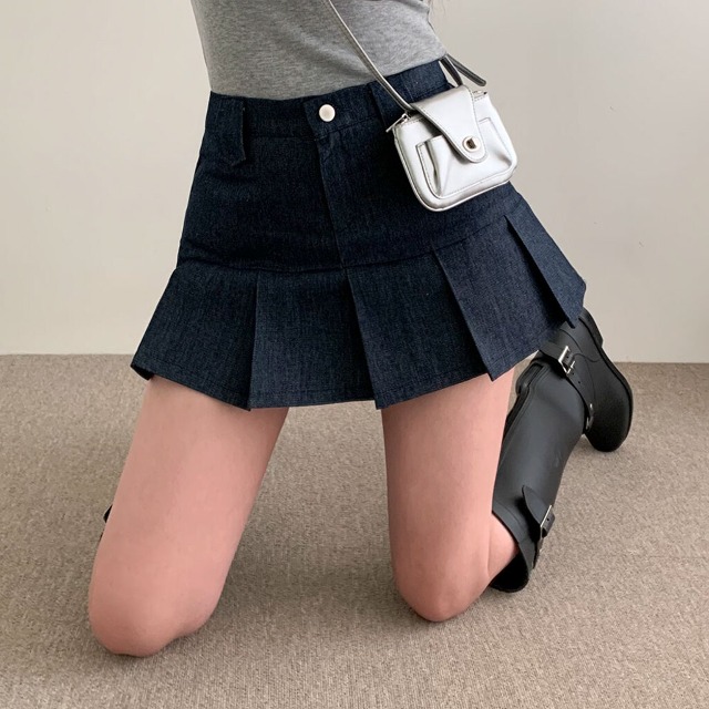 [2color/ゴムウエスト] プリーツデニムミニスカート