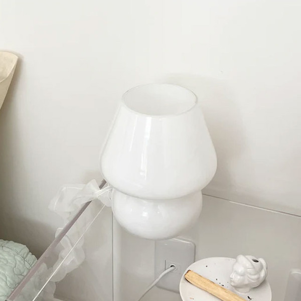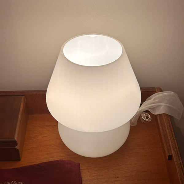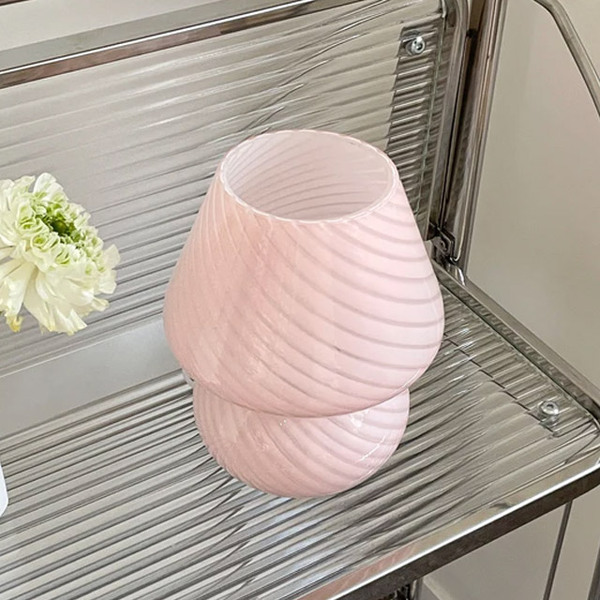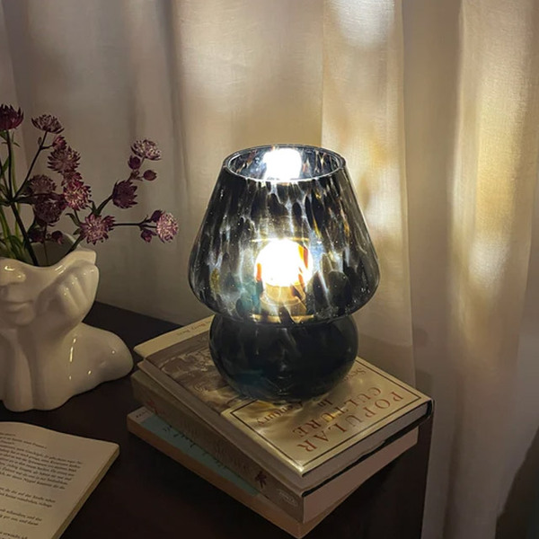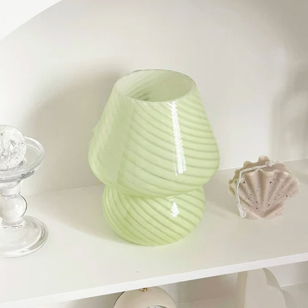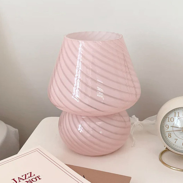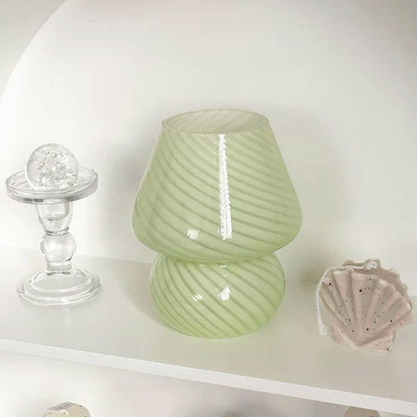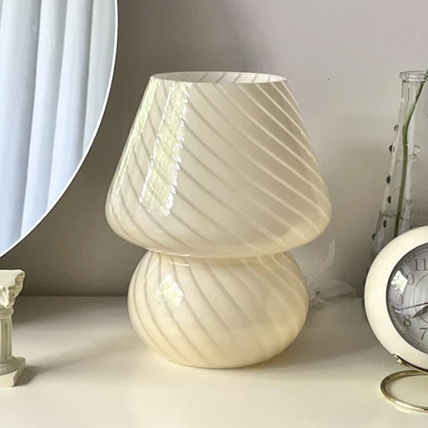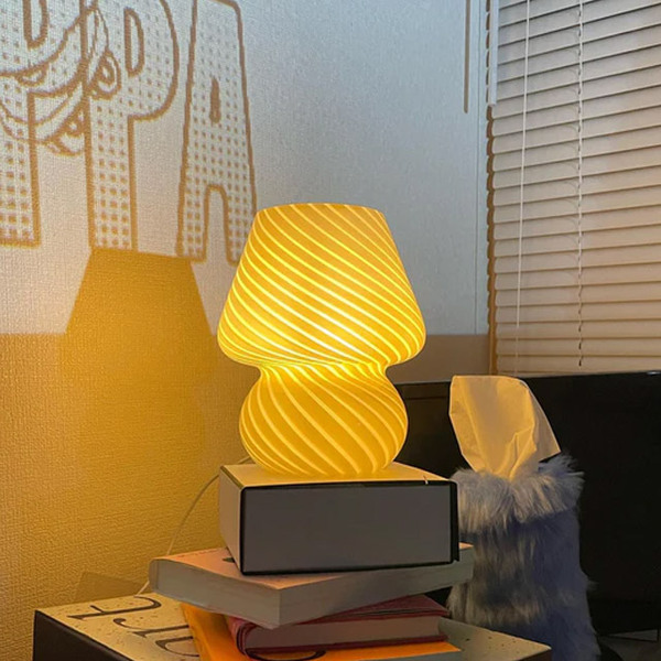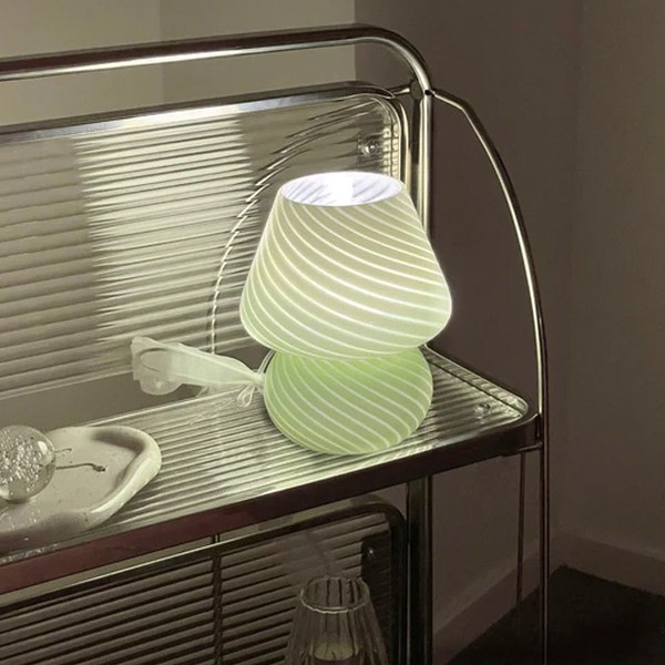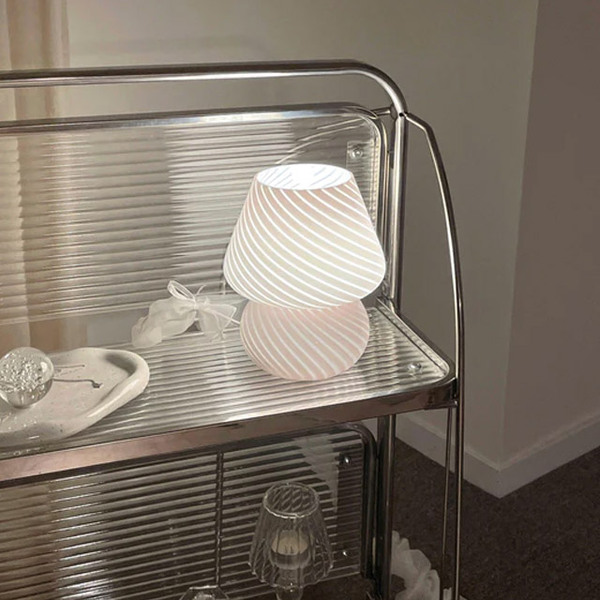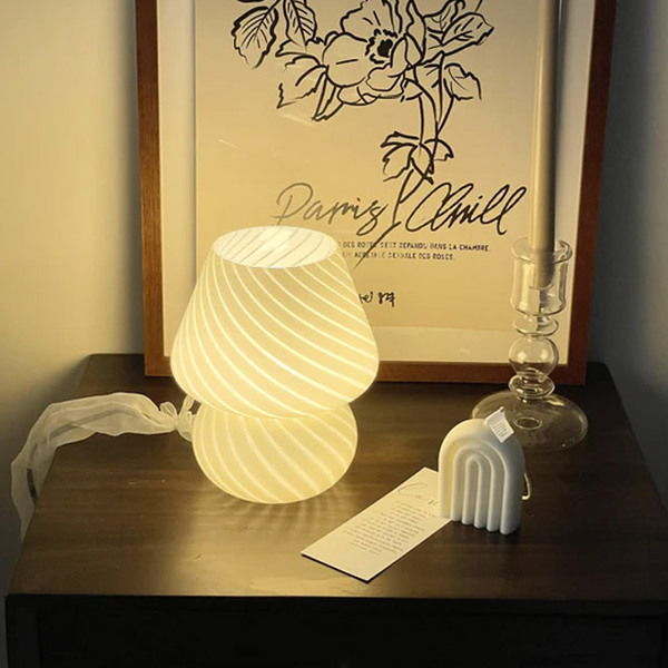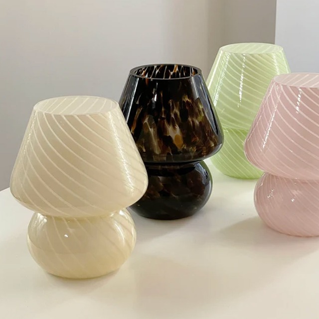 マッシュルームのような、ぽってりとしたフォルムがかわいらしいテーブルランプ。つるっとしたガラスの質感も魅力的です。ランプ全体にあしらわれたストライプやペイントのような模様がアクセントとなり、ユニークでかわいらしい雰囲気をプラスしてくれます。