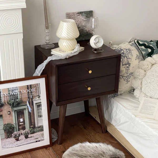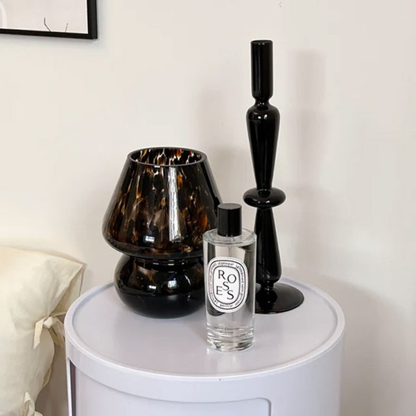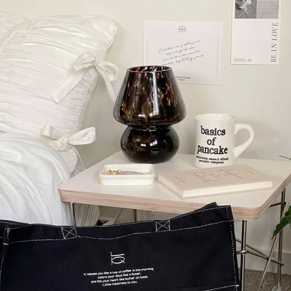 ベッドサイドで使うなら、程よい高さのサイドテーブルにランプを乗せましょう。シックな雰囲気のアンバーには、深い茶色のチェストを合わせるのがおすすめです。
