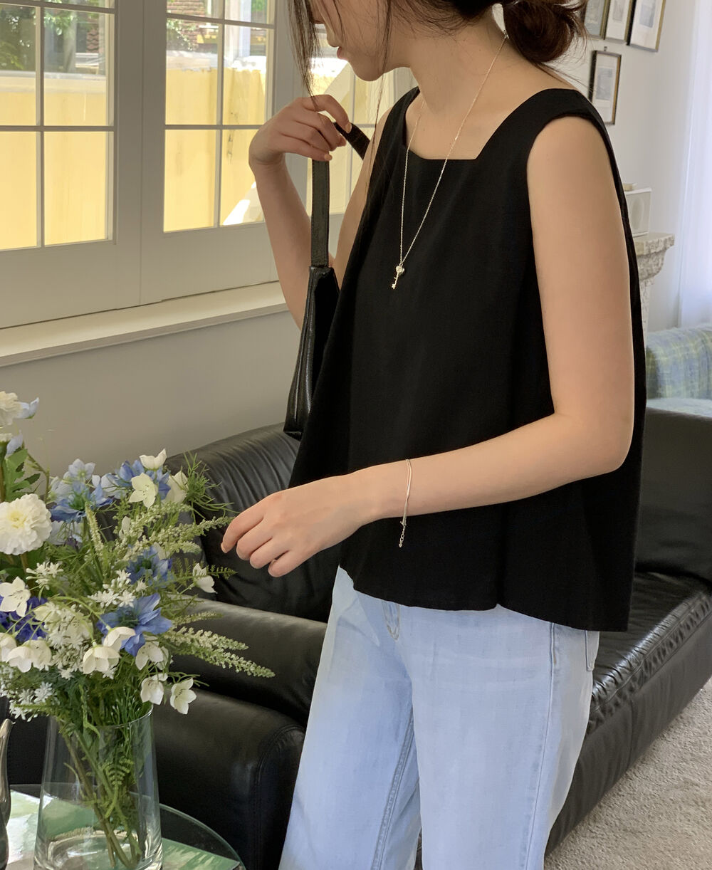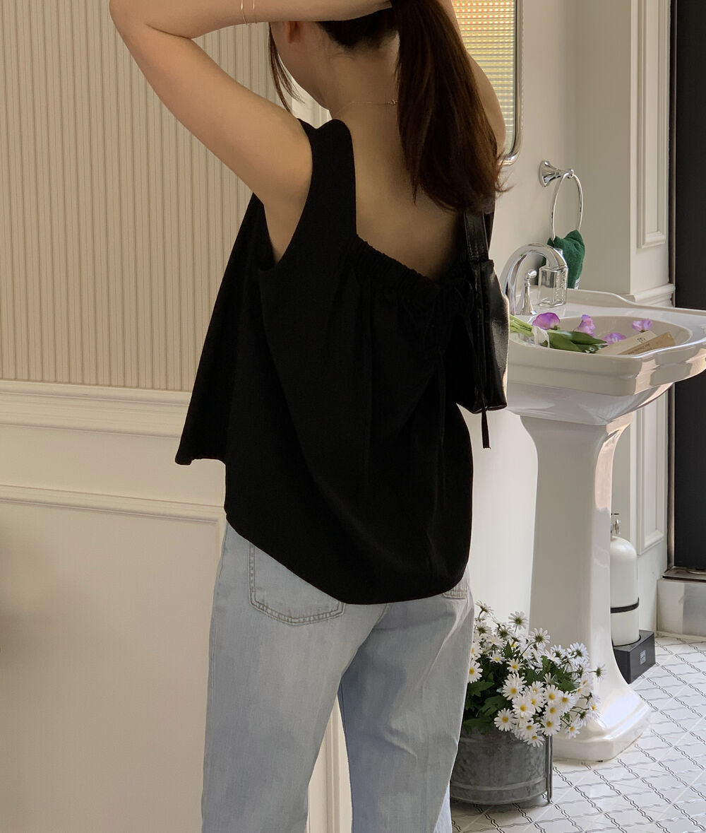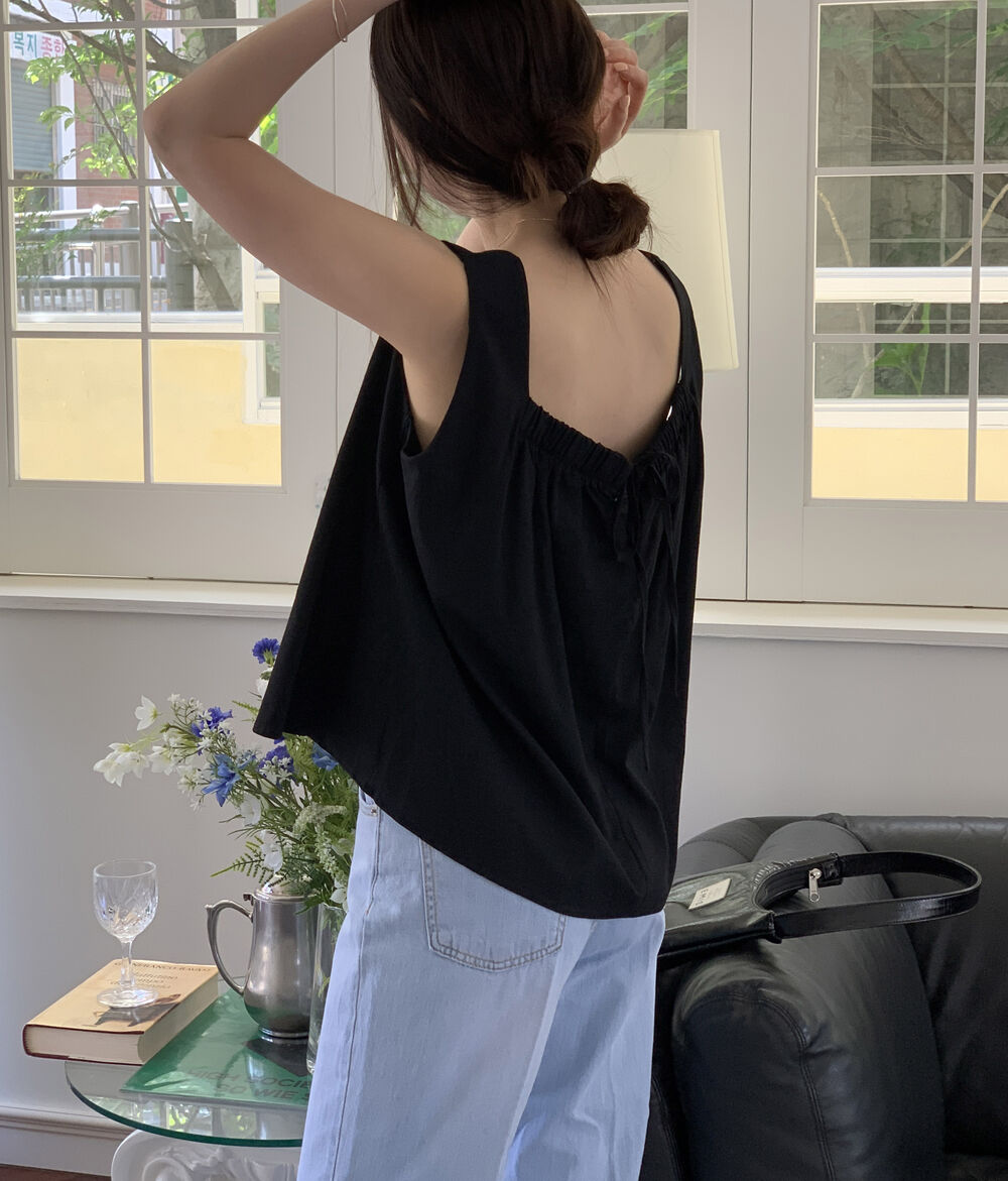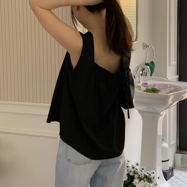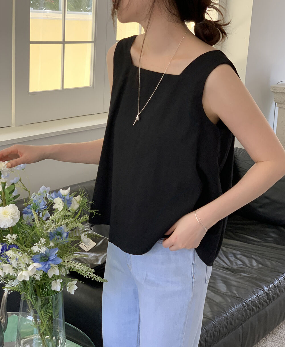 [3color]リネンスクエアバックリボンノースリーブブラウス