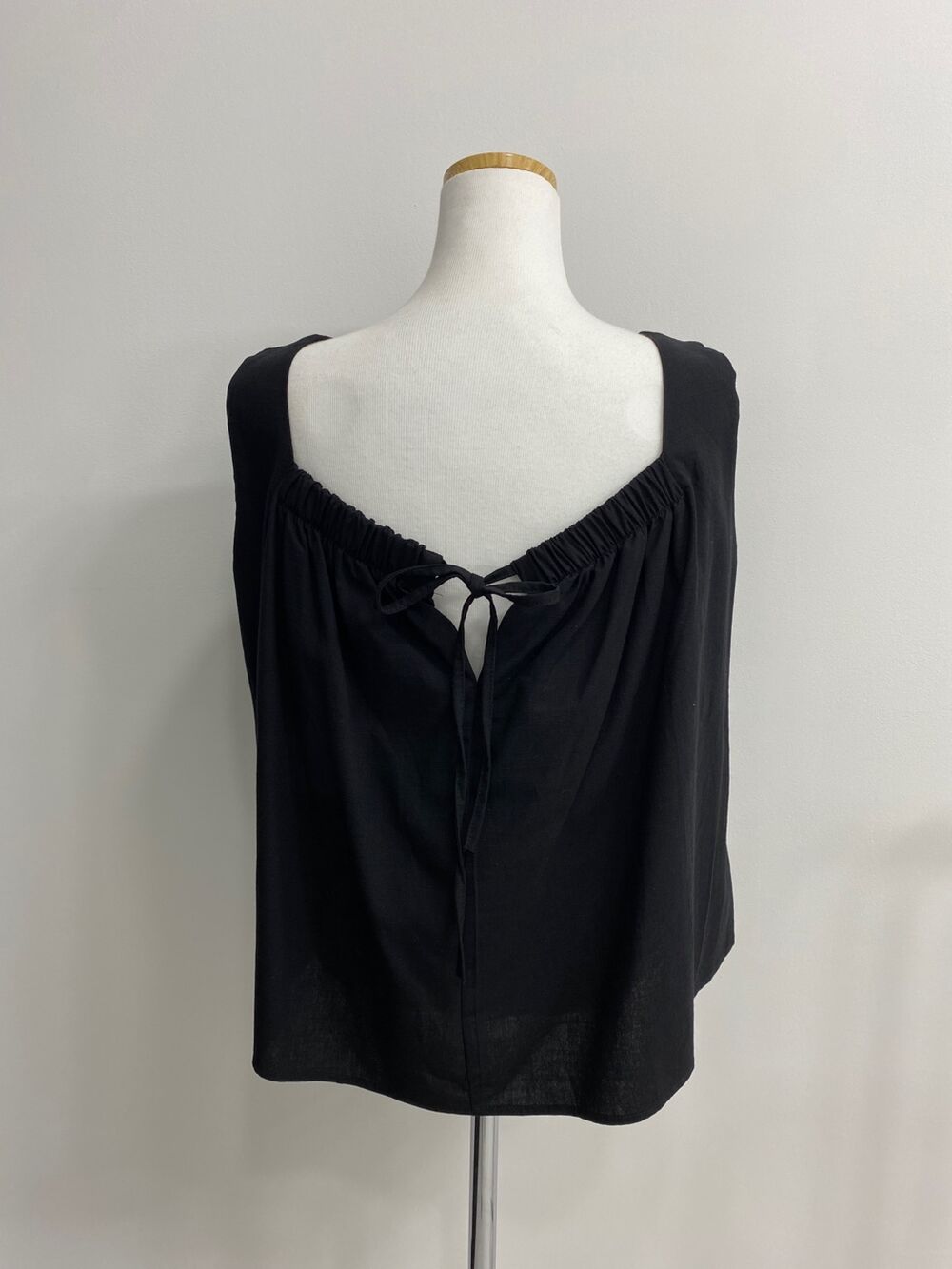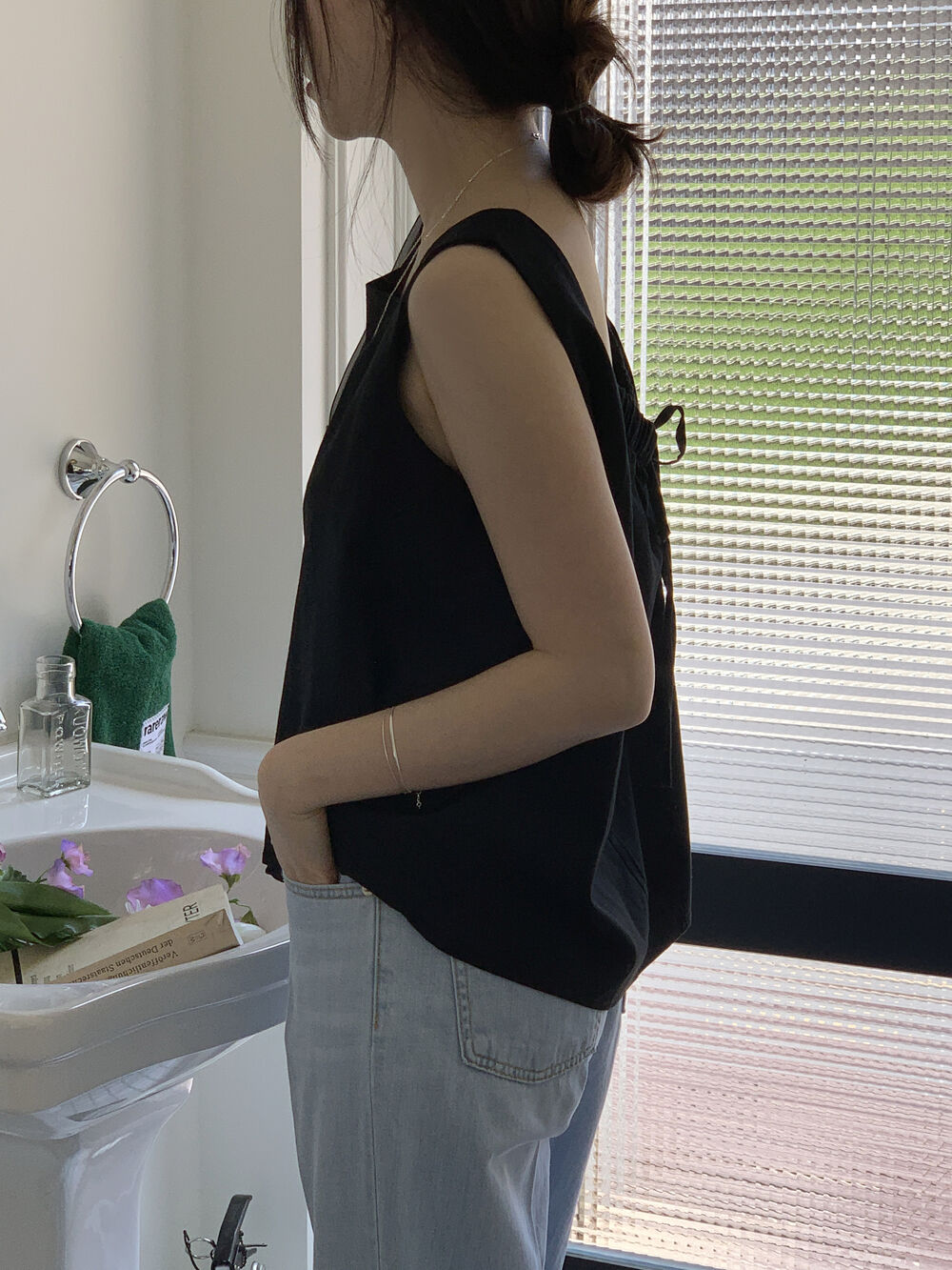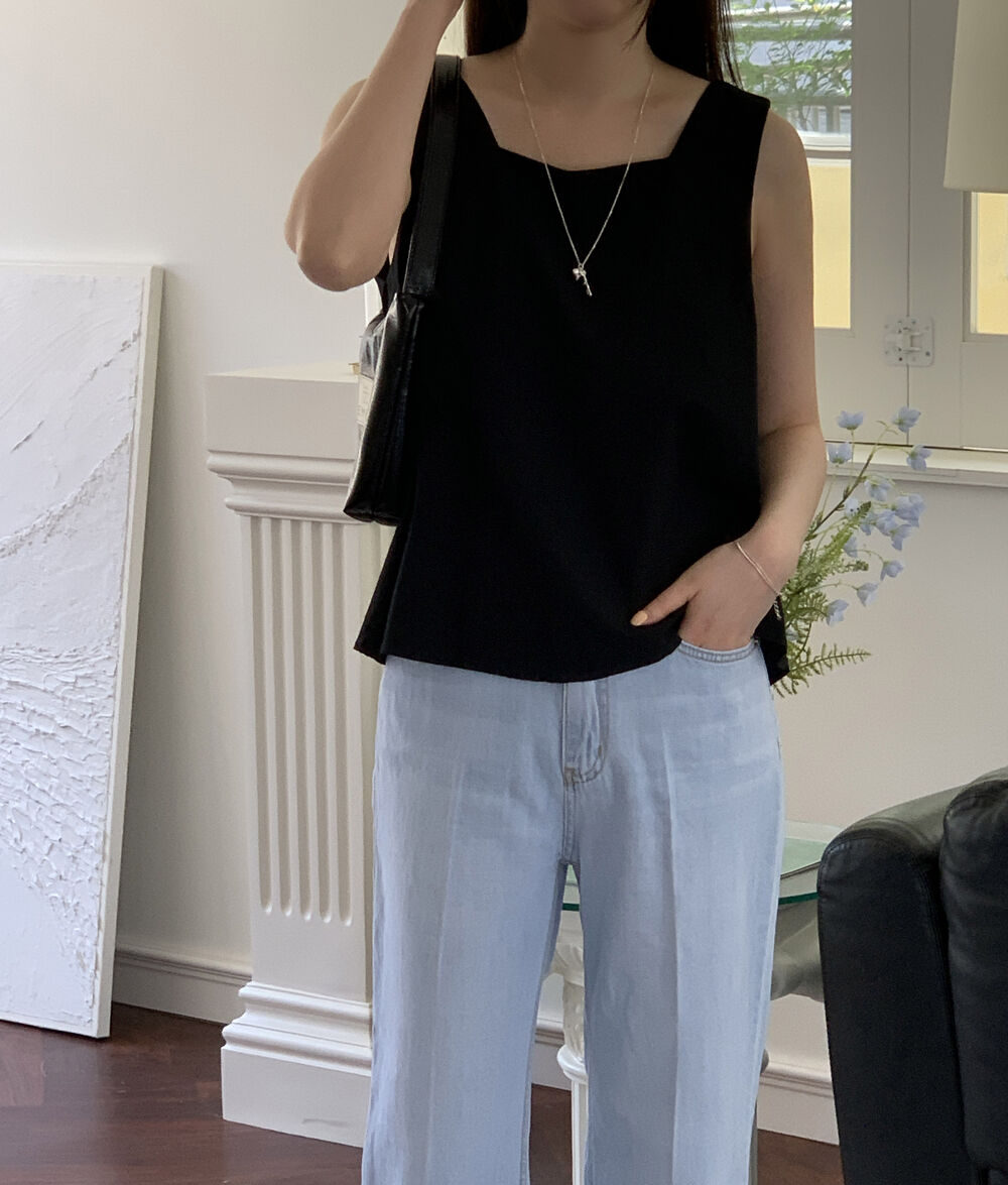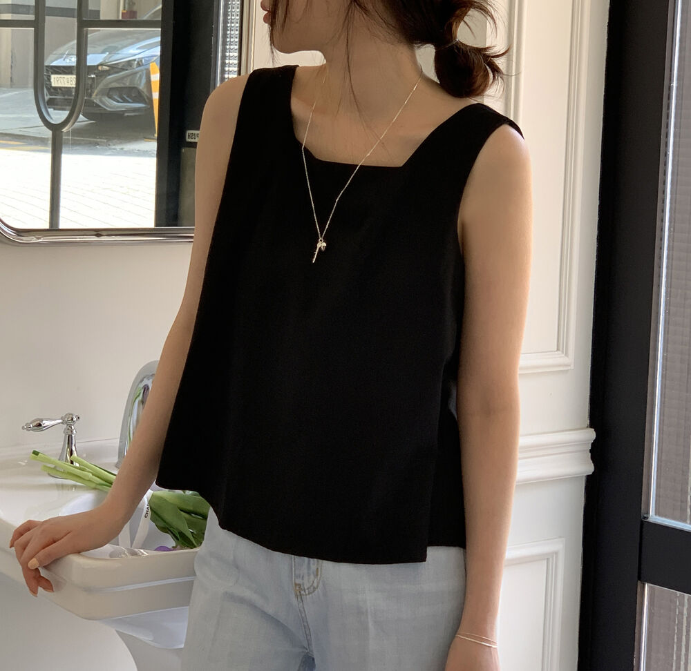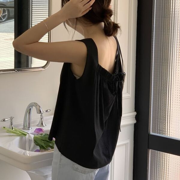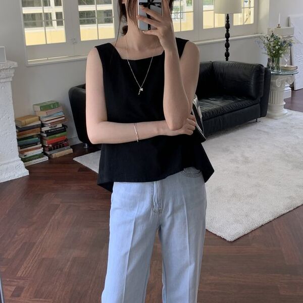 [3color]リネンスクエアバックリボンノースリーブブラウス